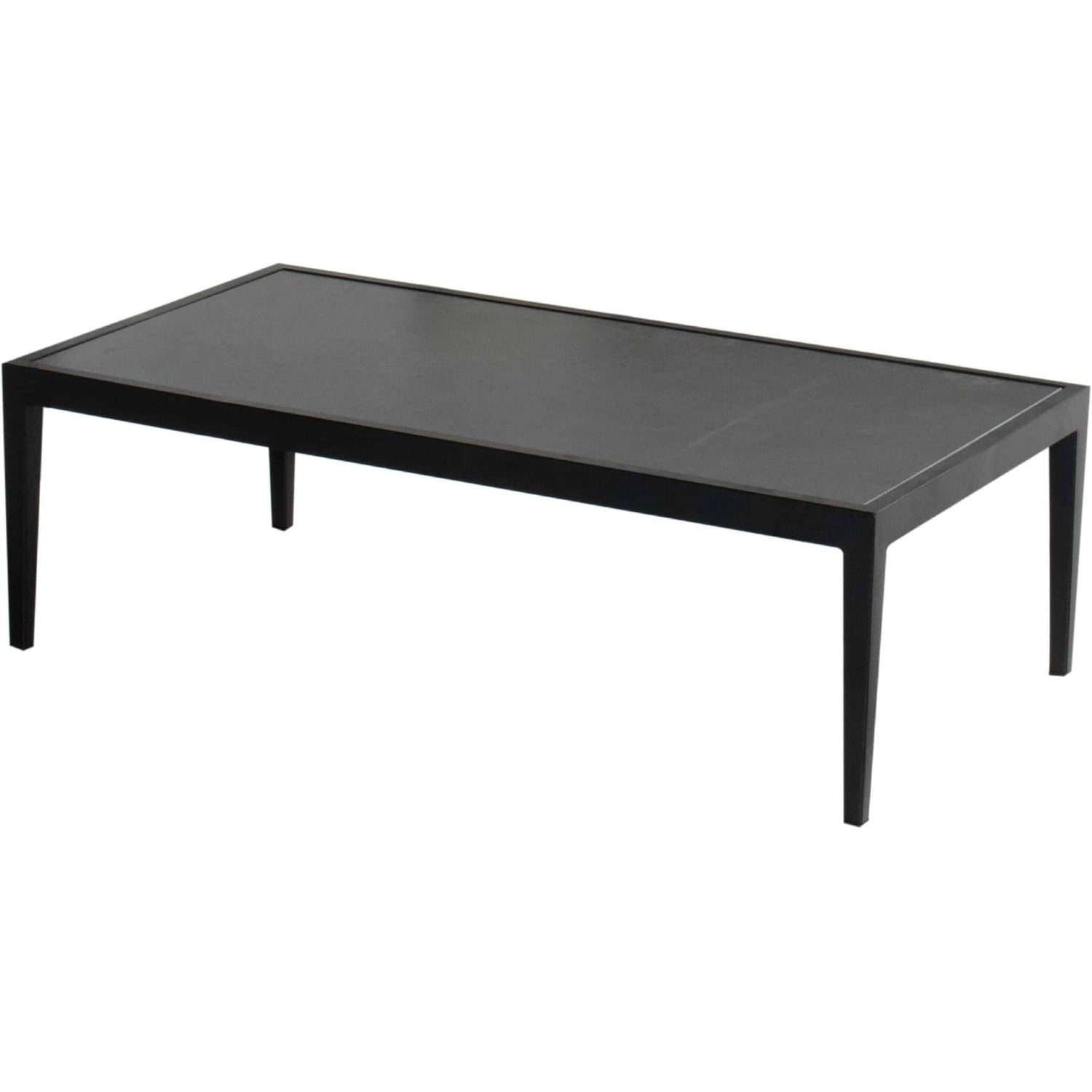 Moderne sofabord i sortlakkert aluminium, bordplate i keramisk flis. Tåler varierte værforhold og er enkelt å rengjøre.