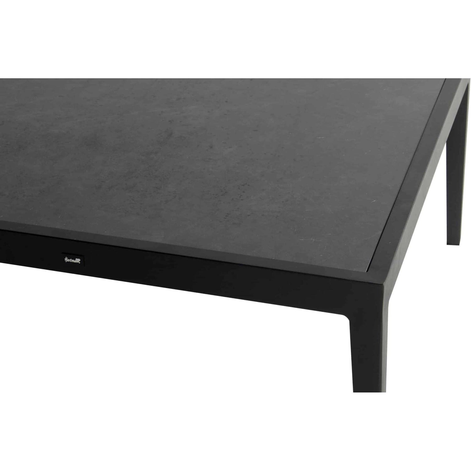 Moderne sofabord i sortlakkert aluminium, bordplate i keramisk flis. Tåler varierte værforhold og er enkelt å rengjøre.