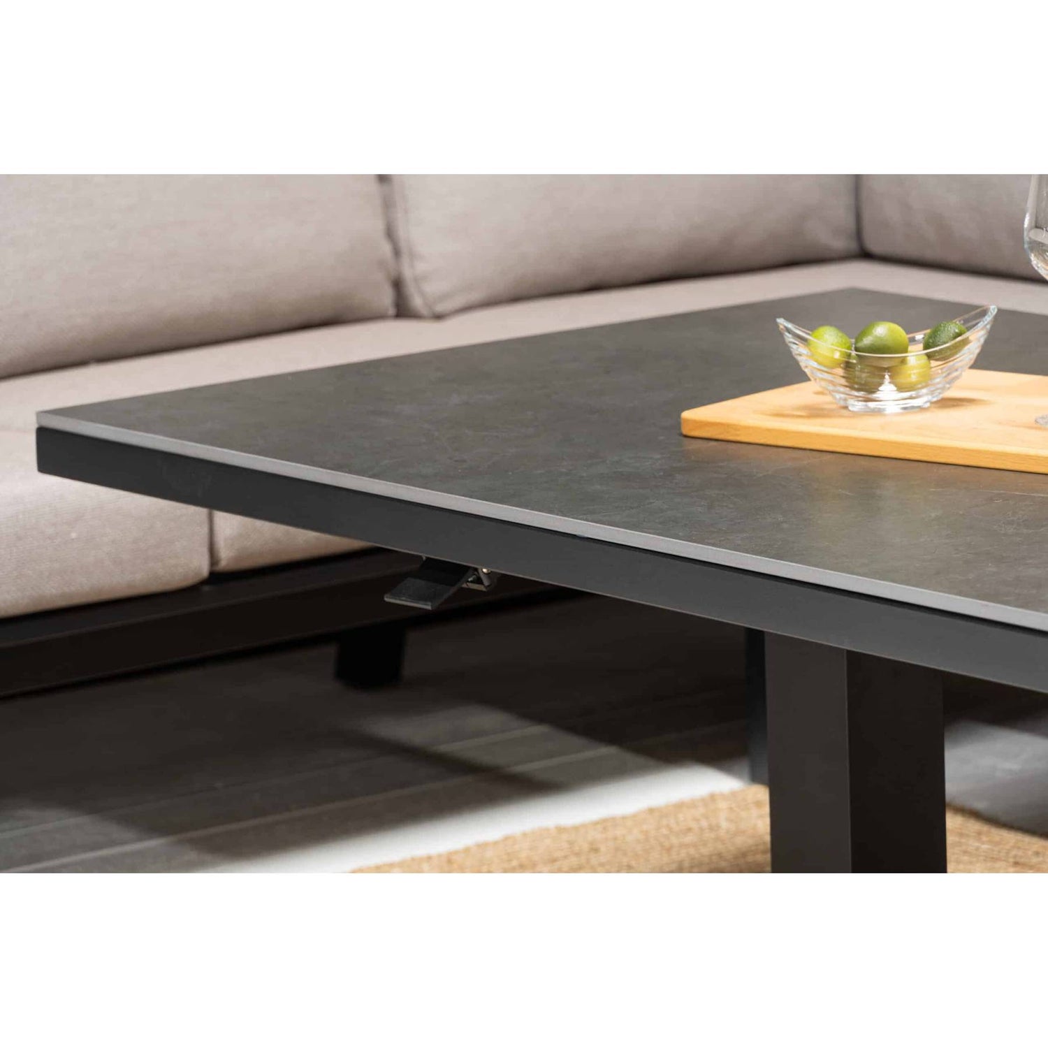 Orlando hev/senk bord er et praktisk høydejusterbart bord for uteplassen. Bordplaten i komposittstein har en melert overflate i en varm gråtone. Høyden kan enkelt justeres trinnløst ved hjelp av en gasspumpe fra 49 til 72cm for å sikre optimal sittestilling. Dette utvider bordets bruksområde ved at det både kan brukes med både lounge- og spisemøbler. Orlando hev/senk bord har pulverlakkert aluminiumsramme i en delikat kremfarge som gir det et moderne uttrykk. Passer godt til Orlando reclinerstol, Orlando hjørnesofa og Orlando fotpall.