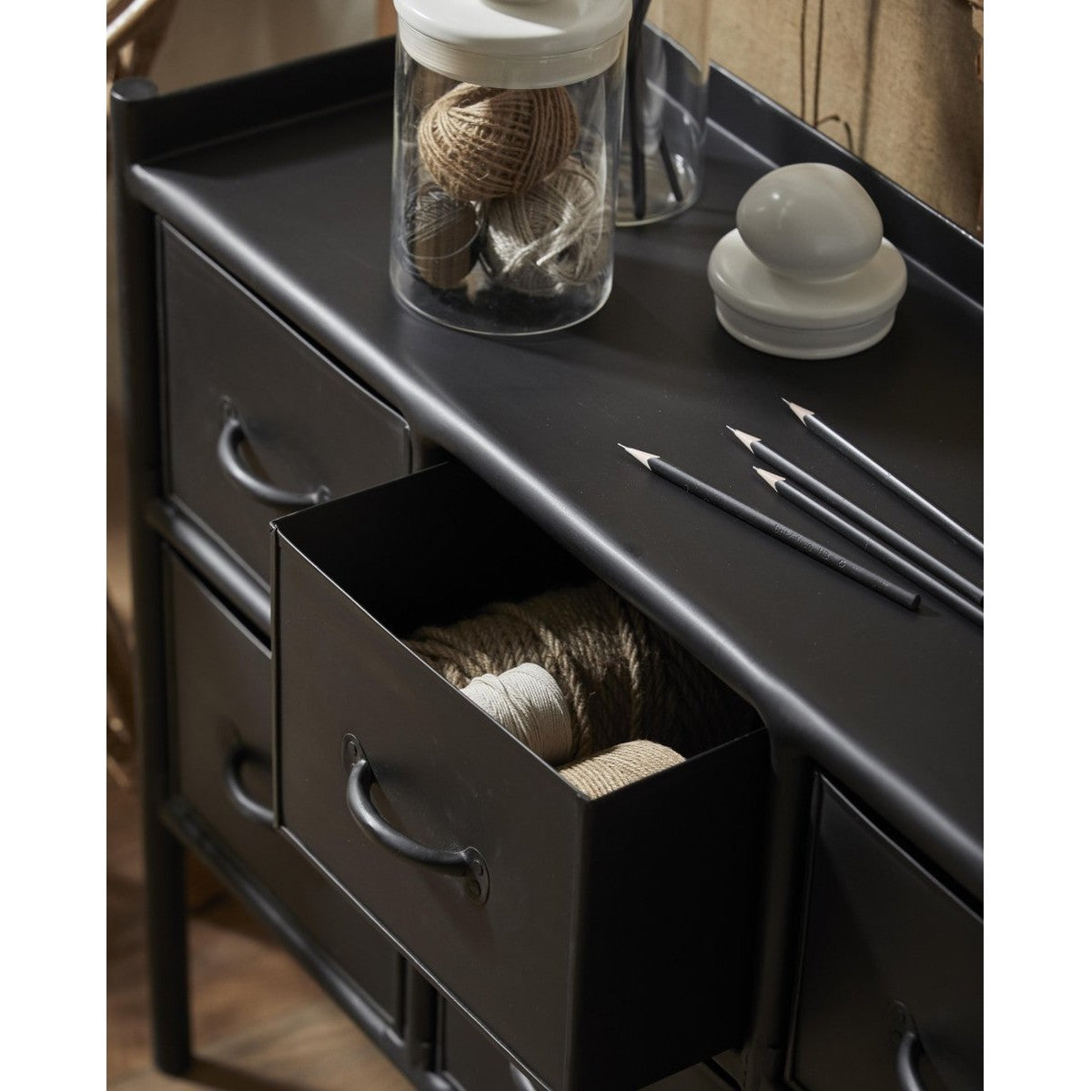 PORTLAND skjenk i jern med 8 skuffer, 66 x 116 cm, farge svart.