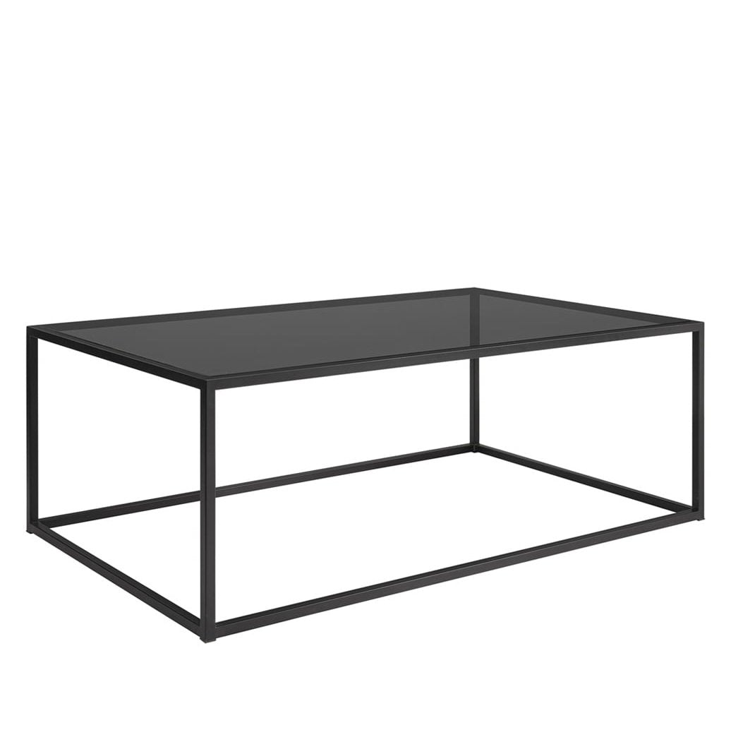 Sofabord i røykgrått glass. Svart jernbase.