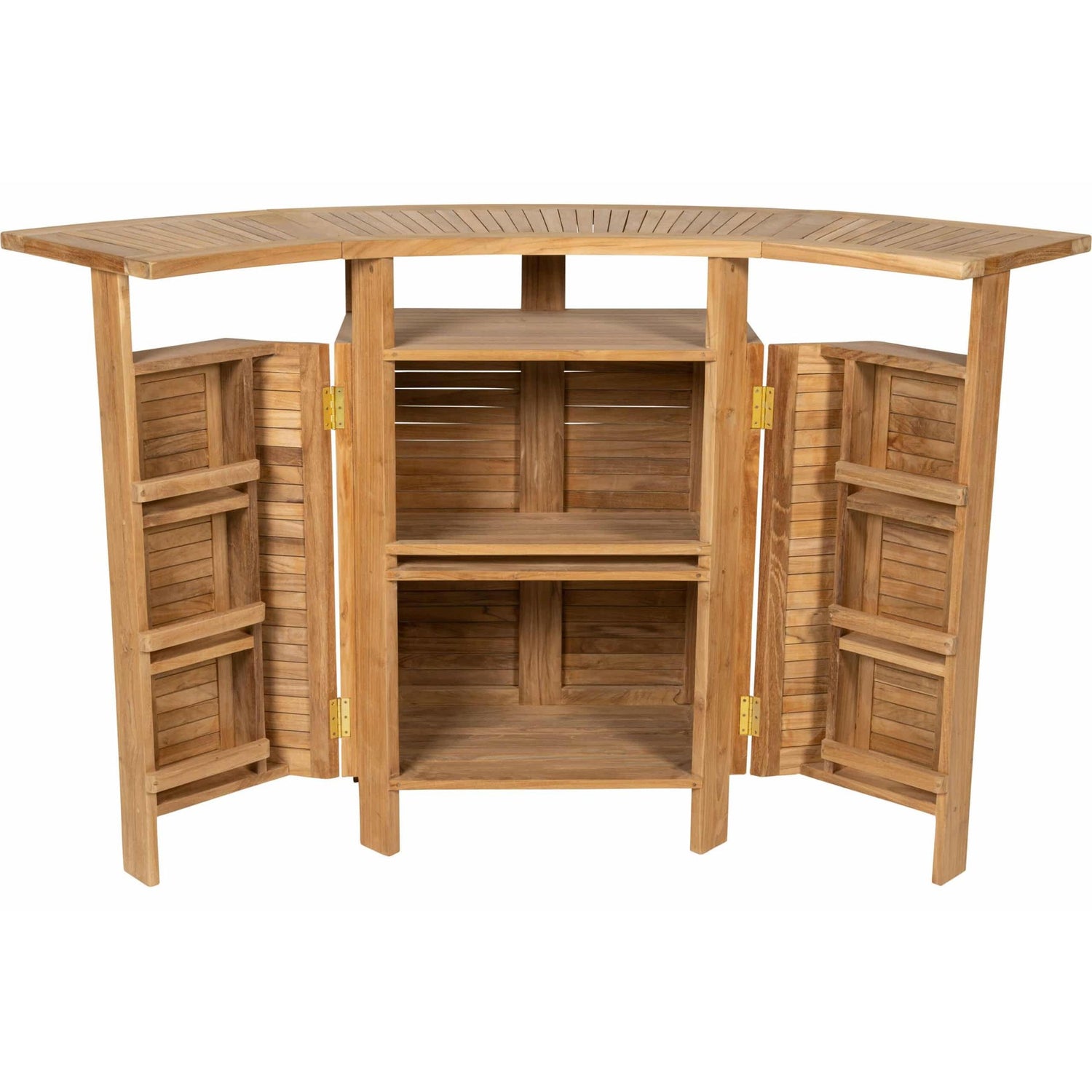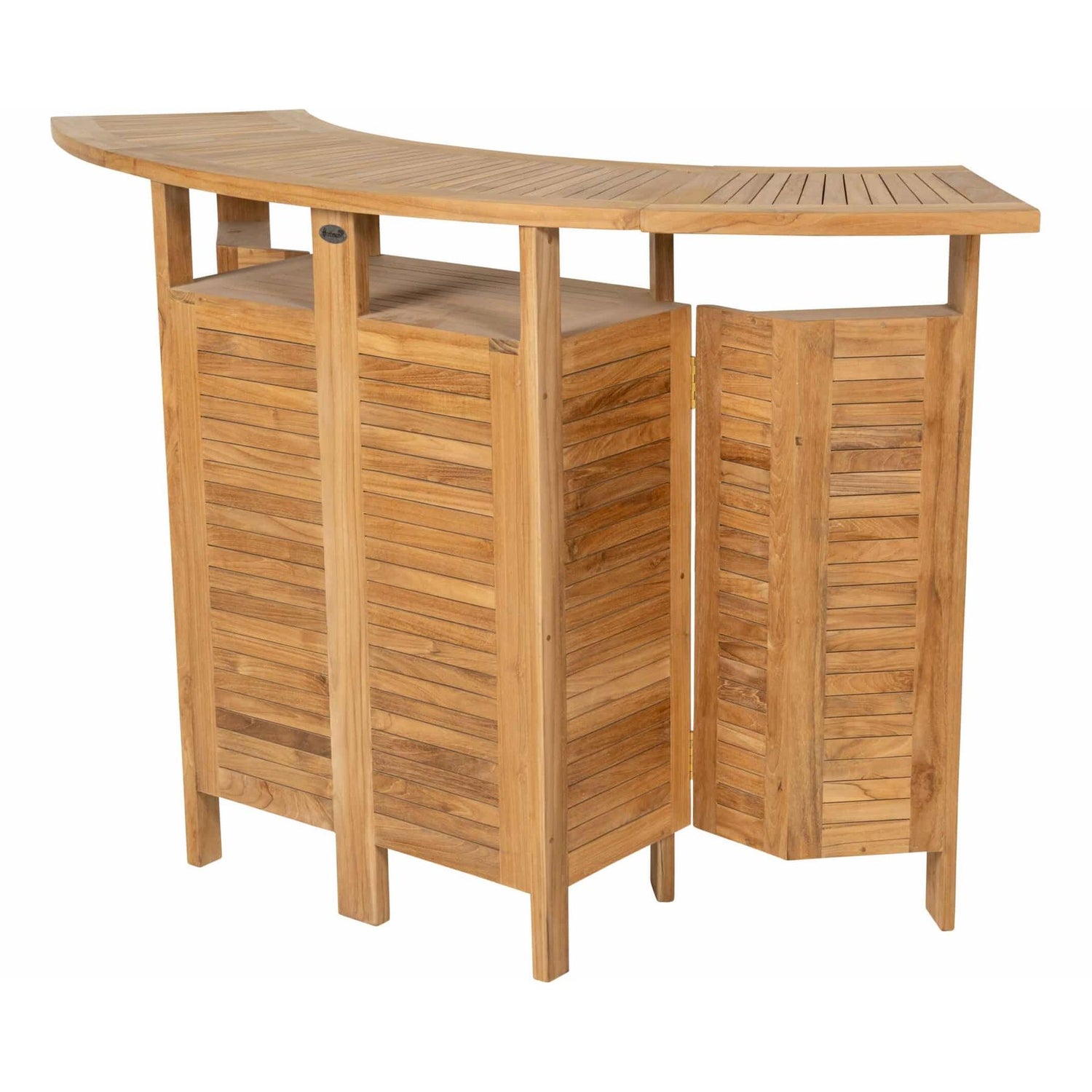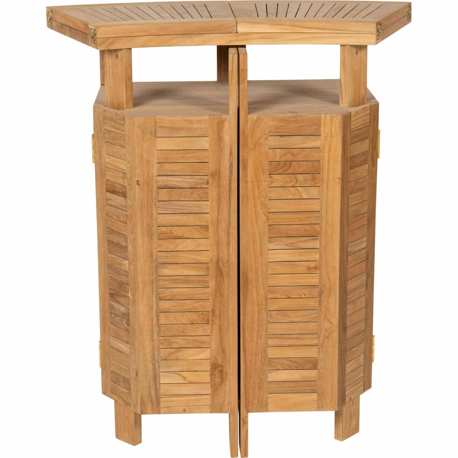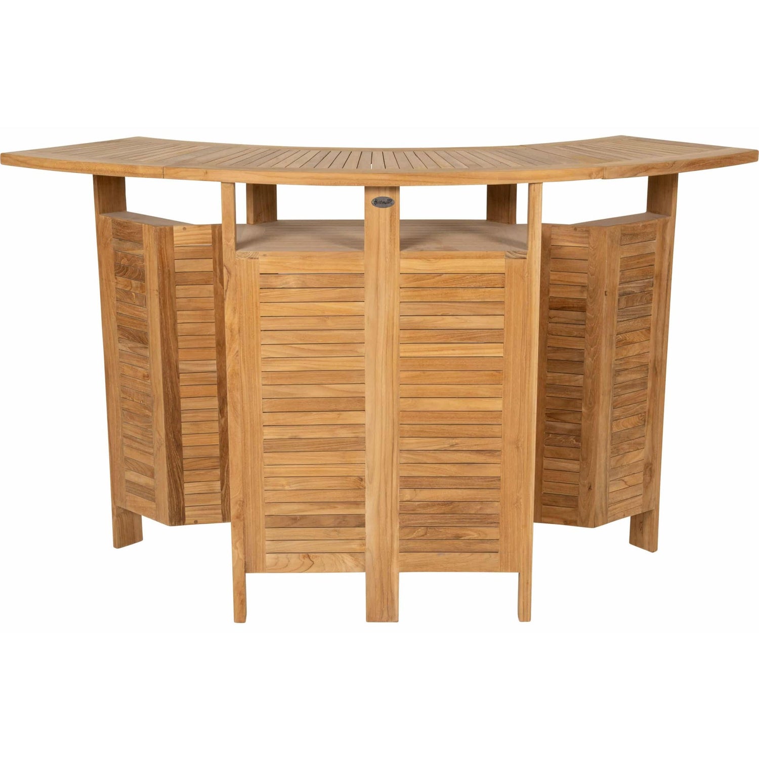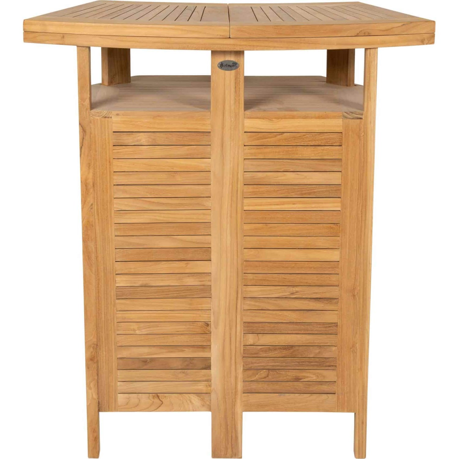 Lekker bardisk i premium teak. Nydelig på terrassen, både hjemme og på hytta. Kan også fint brukes innendørs. Topplaten kan foldes inn slik at disken tar mindre plass når den ikke er i bruk. Utstyrt med praktiske hyller på baksiden.