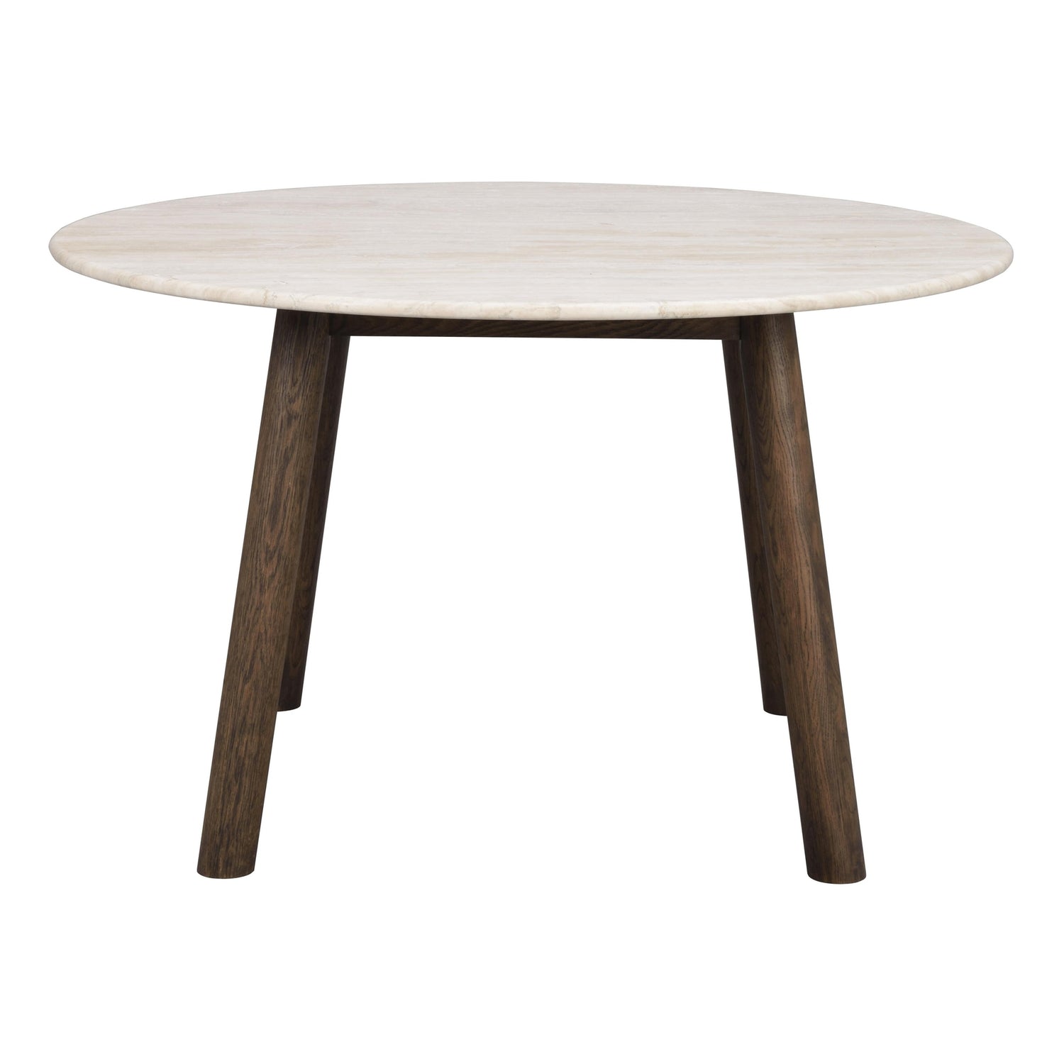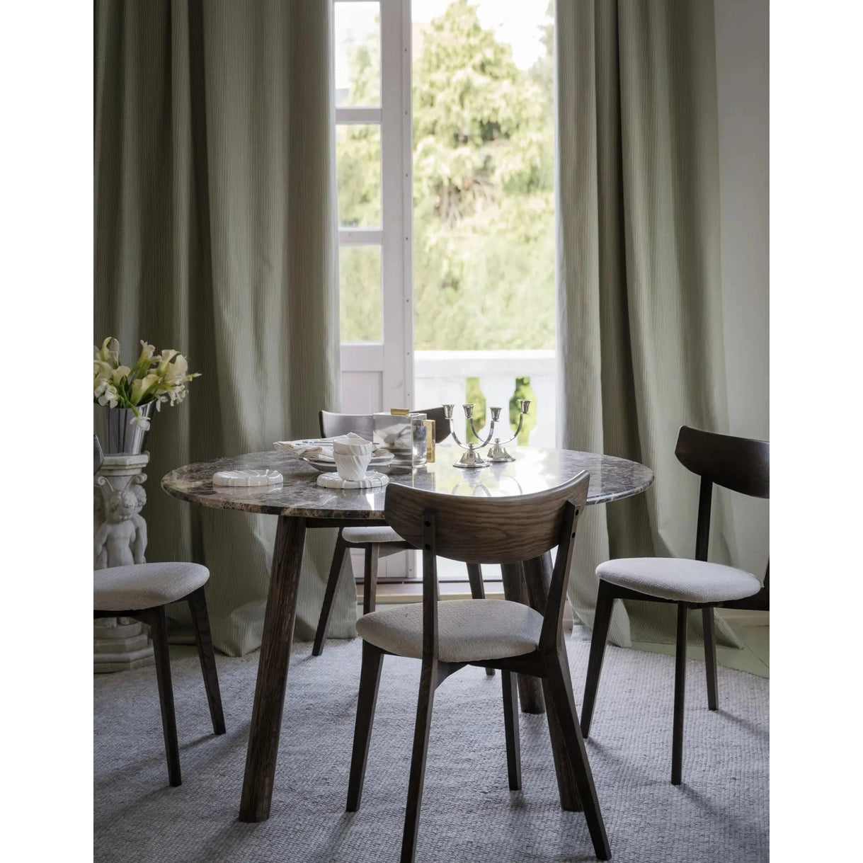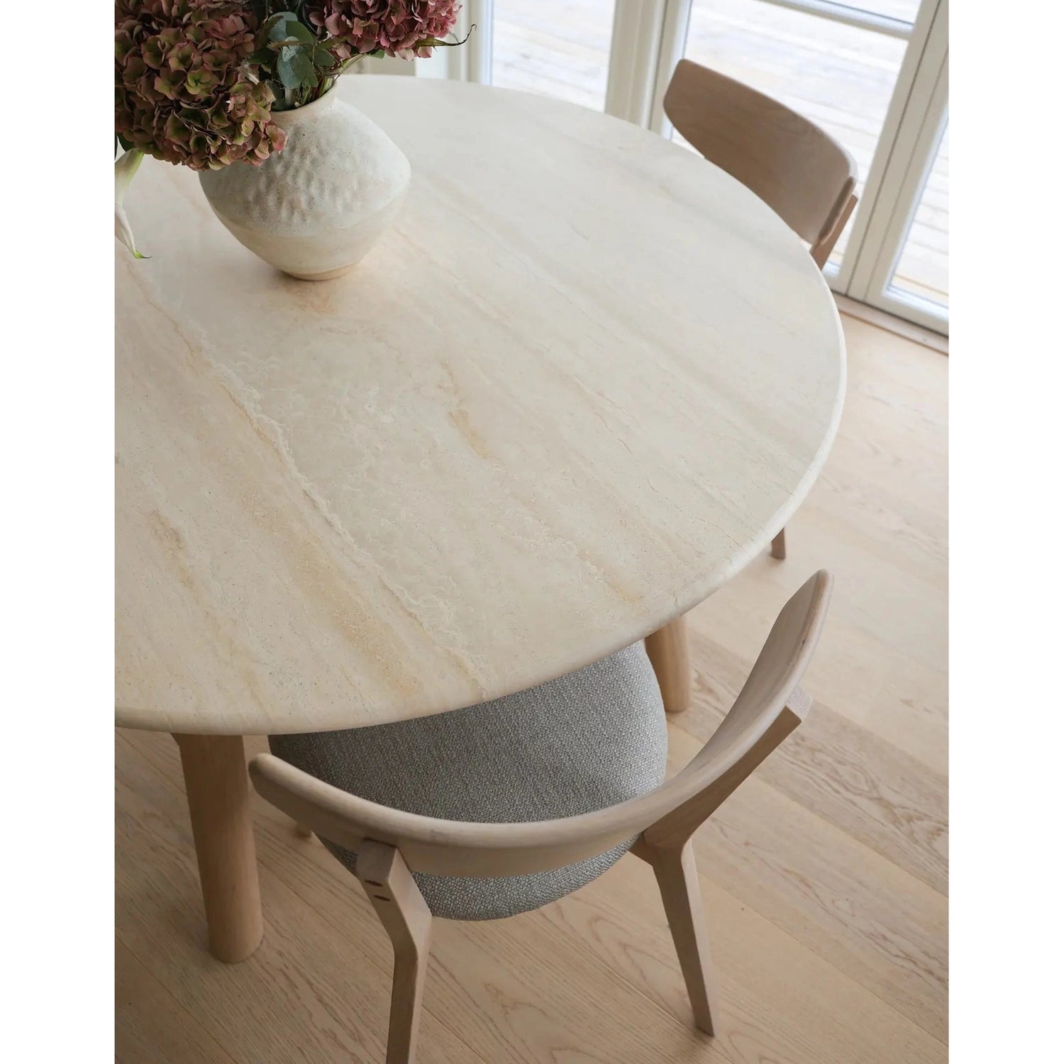 Oppdag den luksuriøse Taransay spisebordet, som er designet for å gi et eksklusivt preg til ditt hjem. Dette bordet har en imponerende steinplate laget av travertin fra Italia, kombinert med solide ben av brunt lakkert FSC-sertifisert eik. Travertin er en type kalkstein med en levende tekstur som gir bordet en naturlig skjønnhet, og over tid utvikler det en unik patina – noe som gjør at du kan oppdage nye detaljer i bordplaten hver dag.