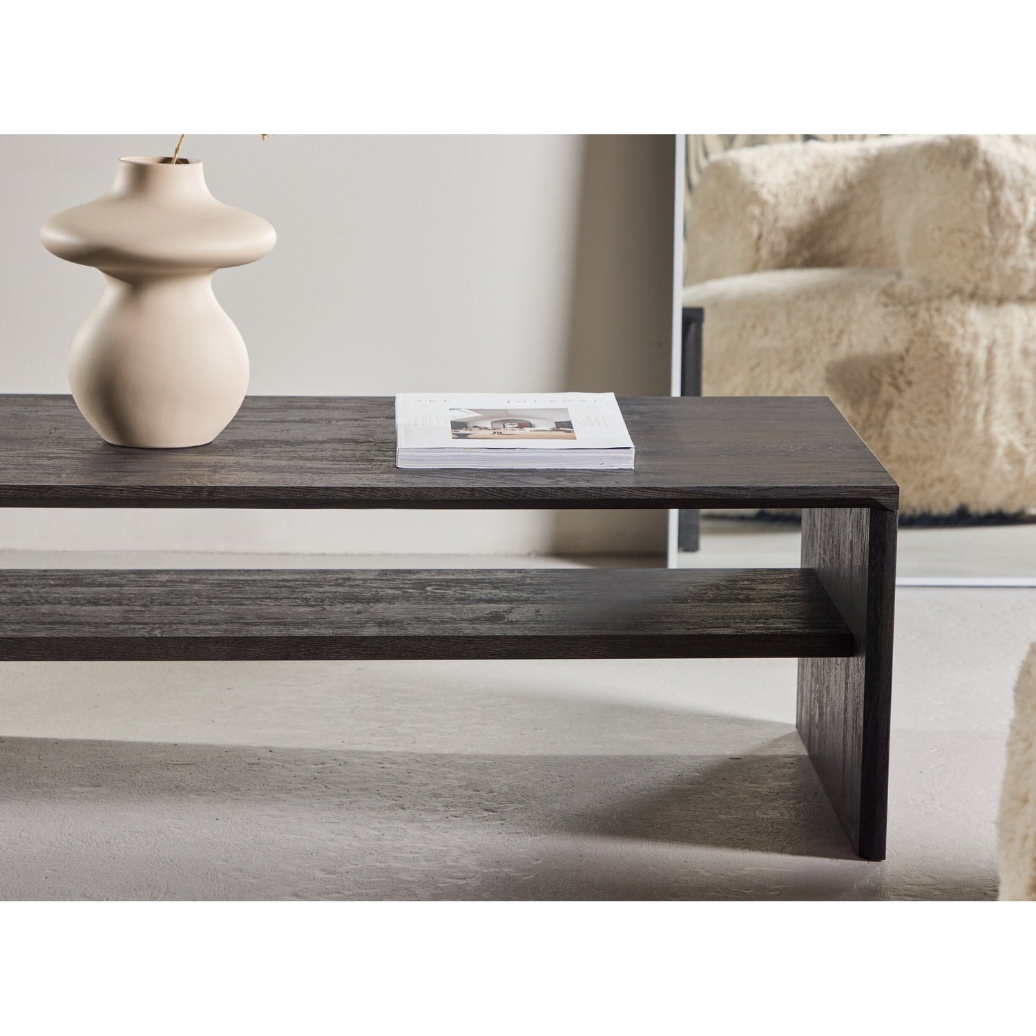 Bordet har en elegant overflate som gir et sofistikert og tidsriktig preg. Under bordplaten finner du en integrert hylle, perfekt for oppbevaring av bøker, magasiner eller fjernkontroller, samtidig som overflaten holdes ryddig.