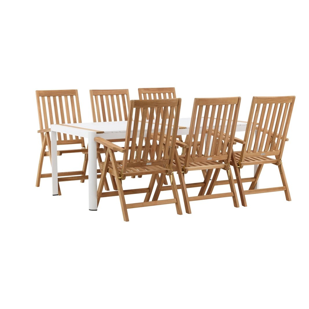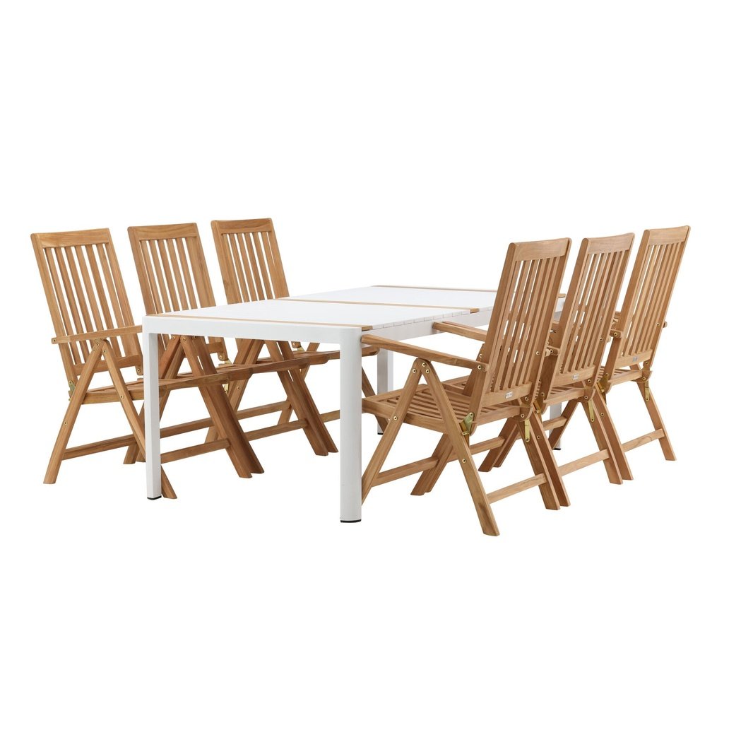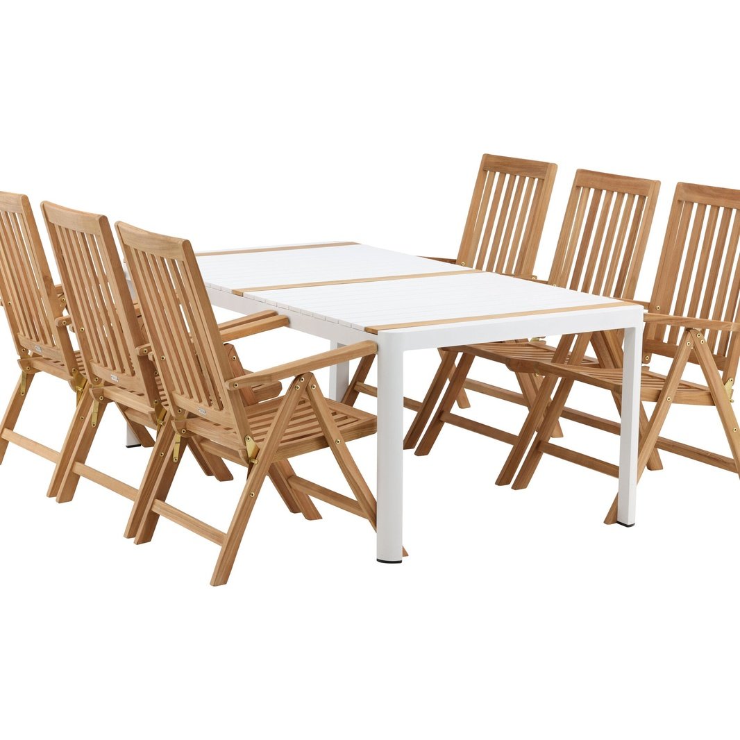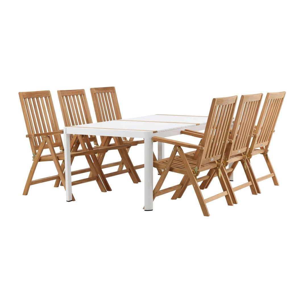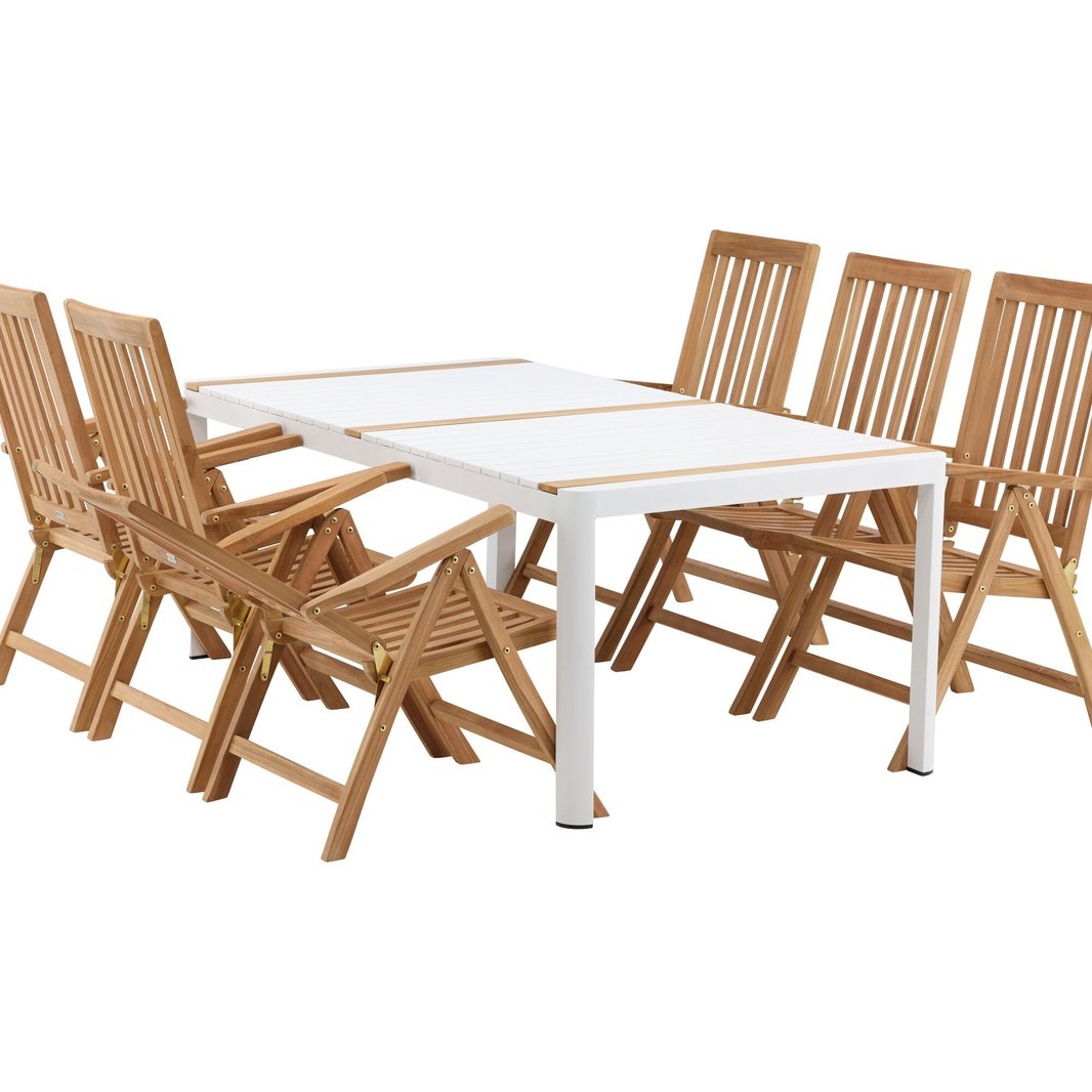 Opprett en blikkfang som imponerer - denne matvaregruppen er like iøynefallende som holdbar! Spisebordet Togo har en smakfull versjon med en rektangulær bordplate i hvitt og tre-farget teak og en hvit aluminiumsunderstell. Dimensjoner: 2x1 cm. De deilige teakdetaljene i bordplaten gjør at bordet passer perfekt sammen med spisestolene fra Kenya-serien. Stolene er både sammenleggbare og sammenleggbare og har armlener for ekstra komfort. Laget av smakfull teak i et rillet design som gir et veldig moderne inntrykk. La tiden her være dagens høydepunkt!