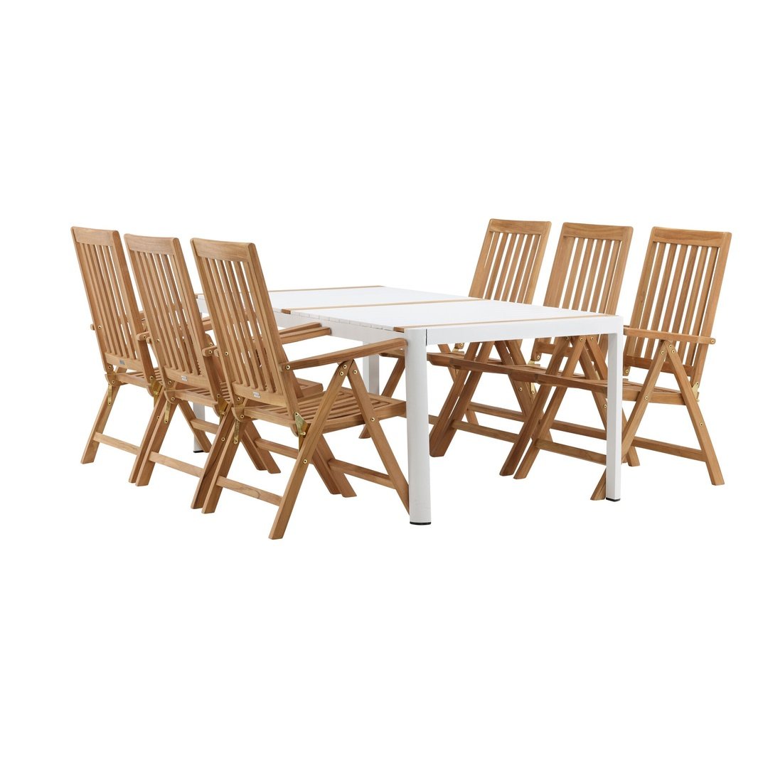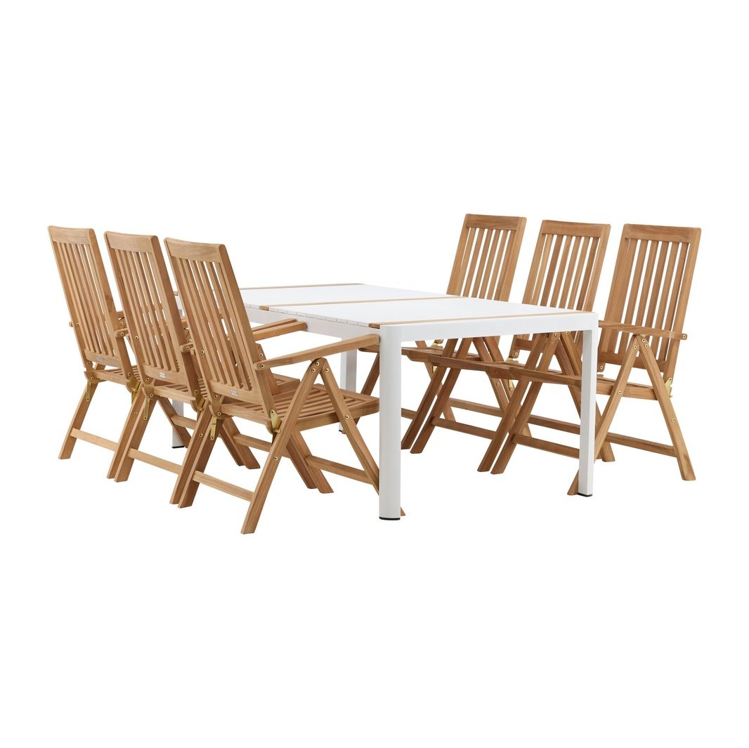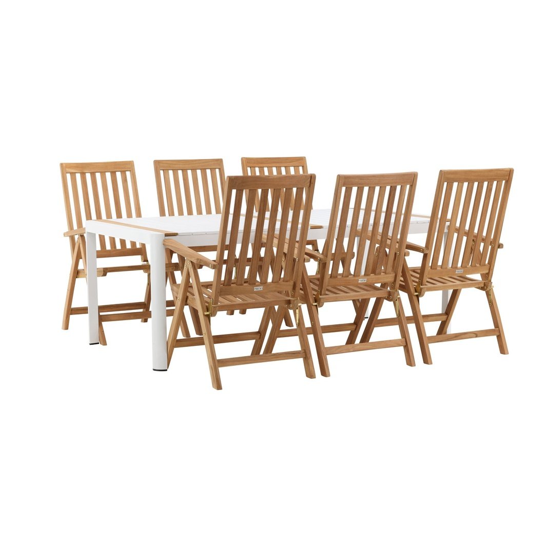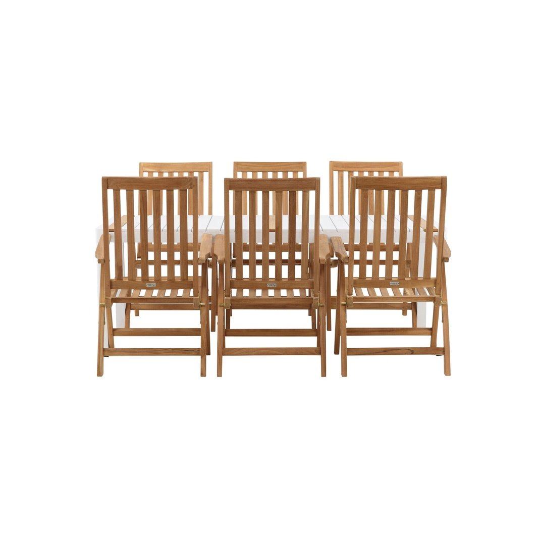 Opprett en blikkfang som imponerer - denne matvaregruppen er like iøynefallende som holdbar! Spisebordet Togo har en smakfull versjon med en rektangulær bordplate i hvitt og tre-farget teak og en hvit aluminiumsunderstell. Dimensjoner: 2x1 cm. De deilige teakdetaljene i bordplaten gjør at bordet passer perfekt sammen med spisestolene fra Kenya-serien. Stolene er både sammenleggbare og sammenleggbare og har armlener for ekstra komfort. Laget av smakfull teak i et rillet design som gir et veldig moderne inntrykk. La tiden her være dagens høydepunkt!