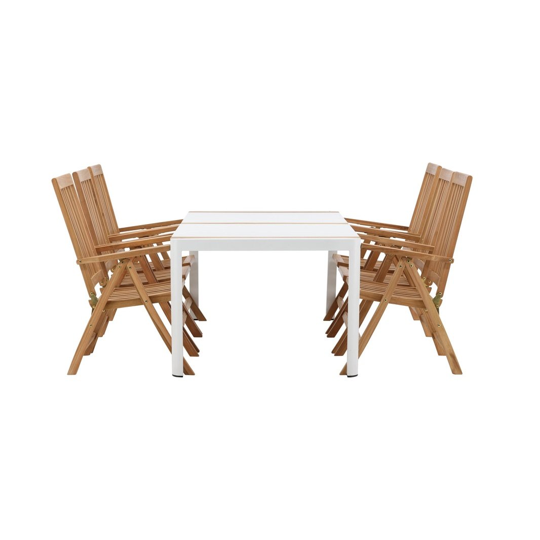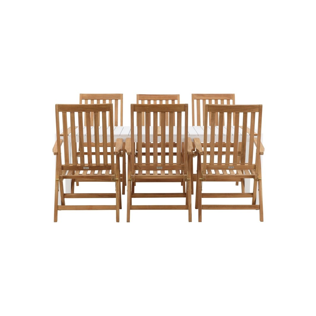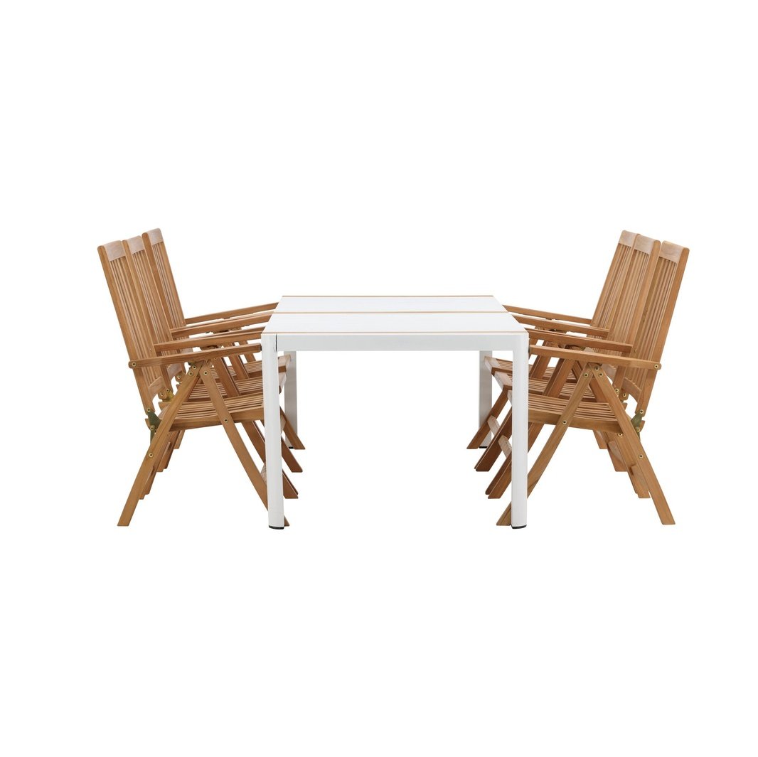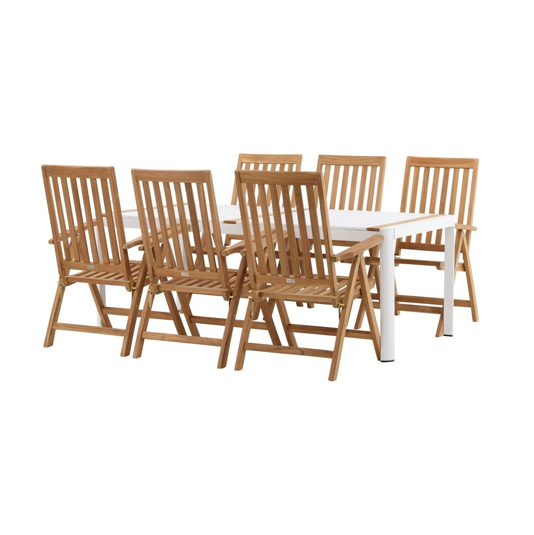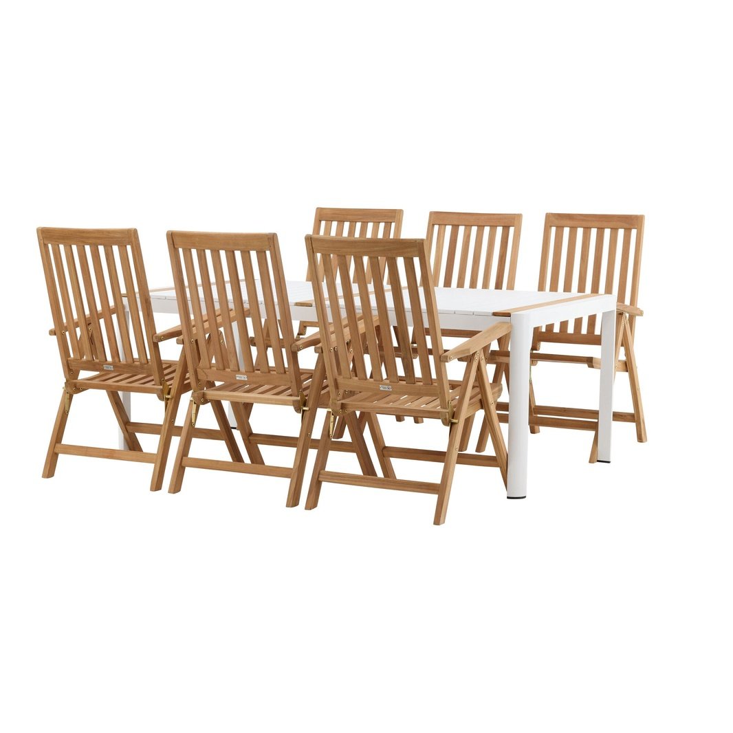 Opprett en blikkfang som imponerer - denne matvaregruppen er like iøynefallende som holdbar! Spisebordet Togo har en smakfull versjon med en rektangulær bordplate i hvitt og tre-farget teak og en hvit aluminiumsunderstell. Dimensjoner: 2x1 cm. De deilige teakdetaljene i bordplaten gjør at bordet passer perfekt sammen med spisestolene fra Kenya-serien. Stolene er både sammenleggbare og sammenleggbare og har armlener for ekstra komfort. Laget av smakfull teak i et rillet design som gir et veldig moderne inntrykk. La tiden her være dagens høydepunkt!
