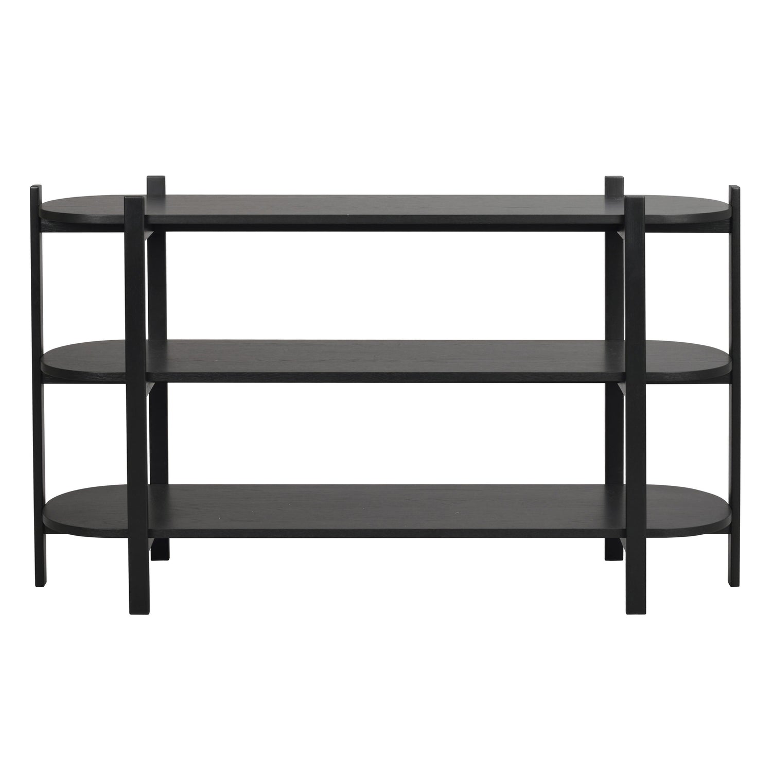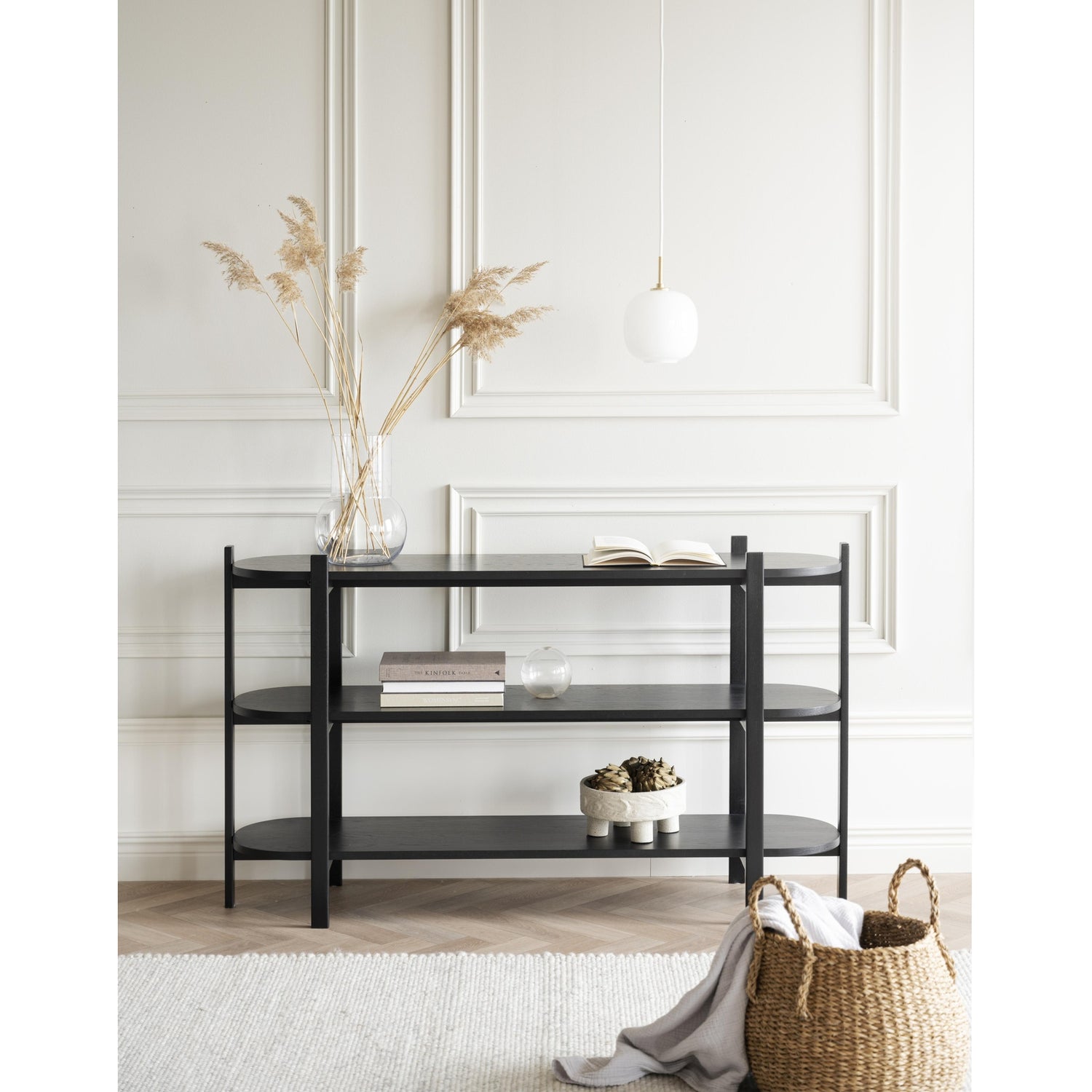 Materiale: Massiv eik i ben og forkant. MDF med eikefiner i hyllene.