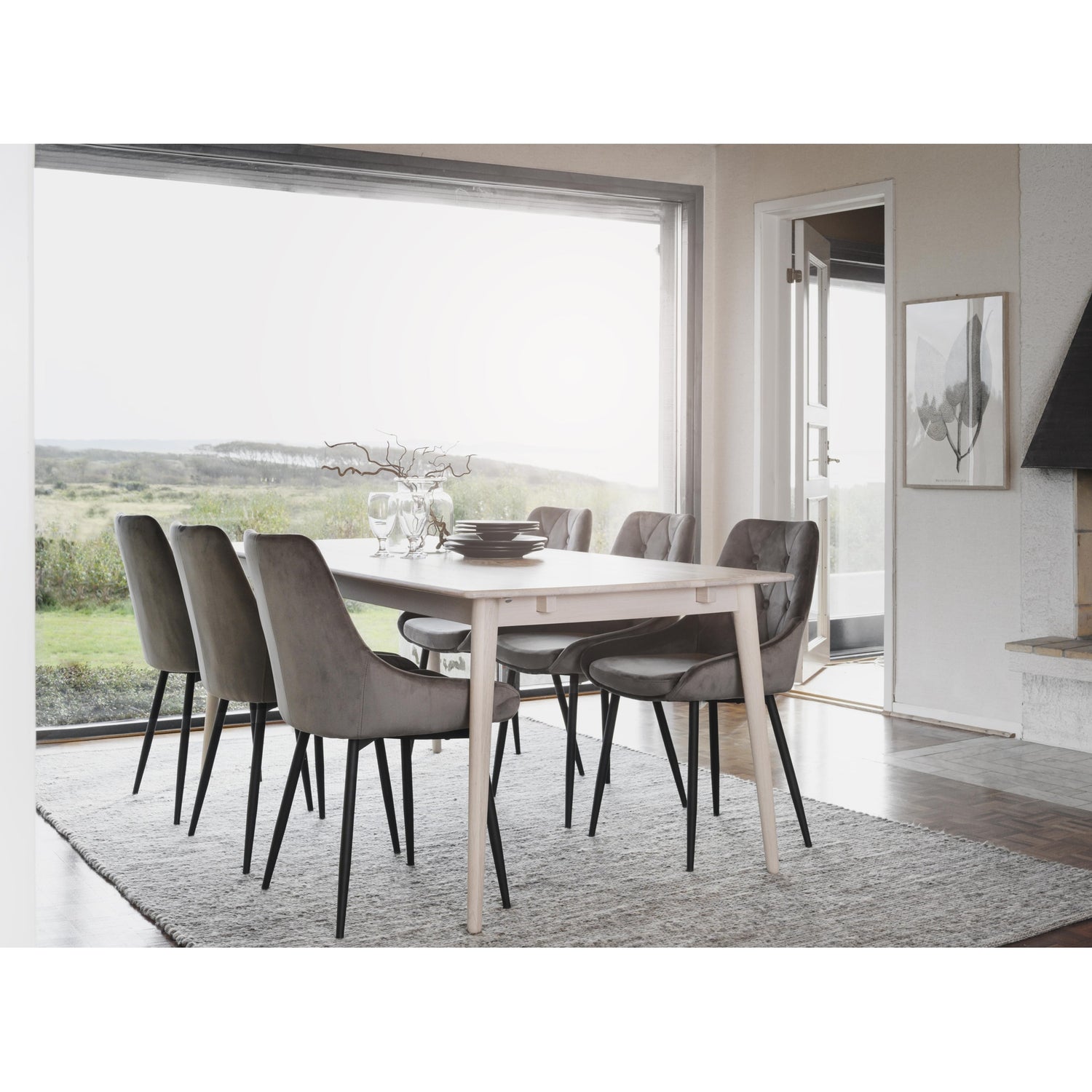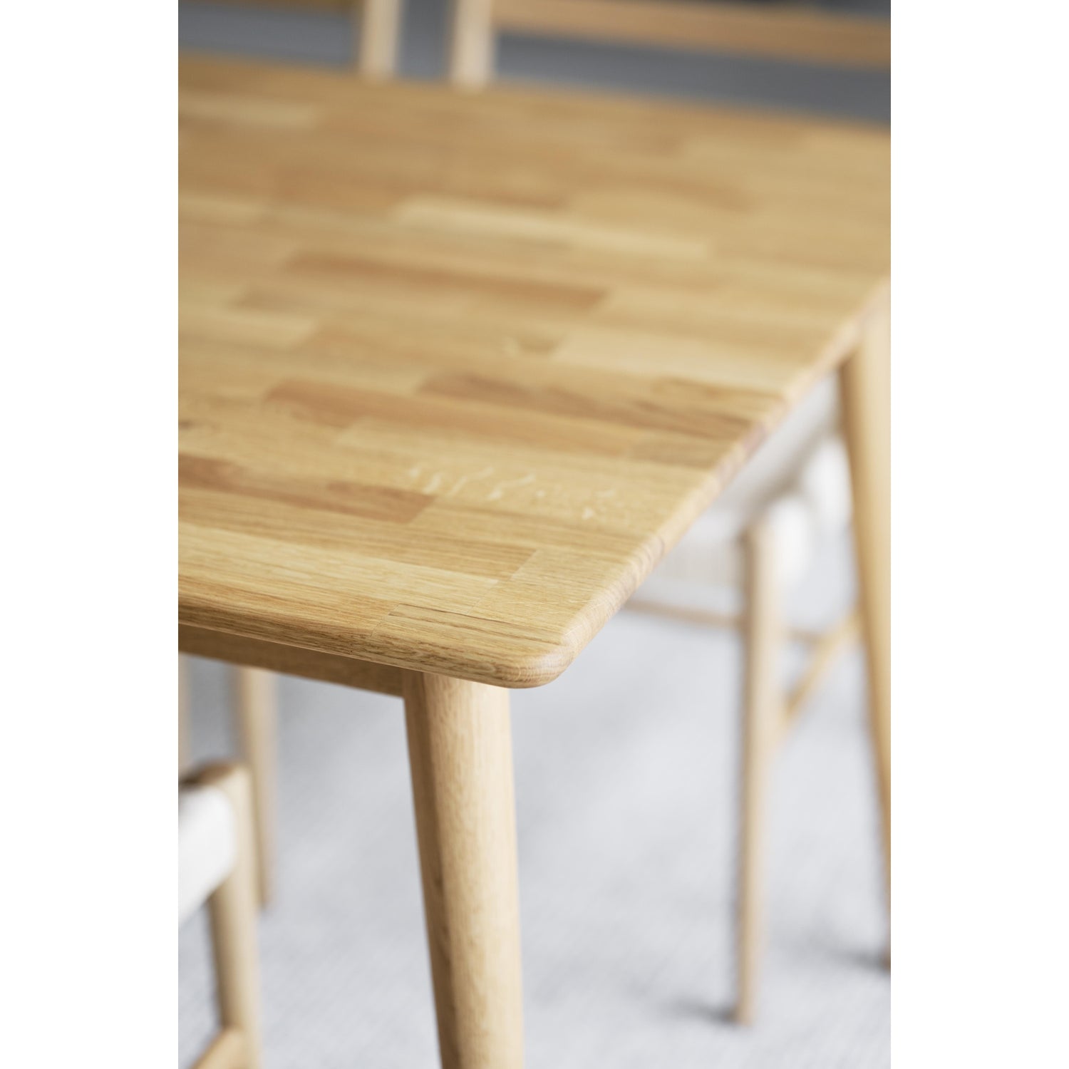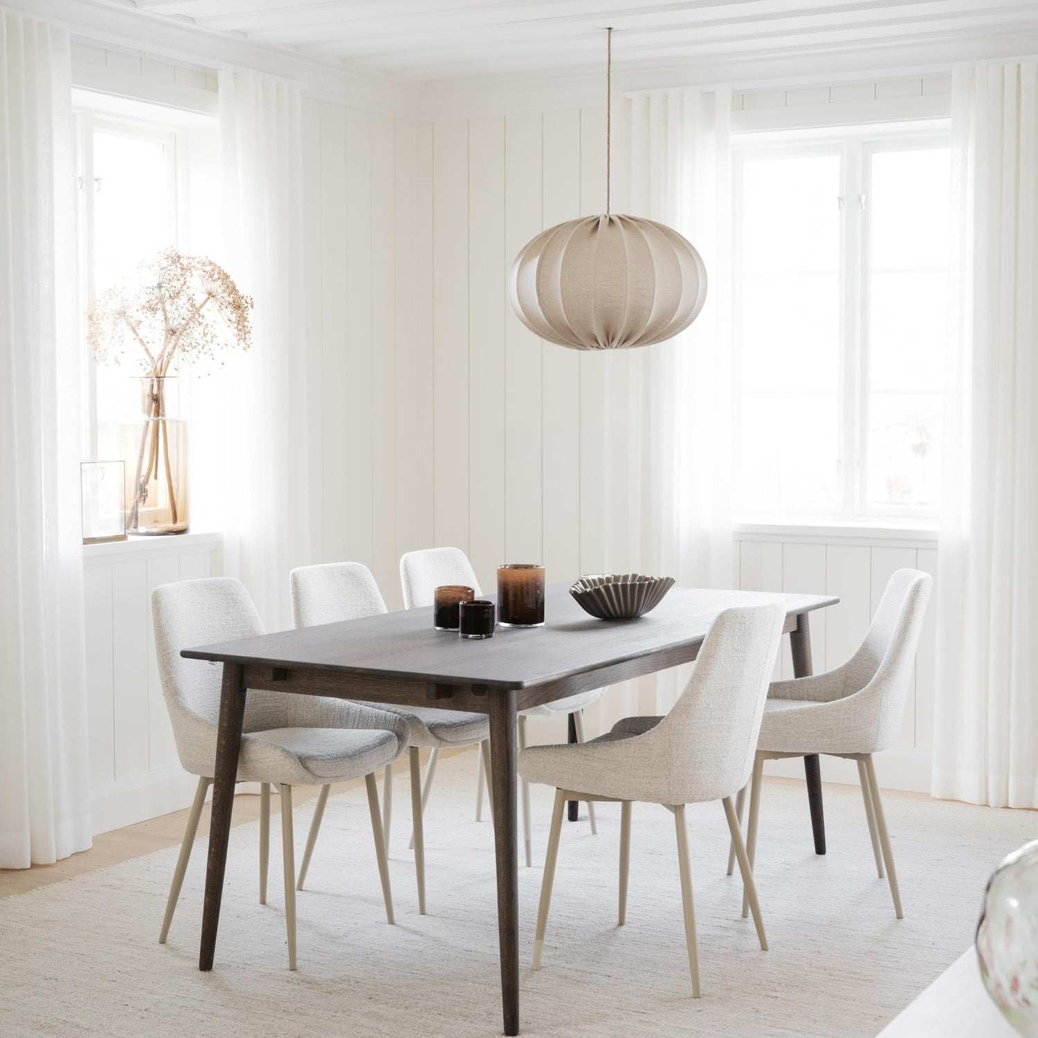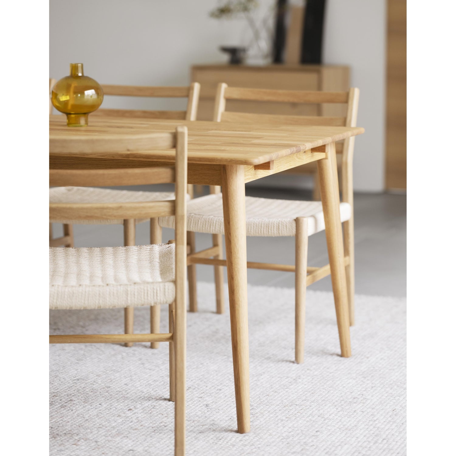 Tyler dining table 180 brown oakTyler spisebord i skandinavisk design er laget av solid brun eik i 100 % FSC®-sertifisert treverk. Dette stilrene spisebordet kombinerer naturlig kvalitet med tidløs eleganse, og passer perfekt inn i både moderne og klassiske hjem. Bordet kan enkelt utvides med to ileggsplater og bli hele 280 cm langt, noe som gjør det ideelt til store middager, familiesamlinger og festlige anledninger.