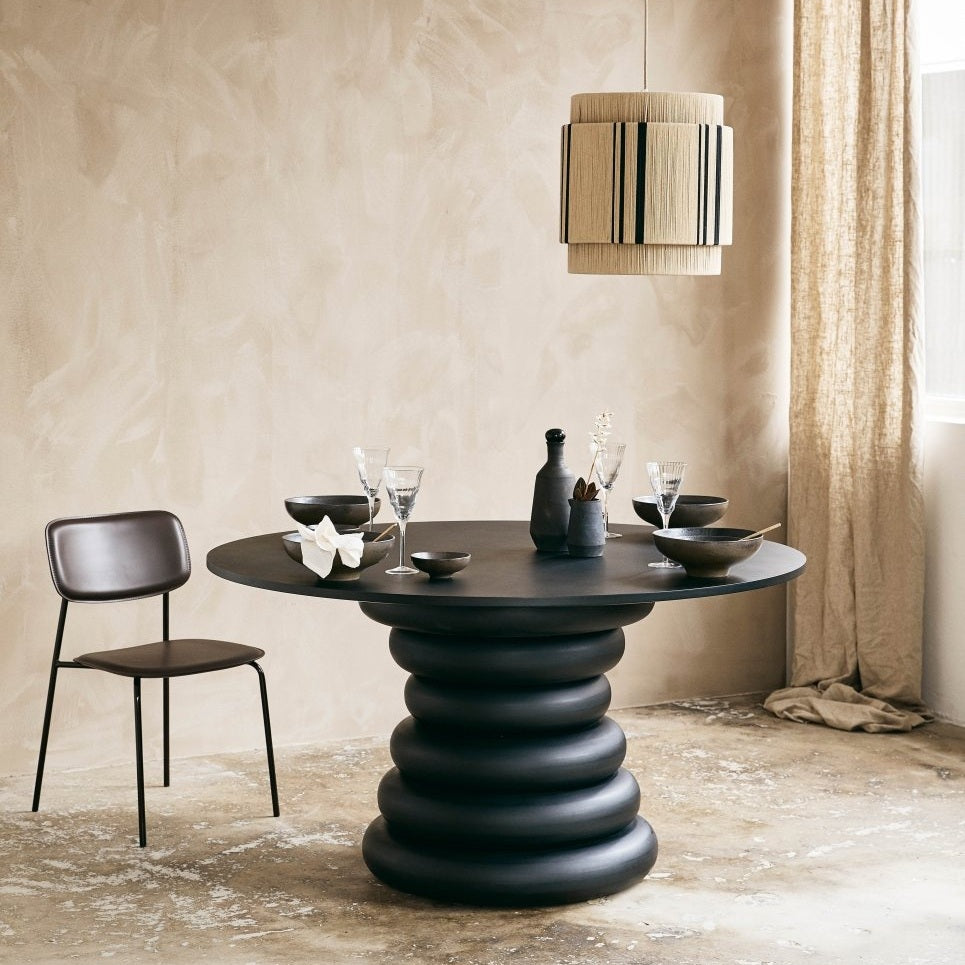 YALU spisebord med en sort lakkert overflate. Et moderne og karakteristisk spisebord, som med sitt voluminøse uttrykk gir kant og karakter til ethvert hjem. YALU er et robust og tidløst spisebord, som både er praktisk men også vil inngå som et dekorativt element i innredningen. Med sine rene linjer, elegante formspråk og mørke farge vil YALU være et statement, samtidig som det skaper en varm og innbydende atmosfære.
