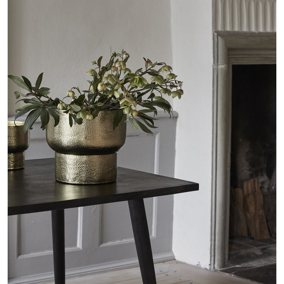 Urtepotte laget av gyldent hamret aluminium, som gir den et eksklusivt utseende. En dekorativ urtepotte som bringer liv og personlighet til innredningen, enten med grønne planter, blomster eller til oppbevaring av diverse ting.