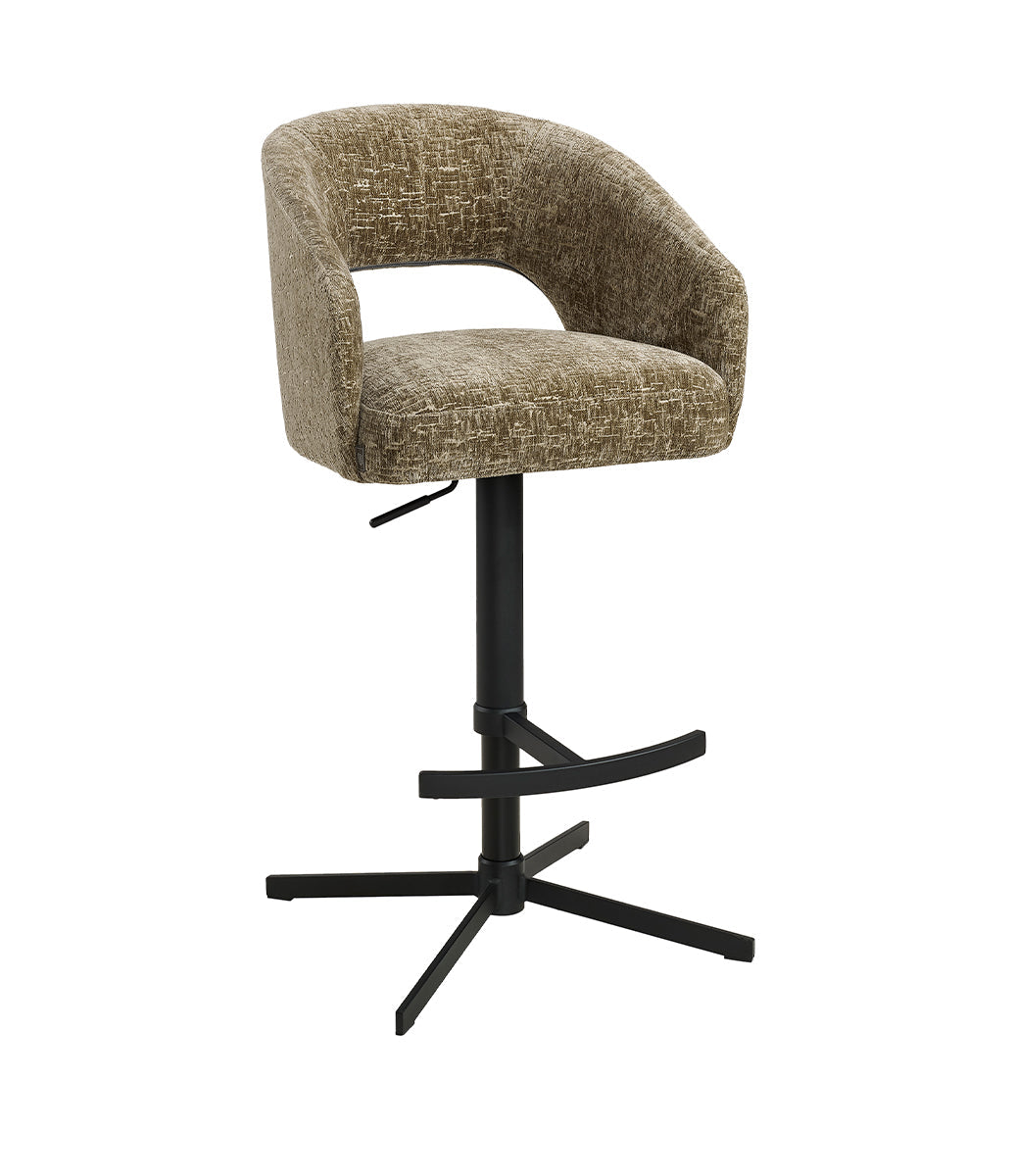 Denne elegante barstolen kombinerer funksjonalitet og design perfekt. Med en mykt polstret sitteflate i slitesterkt tekstil, gir den en behagelig opplevelse. Stolen har avrundet ryggstø for ekstra komfort og støtte, ideell for lange måltider eller sosiale stunder. Den solide metallrammen gir stabilitet, og den høyderegulerbare funksjonen gjør tilpasning enkel. Perfekt for moderne hjem og trendy barer.