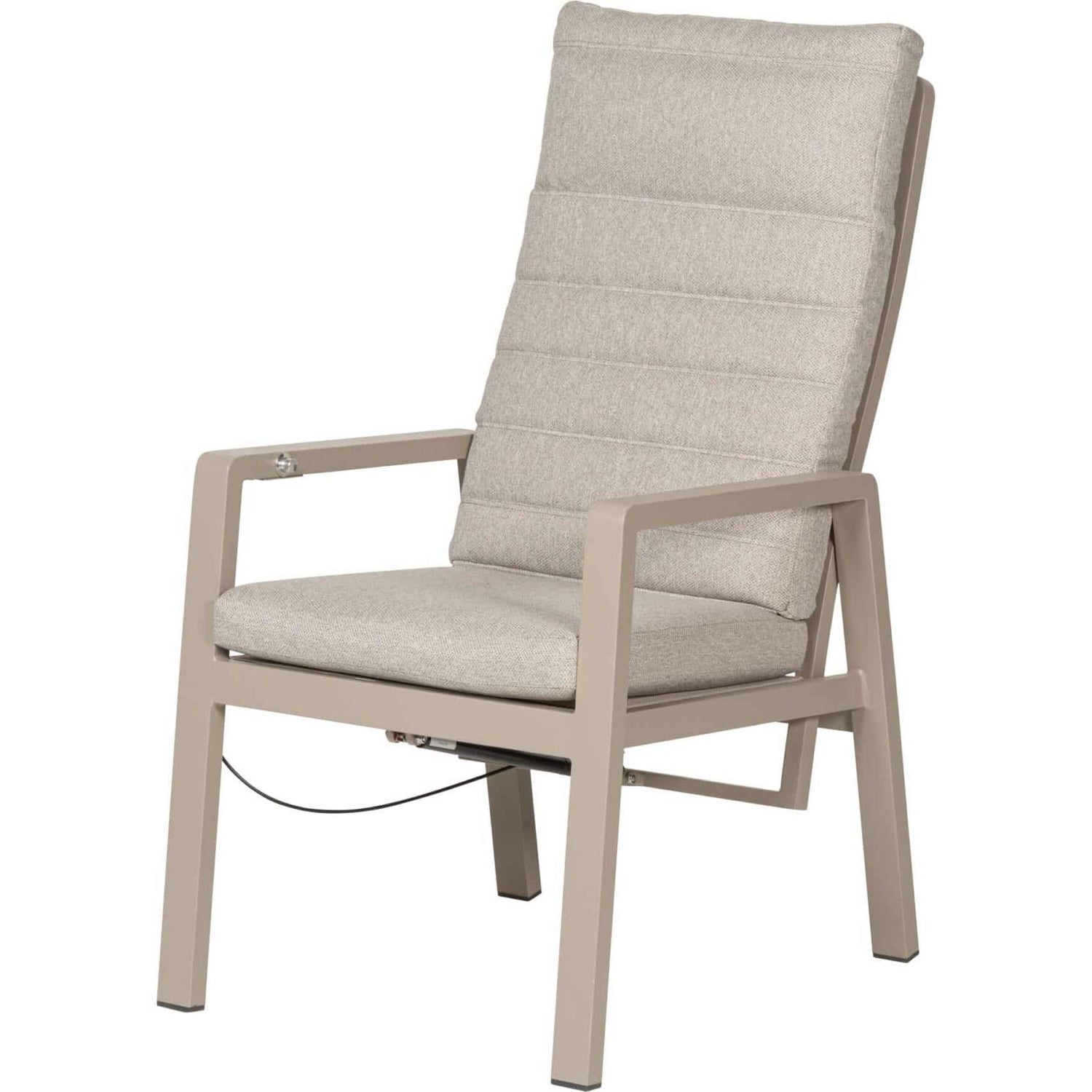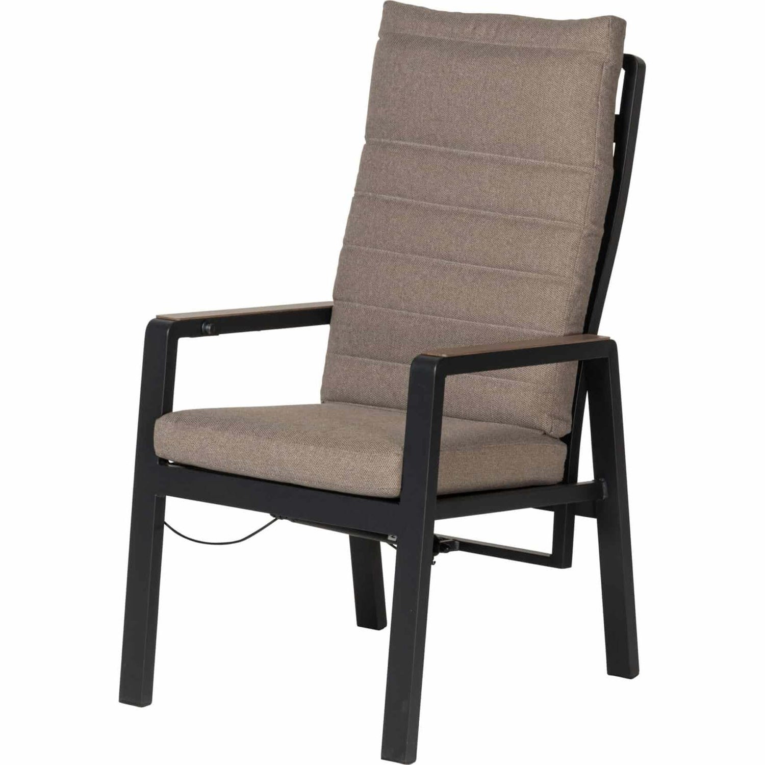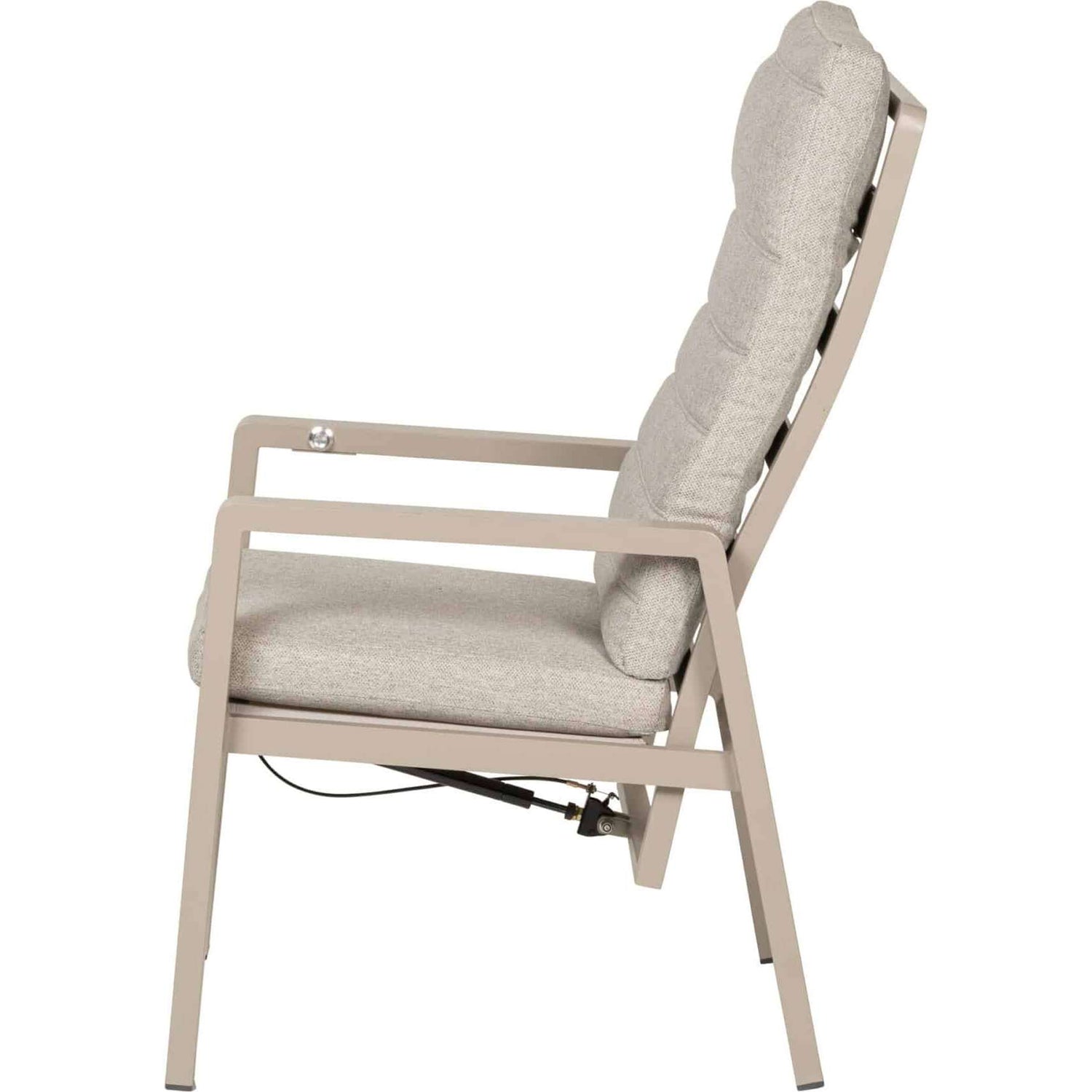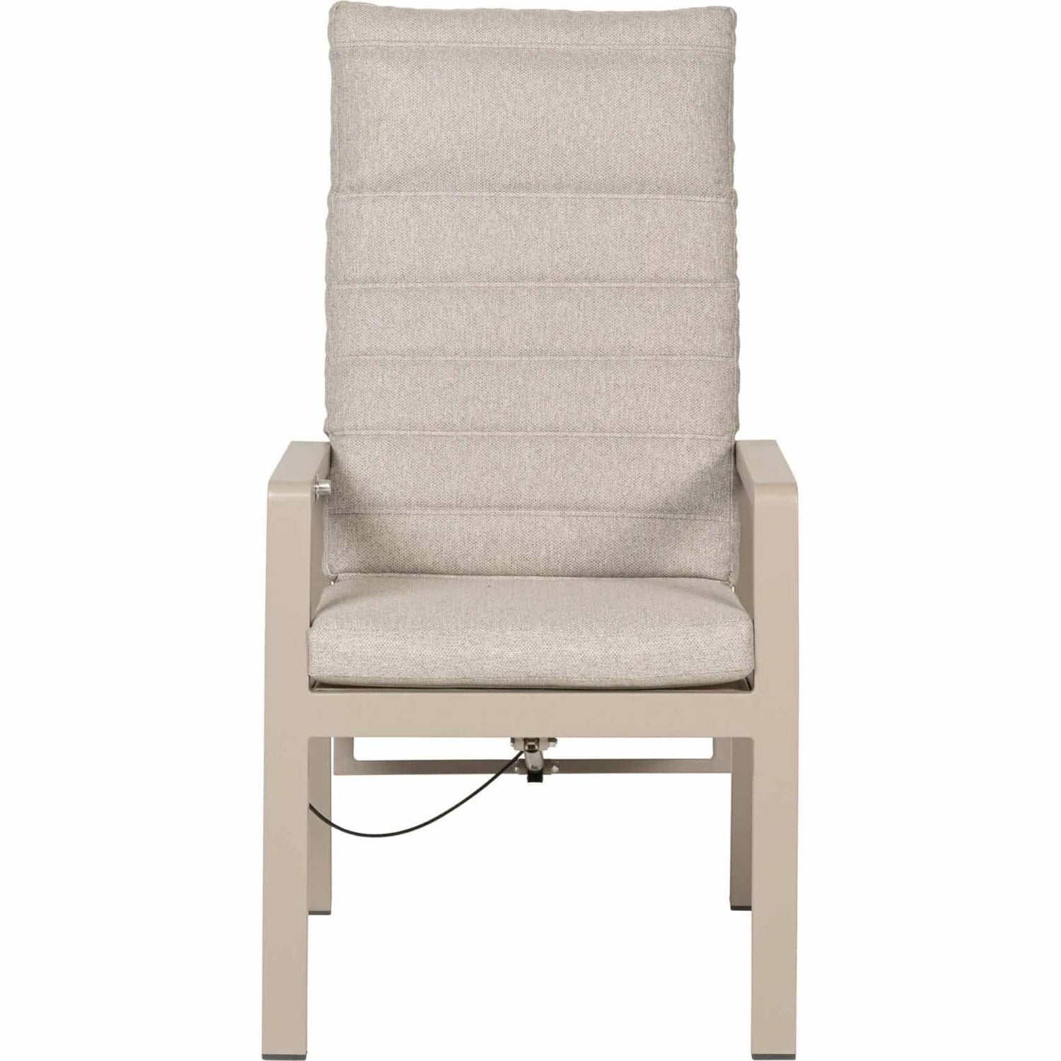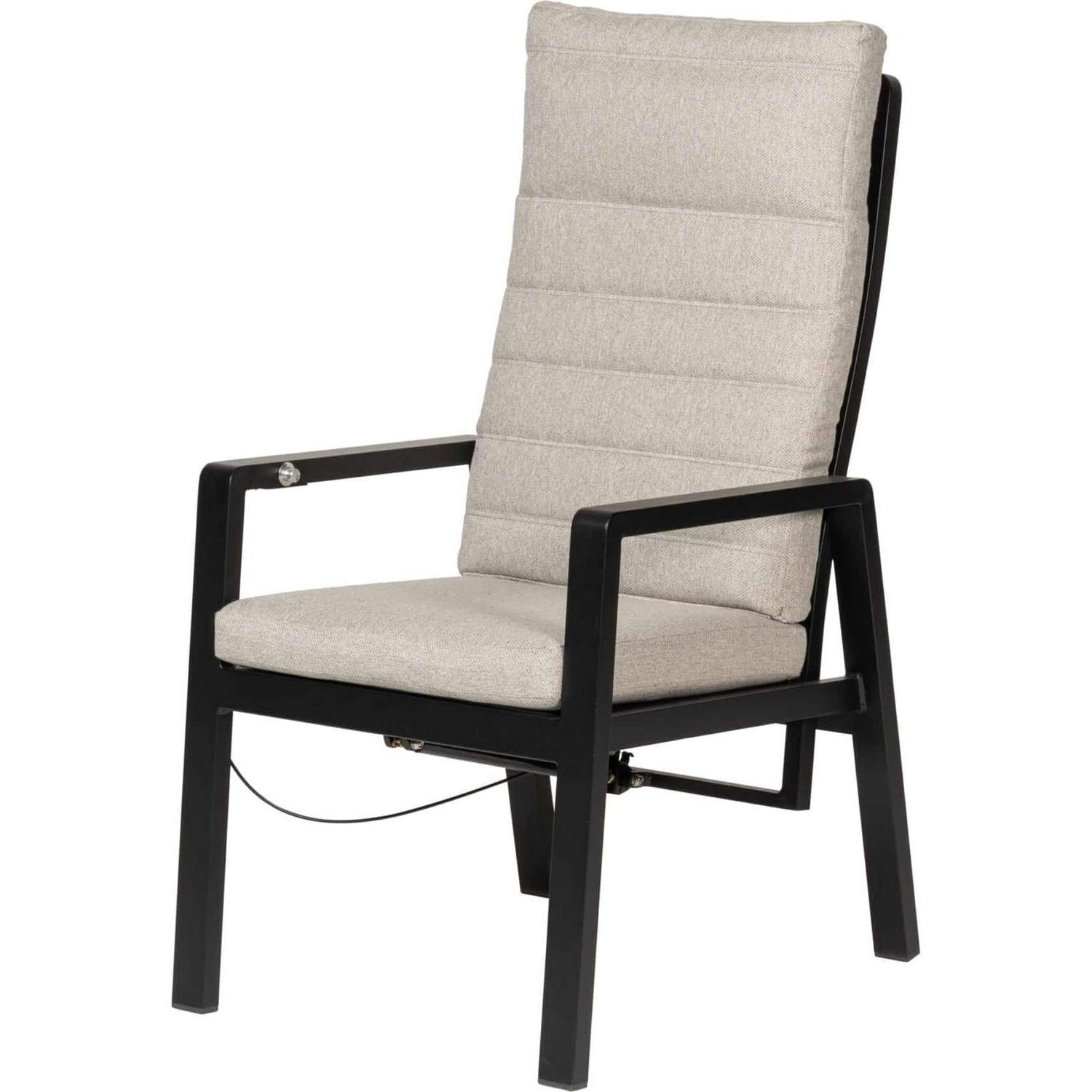 Almeria regulerbar spisestol er en svært komfortabel lenestol med ramme i antrasittfarget aluminium. I stolens sete er det textilene for ekstra komfort og de behagelige putene er av naturfarget spun-polyester. Stolryggen har aluminiumslameller og kan justeres trinnløst til ønsket posisjon med en diskret trykknapp på høyre armlene. Stol: B60xD72xH110 Fotskammel: B60xD56xH38 Bord: L49xB49xH45