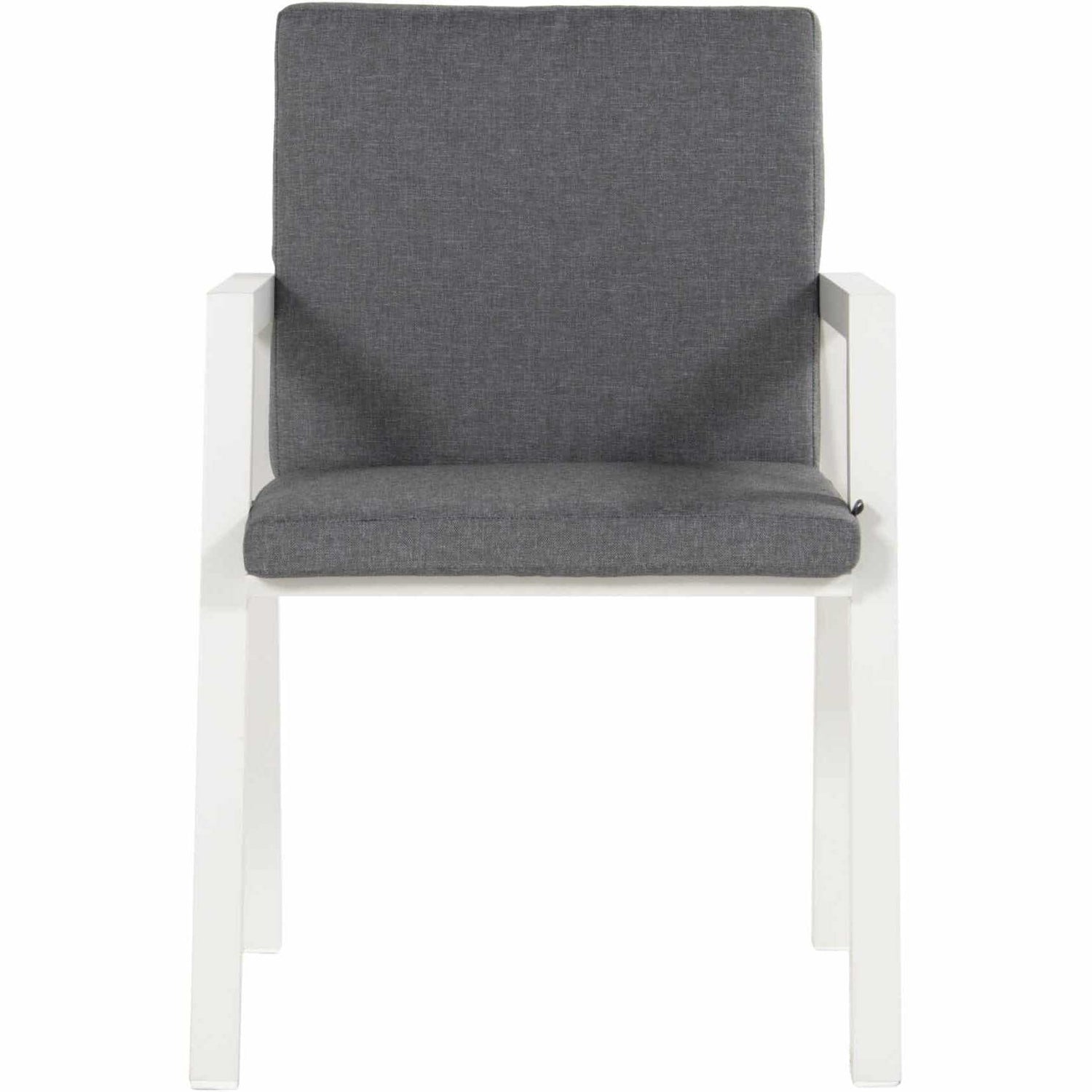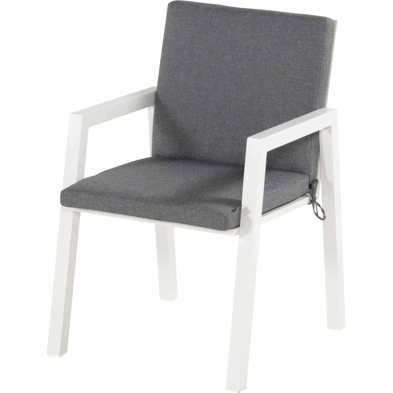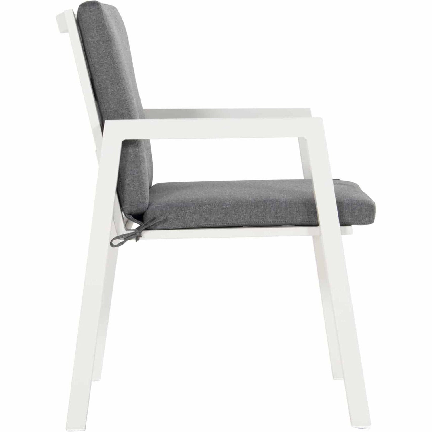 Stabelbar og værbestandig spisestol i moderne design. Hvitlakkert aluminiumramme og lysegrå olefinpute. Enkel å rengjøre, ideell for utendørs bruk. Robust og plassbesparende – perfekt for hage, terrasse og uterom.