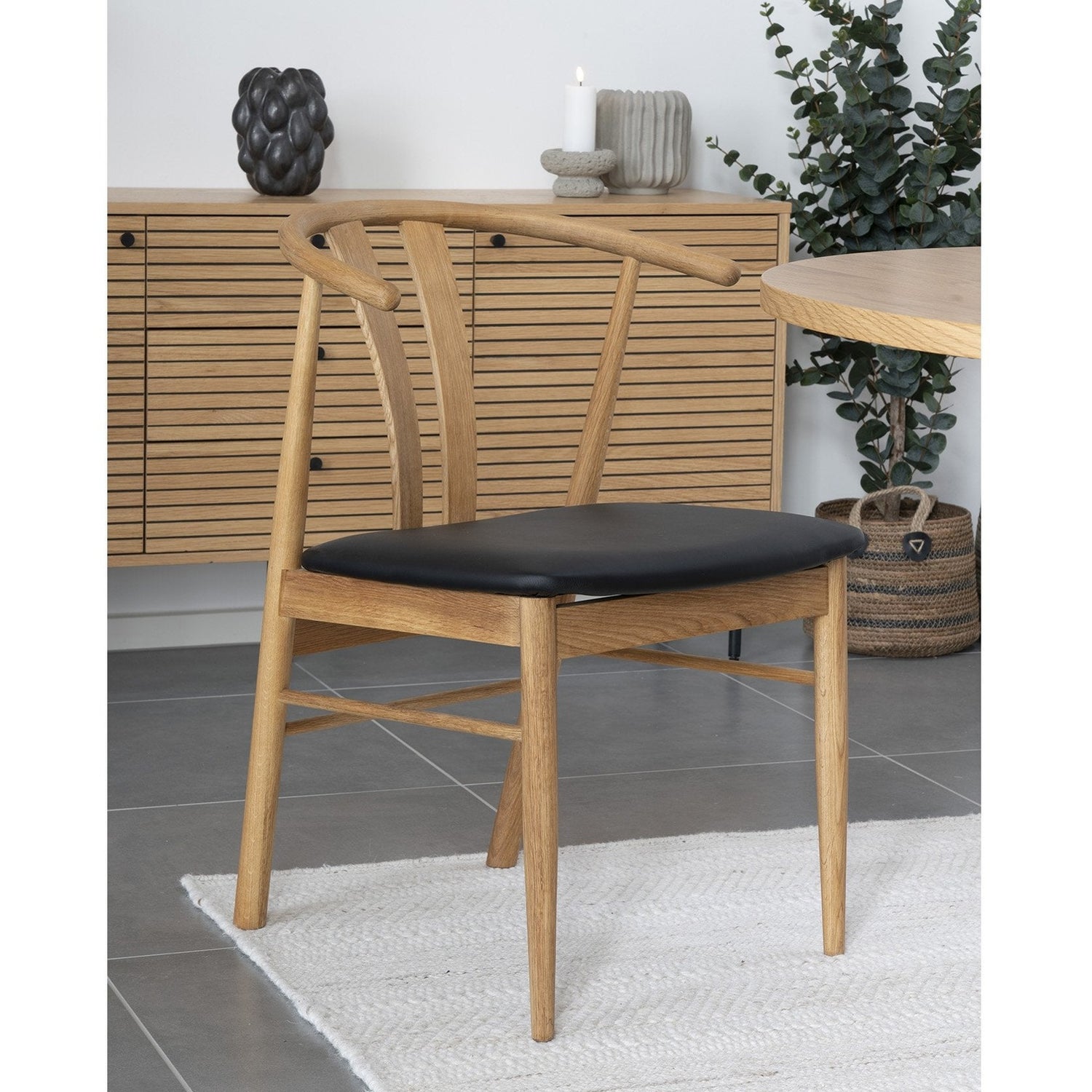 Denne spisebordsstolen kombinerer tidløs eleganse med moderne komfort. Laget av solid eik, utstråler den en naturlig skjønnhet og holdbarhet som passer perfekt inn i ethvert hjem. Setet er polstret med PU-materiale, som gir en myk og behagelig sitteopplevelse samtidig som det er lett å rengjøre. Stolen har et stilrent design som gjør den til et ideelt valg for både klassiske og moderne interiører. Med sitt ergonomiske utformede sete og ryggstøtte, tilbyr denne stolen optimal støtte og komfort under lange måltider og hyggelige sammenkomster.