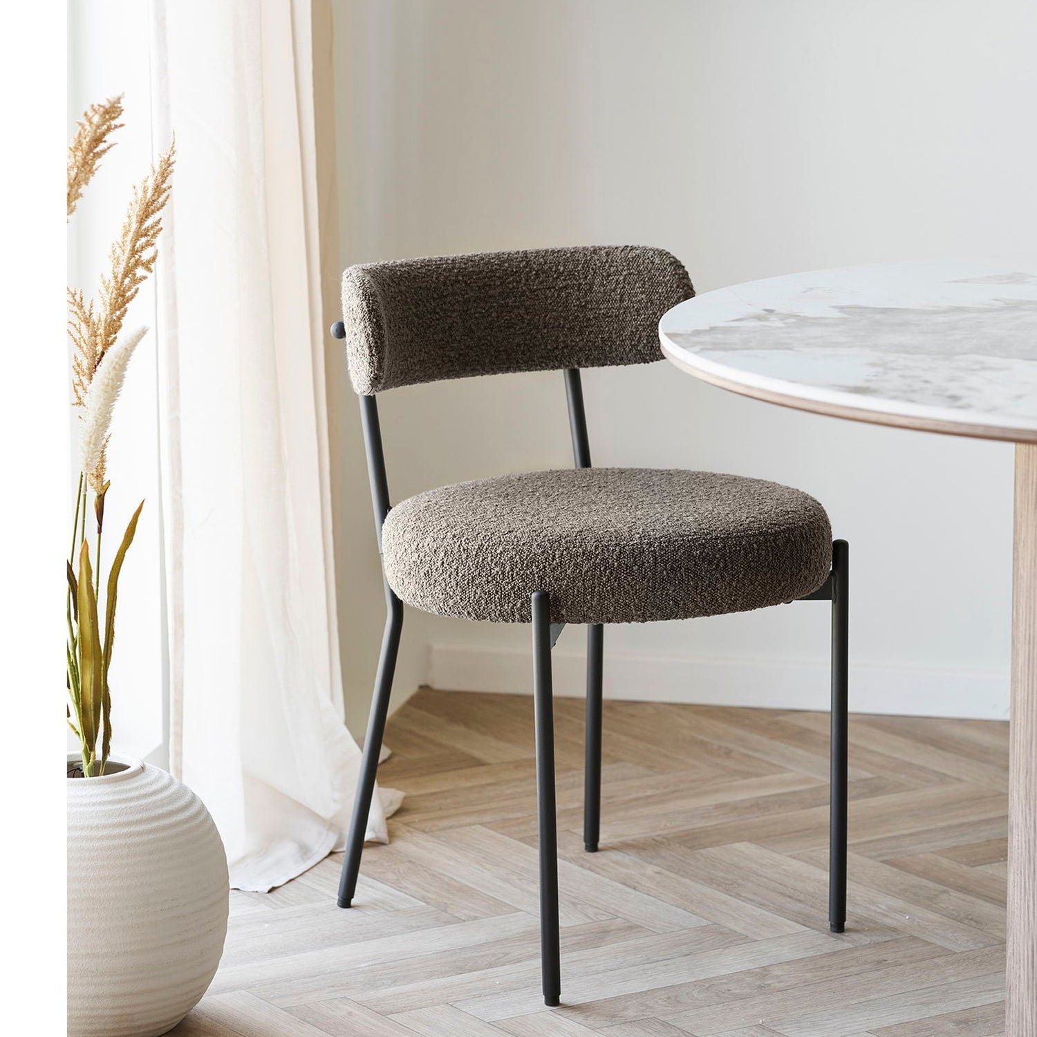Denne spisebordsstolen kombinerer moderne eleganse med komfort, og er et perfekt tillegg til ethvert spiseområde. Trekket i myk bouclé gir en luksuriøs følelse, mens de sorte benene tilfører en stilren kontrast og stabilitet. Stolen er designet med tanke på både estetikk og funksjonalitet, og gir god støtte for lange, hyggelige måltider. Med sitt tidløse design passer denne stolen inn i ulike interiørstiler, fra det minimalistiske til det mer klassiske.