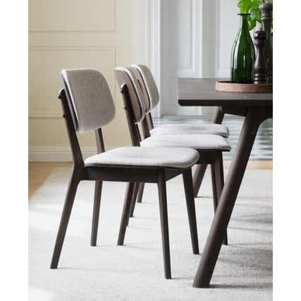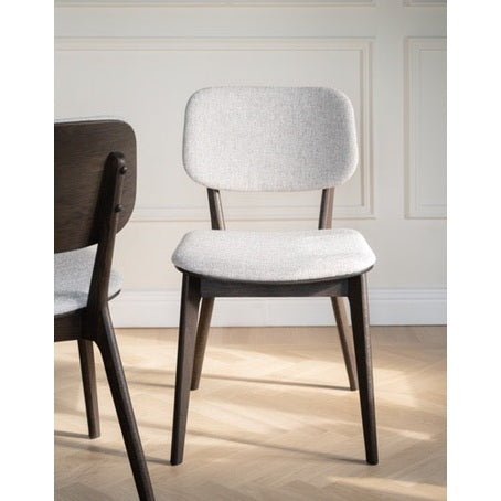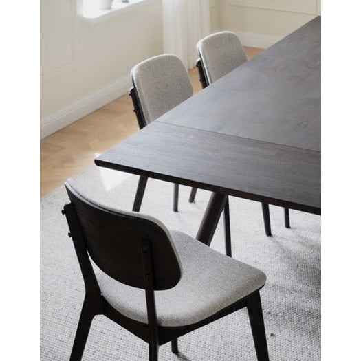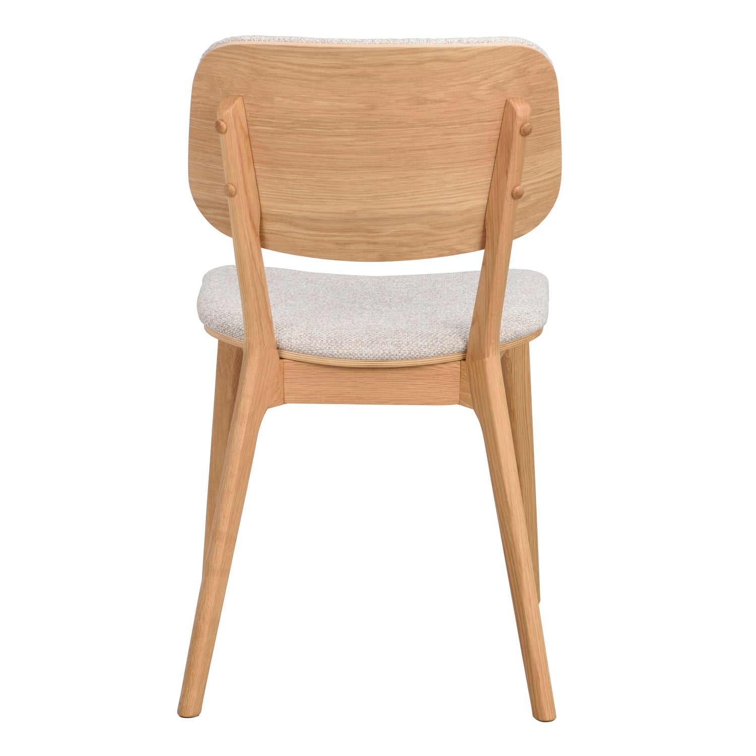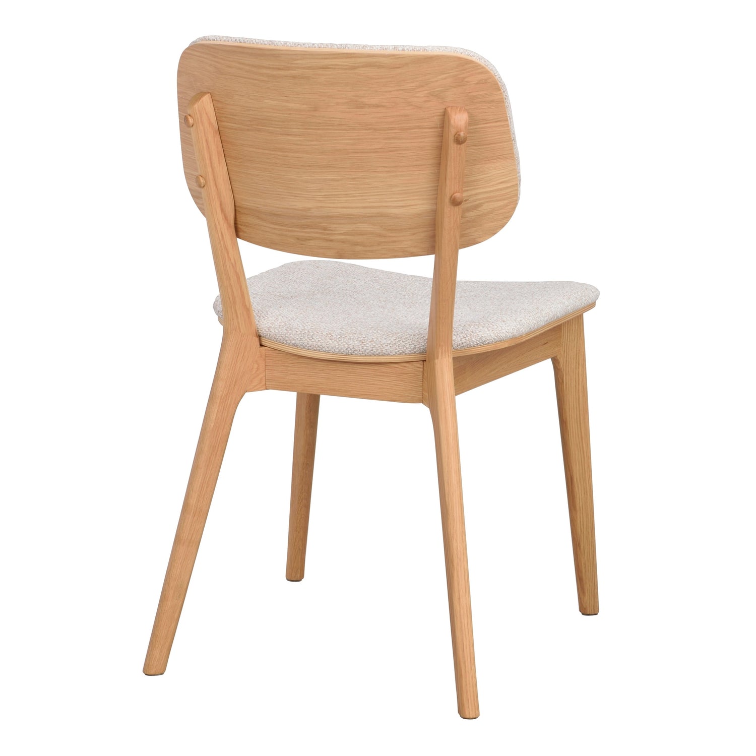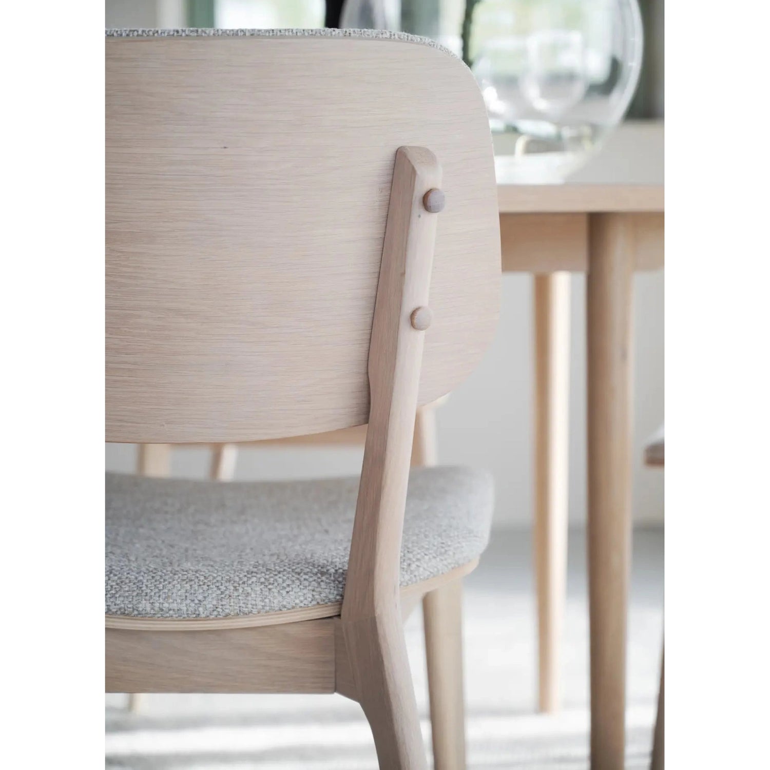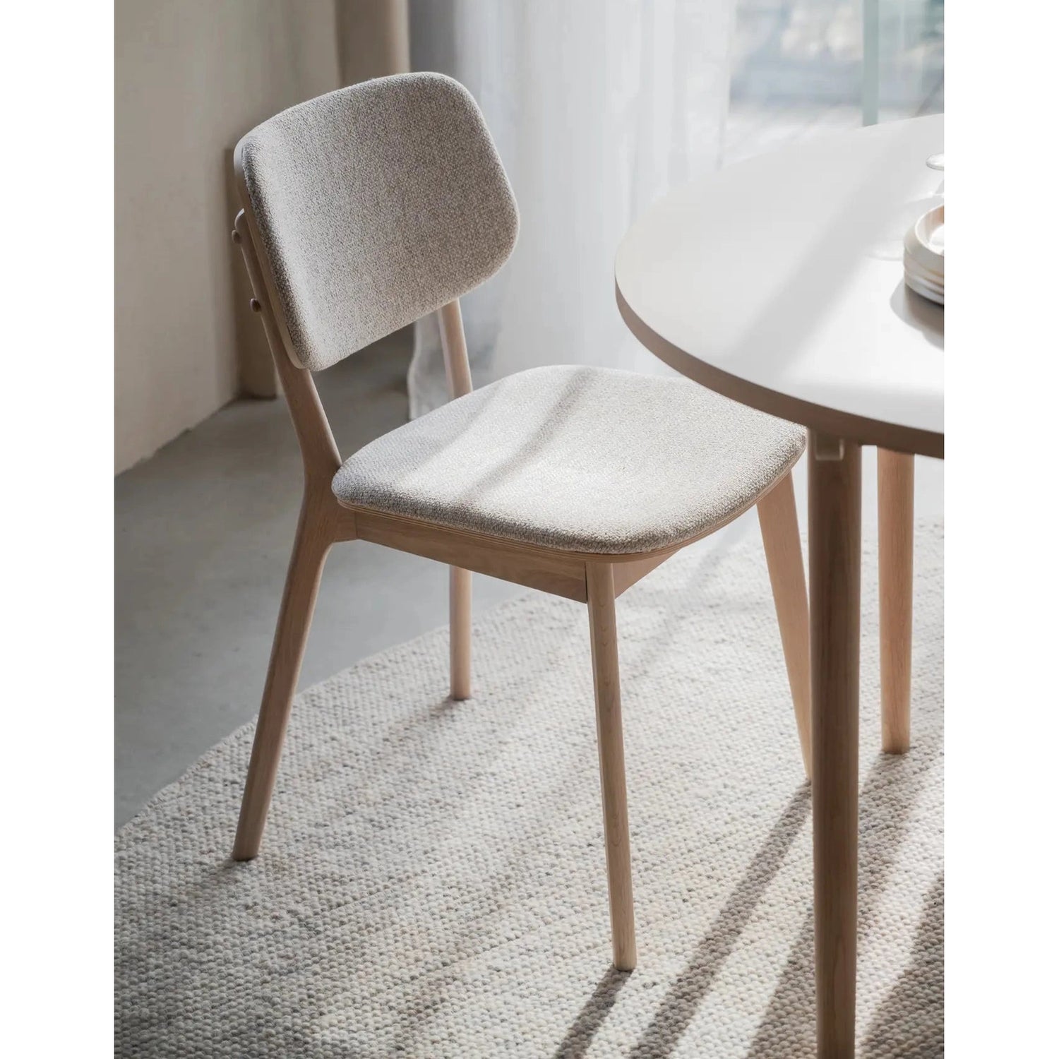 Barrett spisestol i eik kombinerer gjennomført design med høy sittekomfort. Den generøse, buede ryggstøtten og det lett formede setet er laget for lange og behagelige middager. Med avrundet profil og polstring i både sete og rygg gir stolen en myk, men støttende sitteopplevelse.