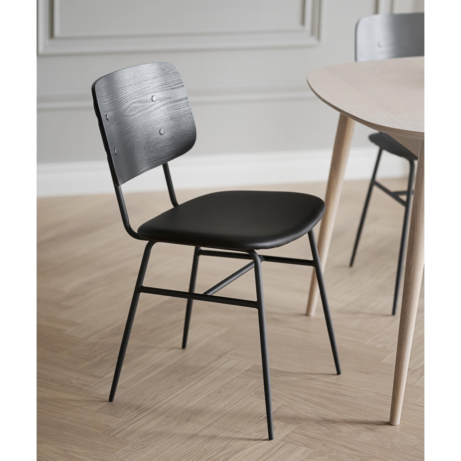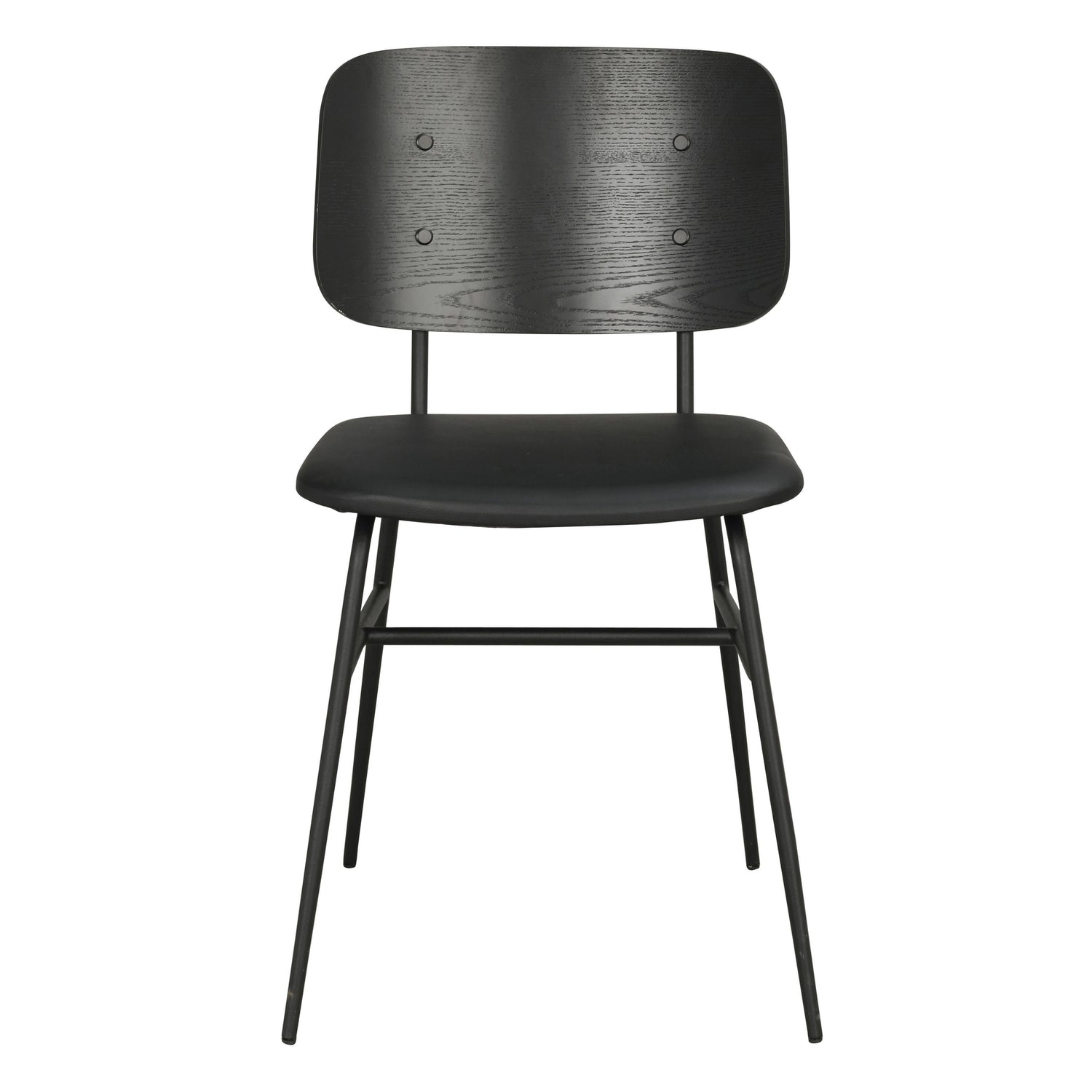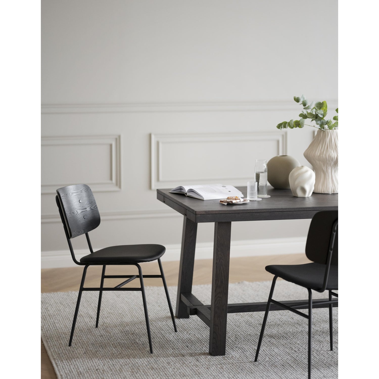 Oppdag Brent-stolen, en stilren og komfortabel stol som hever ethvert spisestue. Med en ryggplate i ask og en bred, polstret sete i kunstskinn, tilbyr Brent både stil og komfort. Den solide metallrammen har en rund profil, og bena har en elegant avsmalningseffekt som gir stolen et moderne preg.