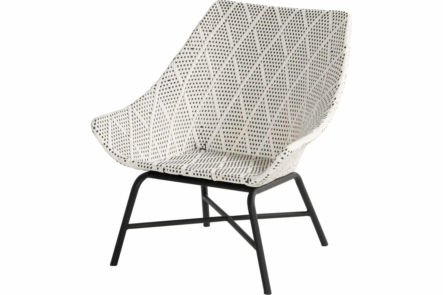 Eksklusiv loungestol i diamantflettet hvit og sort kunstrotting. Komfortabel sitteopplevelse med stil. Perfekt til uteplassen. Pute må kjøpes separat. Ideell for hage, terrasse og uterom.