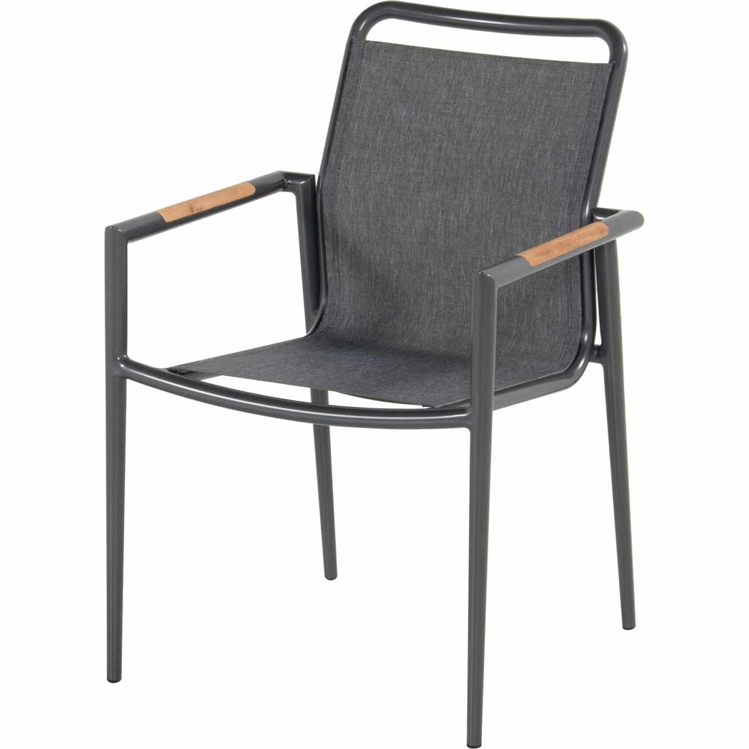 Attraktiv og stabelbar spisestol med en rund aluminiumsramme og teak-detaljer på armlener. Sete og rygg i soft textilene. Tåler varierte værforhold og er enkel å rengjøre.
