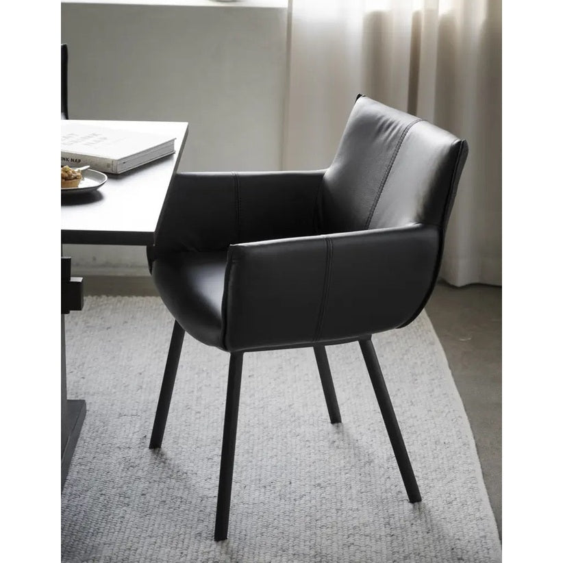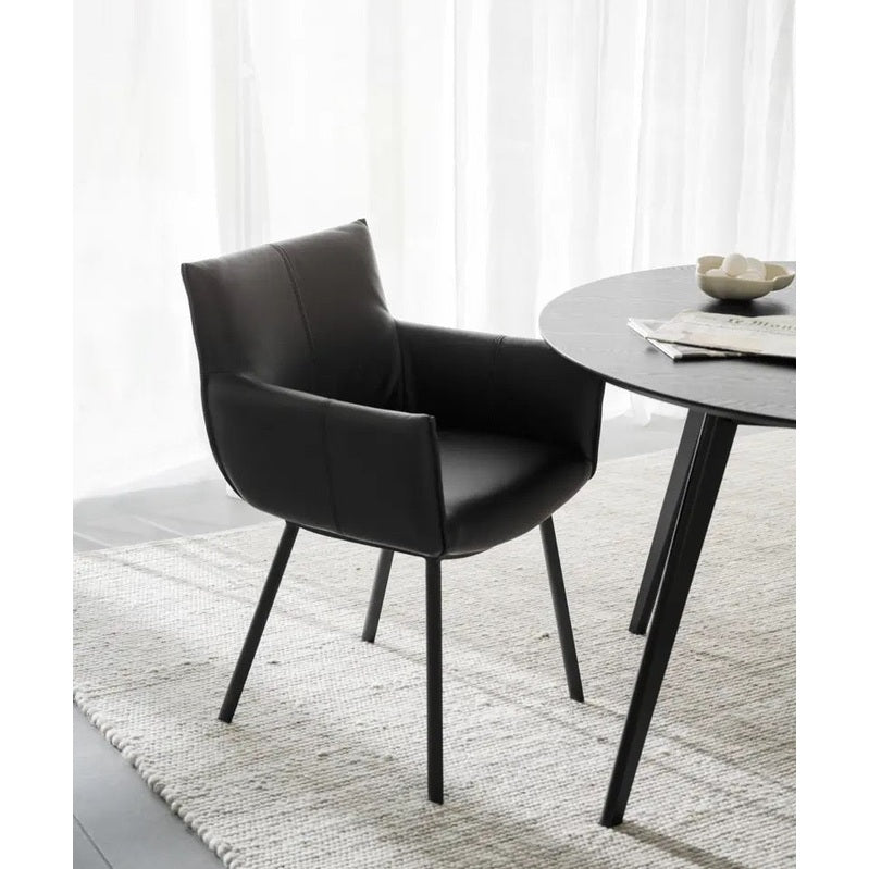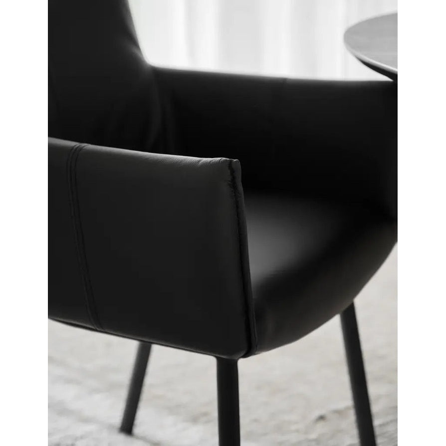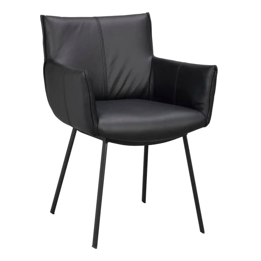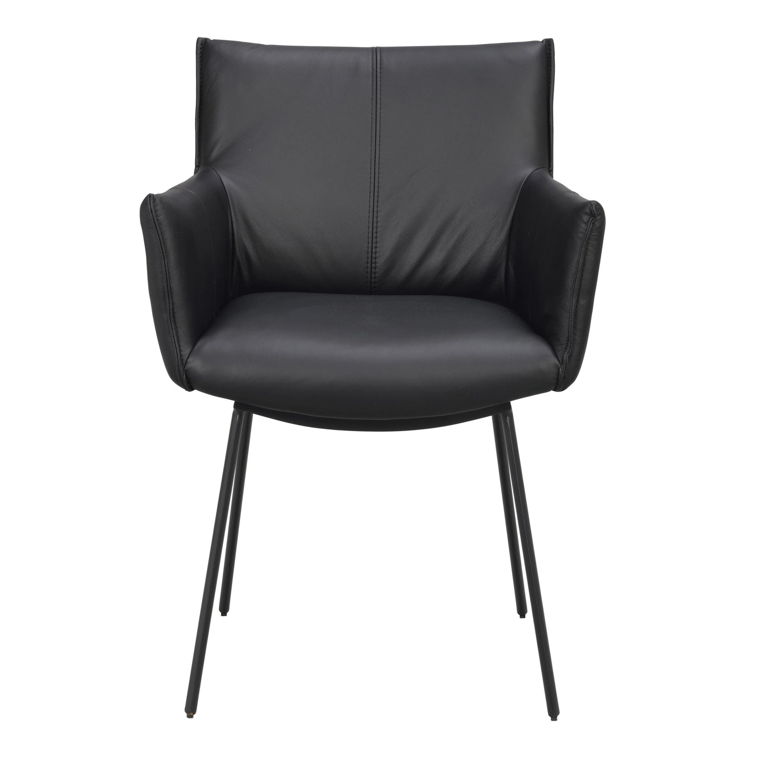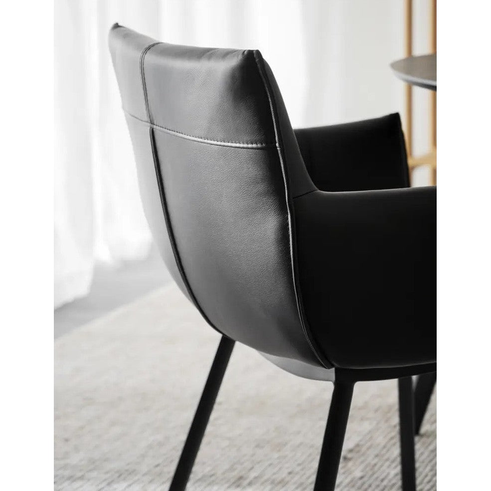 Materiale: Stolramme trukket i lær, myk fylling, armlener, med ben i pulverlakkert metall.