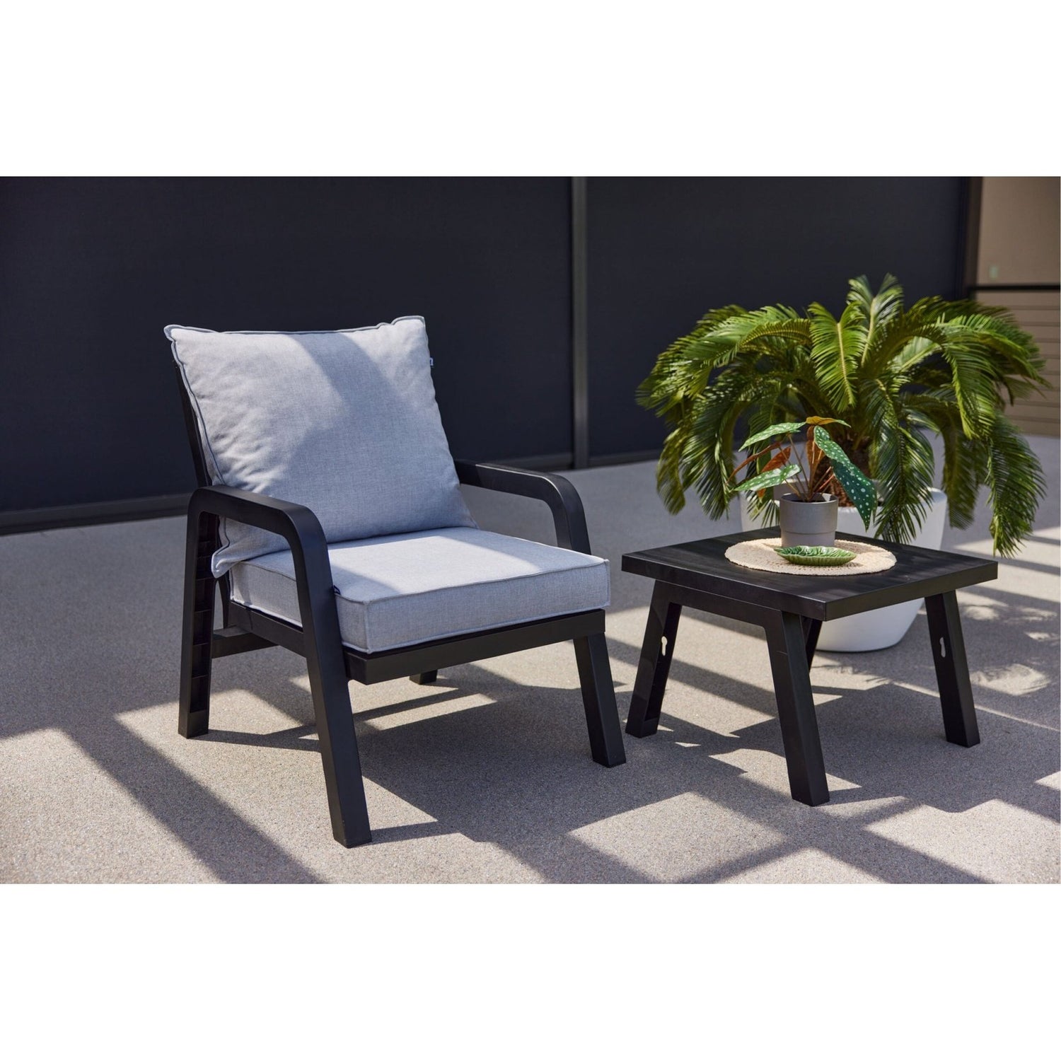 Hele Ibiza-serien er produsert i Europa, og har et moderne og solid design. Sofaramme og bord er laget i aldringsbestandig plast, komfortable puter i med trekk i olefin. Tåler godt varierte værfohold og er enkel å rengjøre. 5 års garanti mot material- og konstruksjonsfeil.