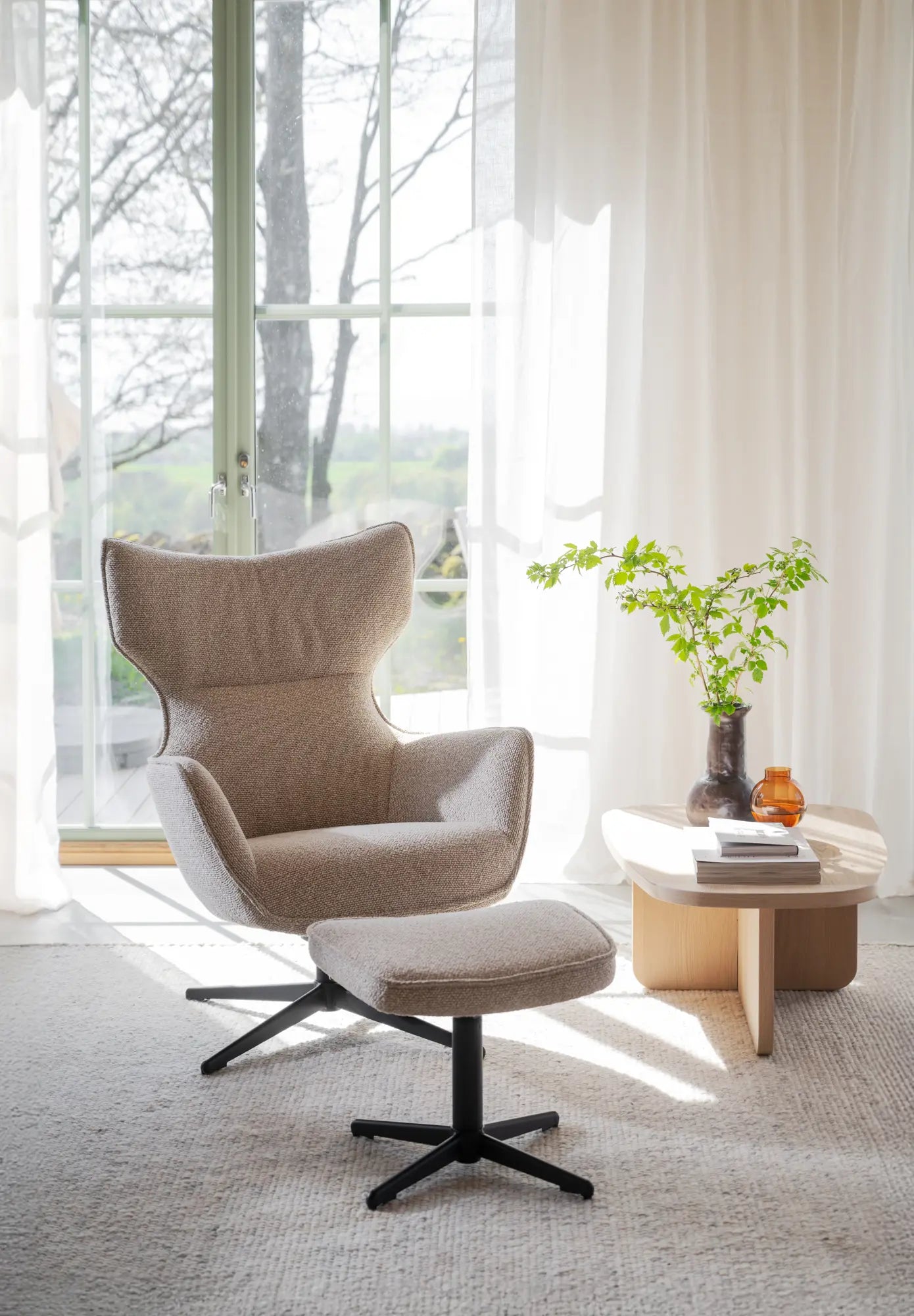 Materiale: Lounge stol i metallramme, polstret med polyeter-skum og polyesterstoff. Sving- og gyngefunksjon. Svart pulverlakkert stålbein. Fotpall inkludert, polstret med polyeter-skum og polyesterstoff. Også med svingfunksjon, svart pulverlakkert stålbein.