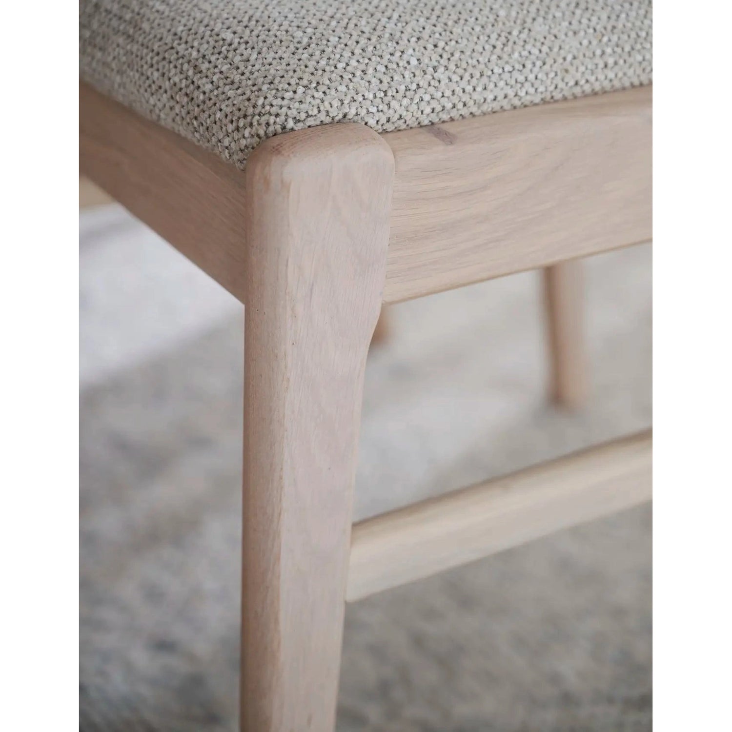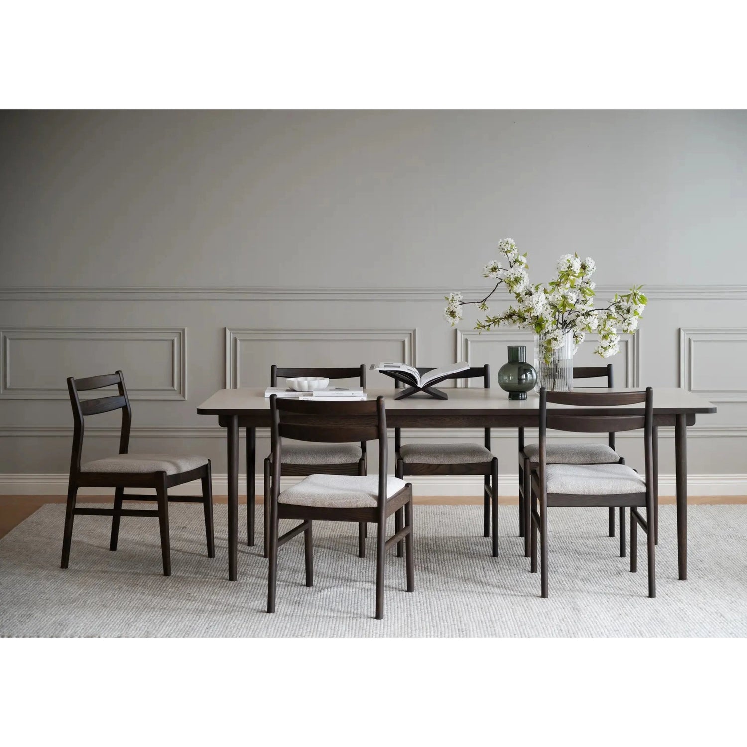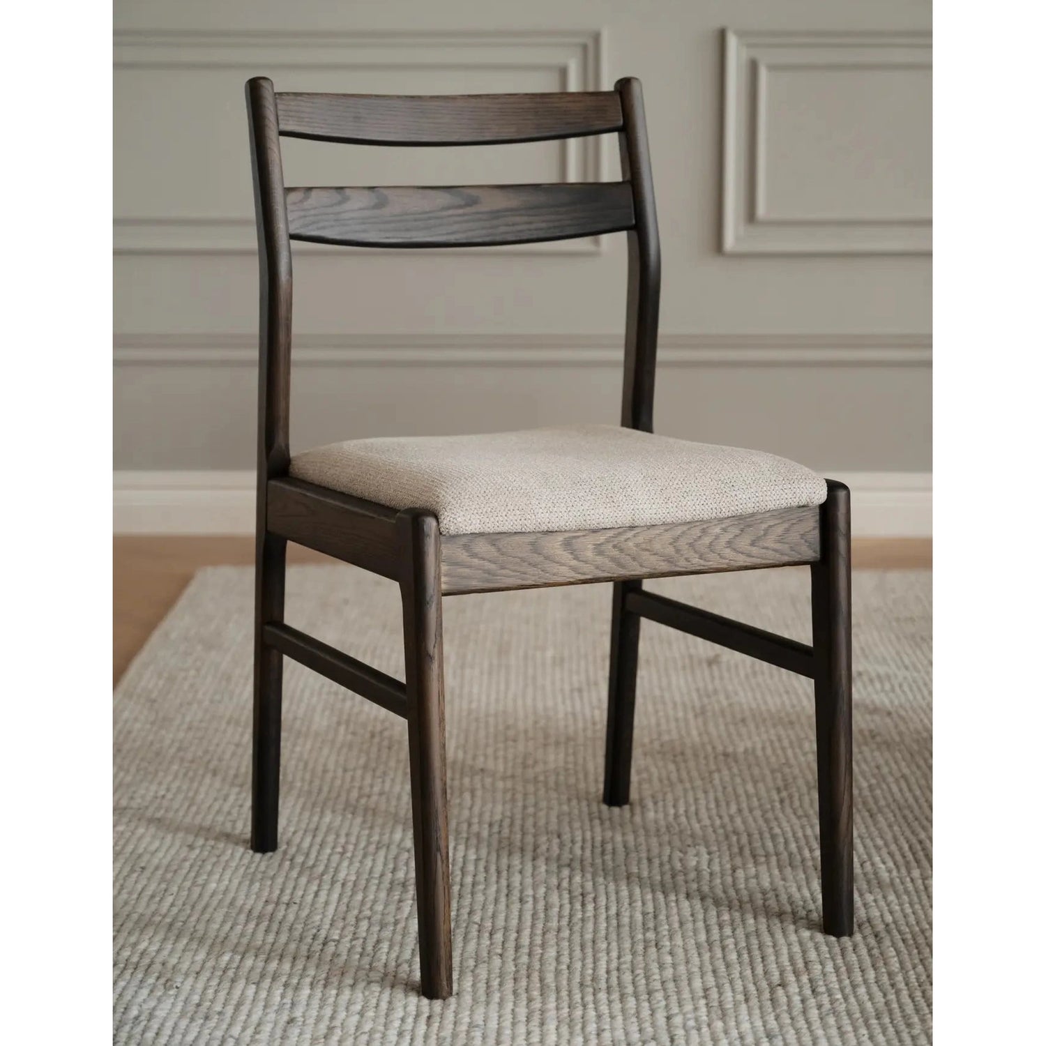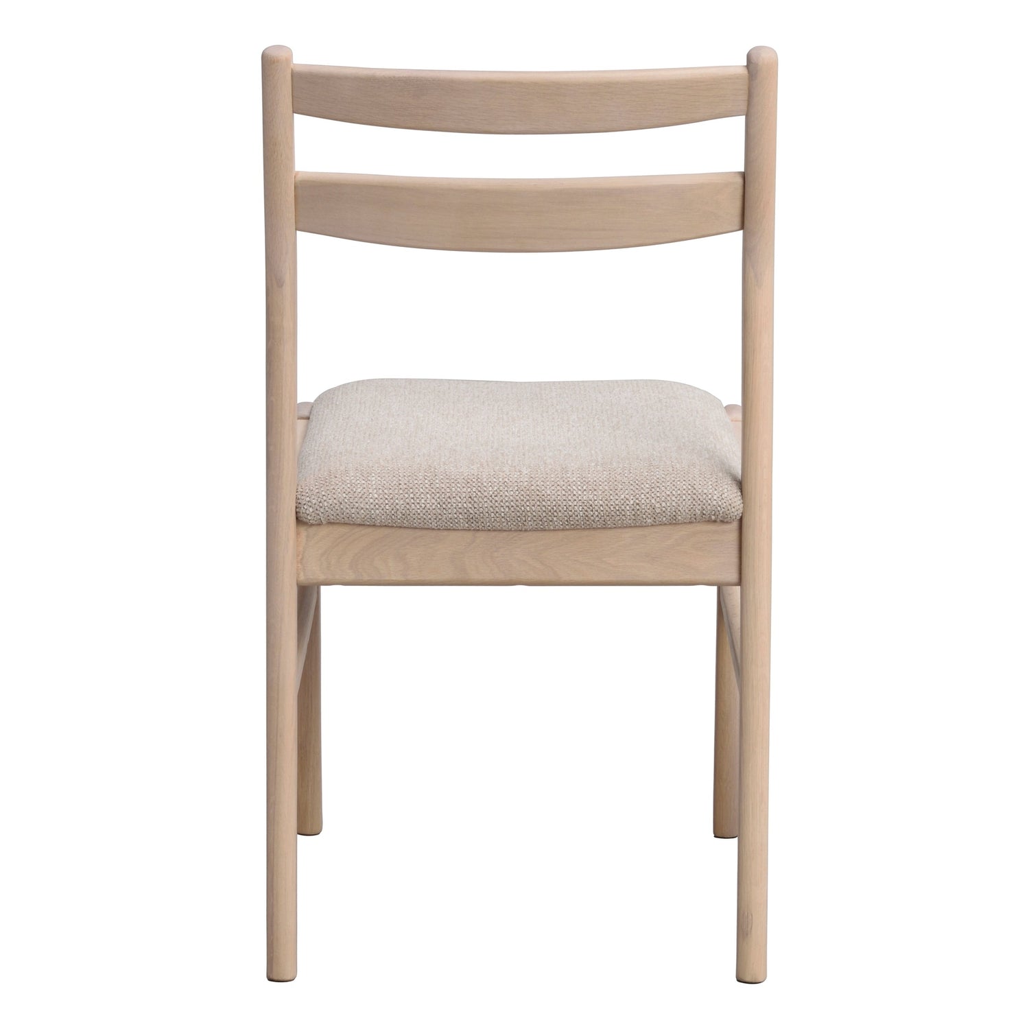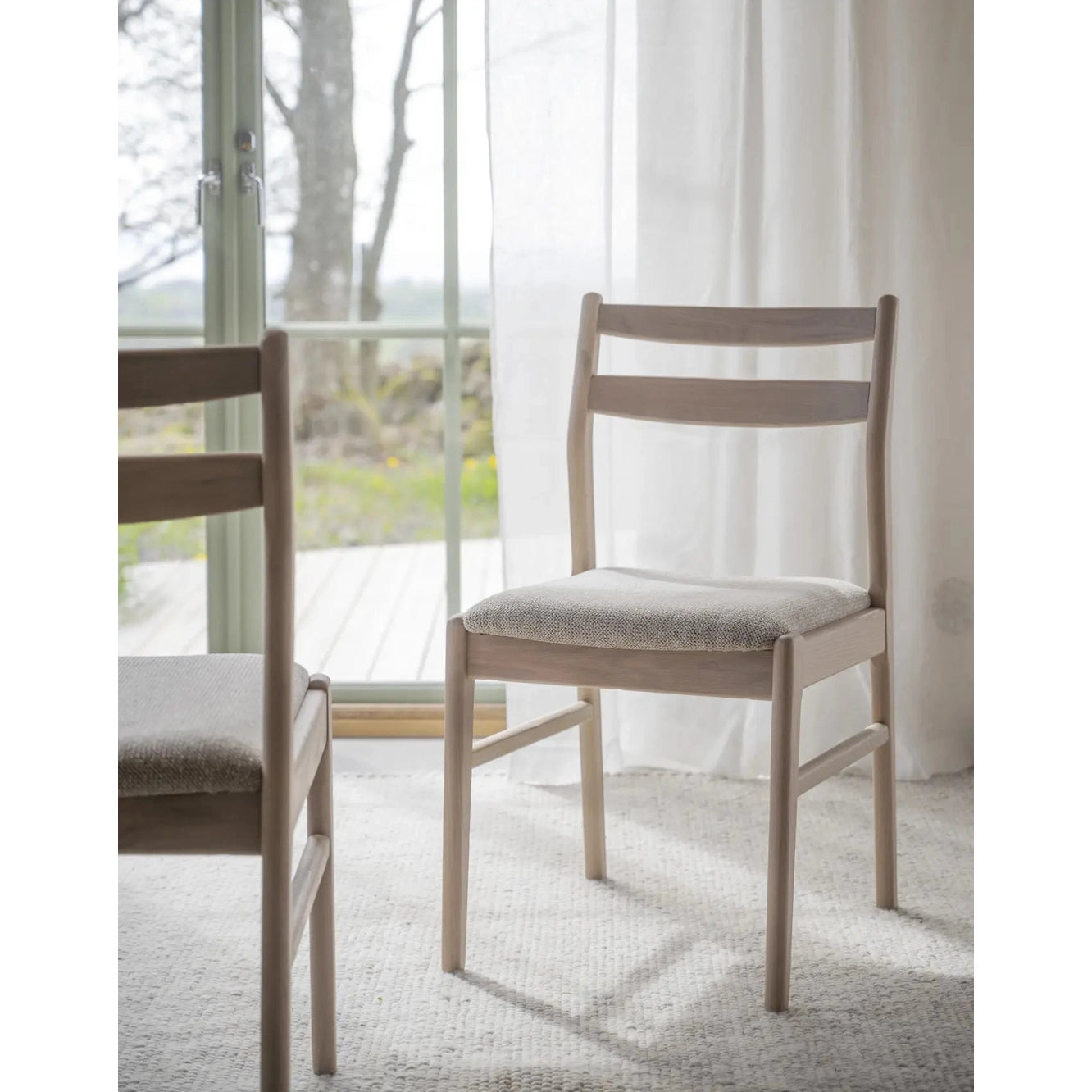 Setet er trukket i slitesterkt beige stoff som tilfører tekstur og et sofistikert uttrykk. Den solide konstruksjonen gir stabilitet, mens det smarte designet gjør stolen enkel å montere. Med sine nøye utformede detaljer er Kerwin en moderne klassiker med skandinavisk preg – en spisestol som gir hjemmet ditt karakter og stil.