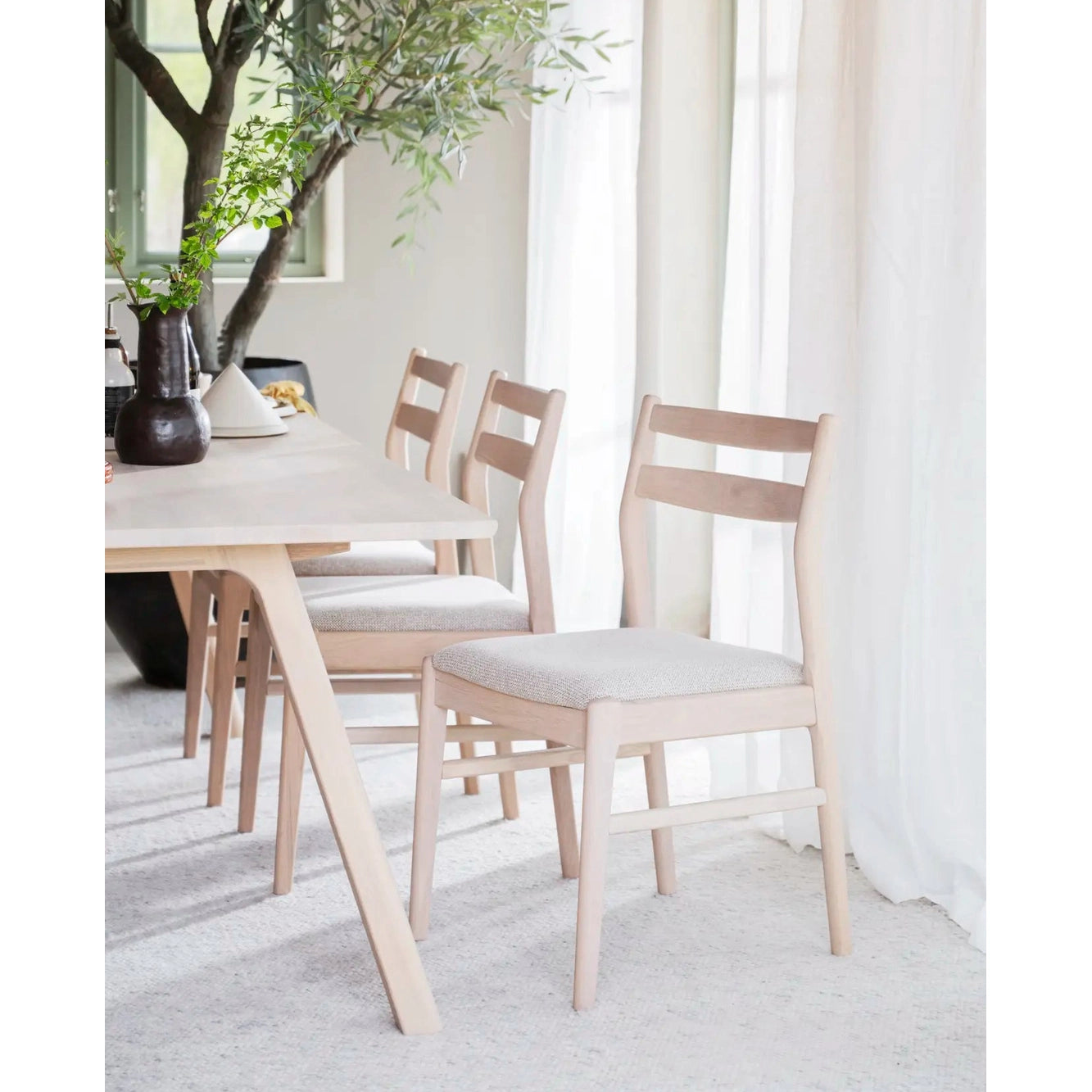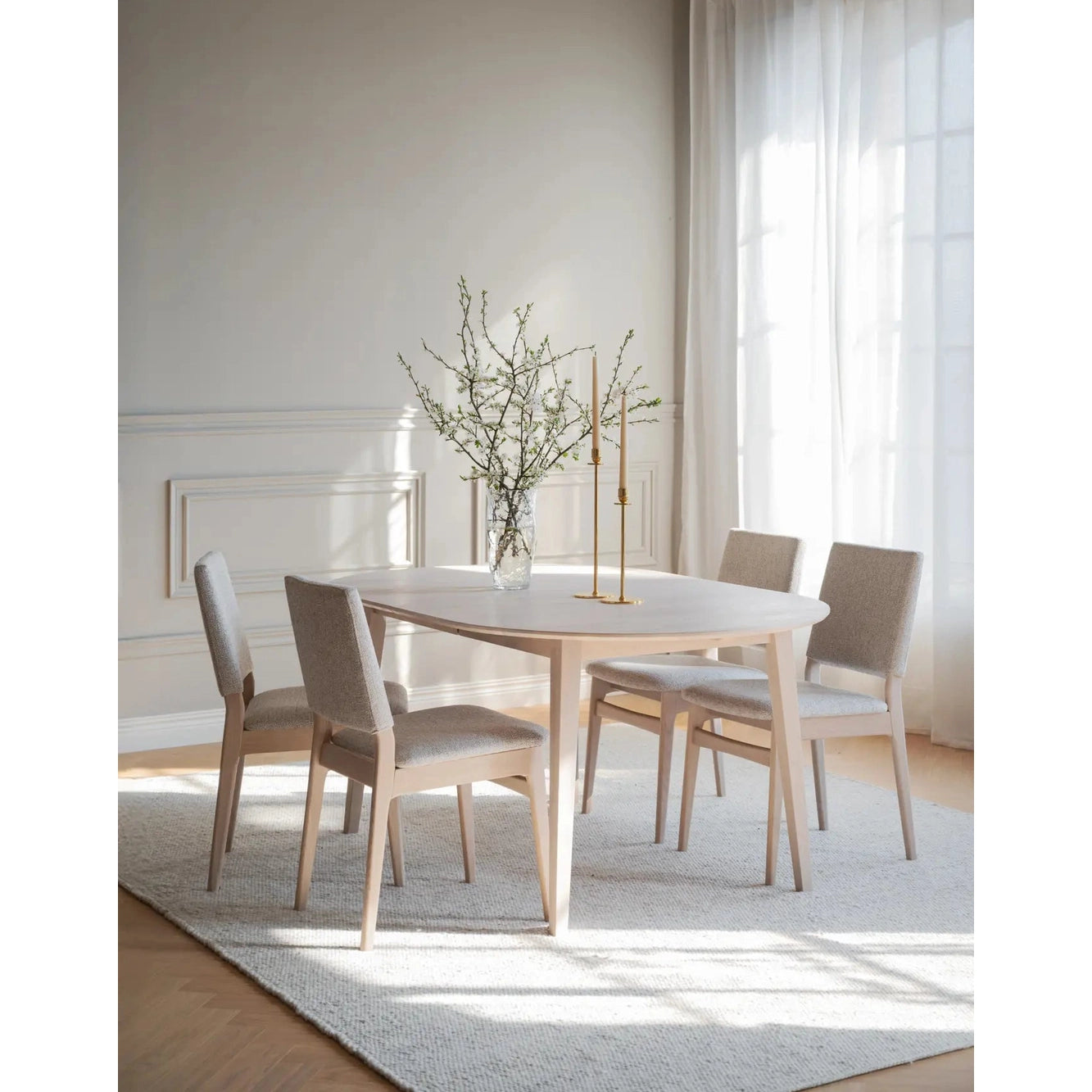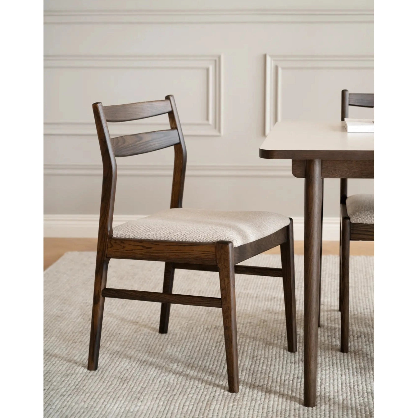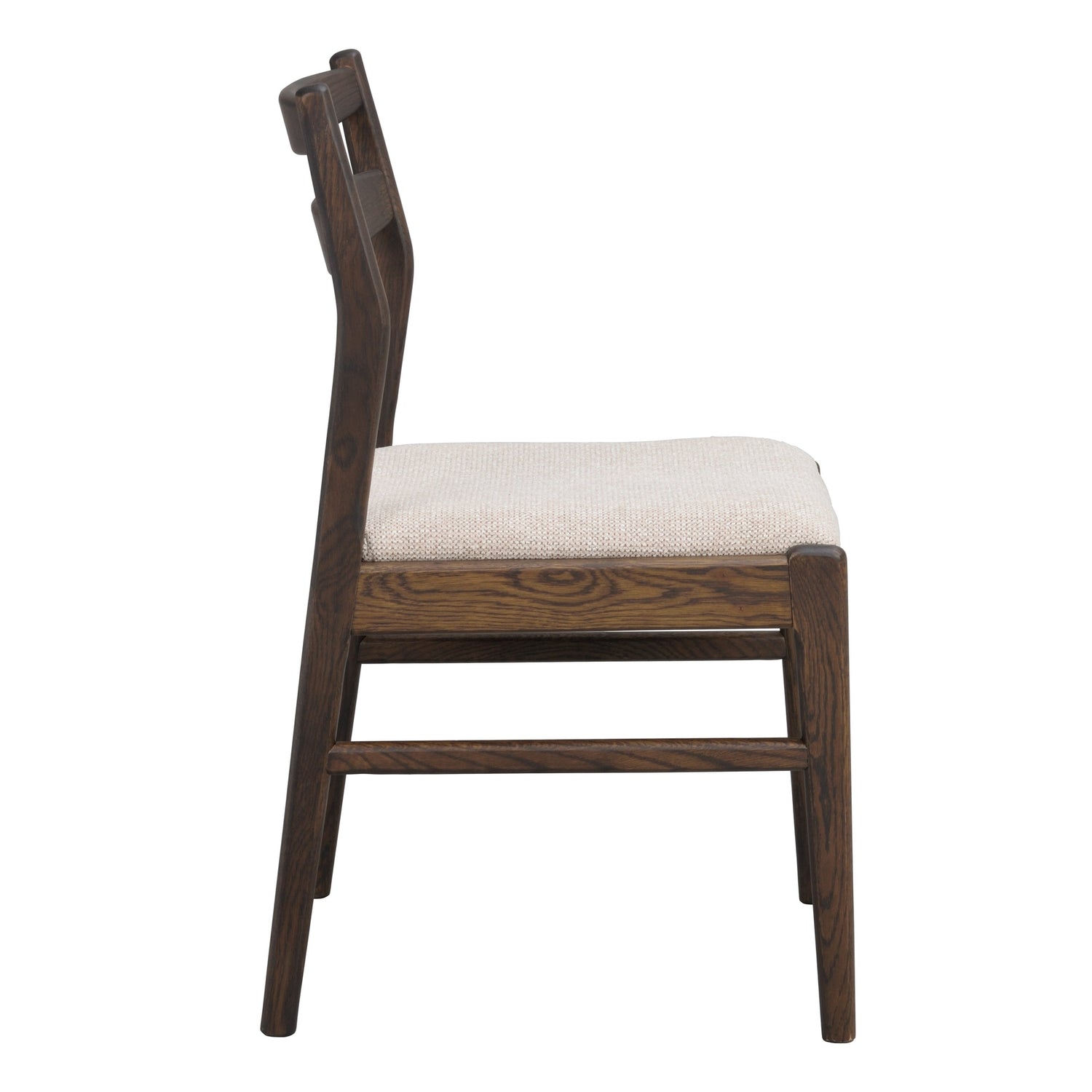 Setet er trukket i slitesterkt beige stoff som tilfører tekstur og et sofistikert uttrykk. Den solide konstruksjonen gir stabilitet, mens det smarte designet gjør stolen enkel å montere. Med sine nøye utformede detaljer er Kerwin en moderne klassiker med skandinavisk preg – en spisestol som gir hjemmet ditt karakter og stil.