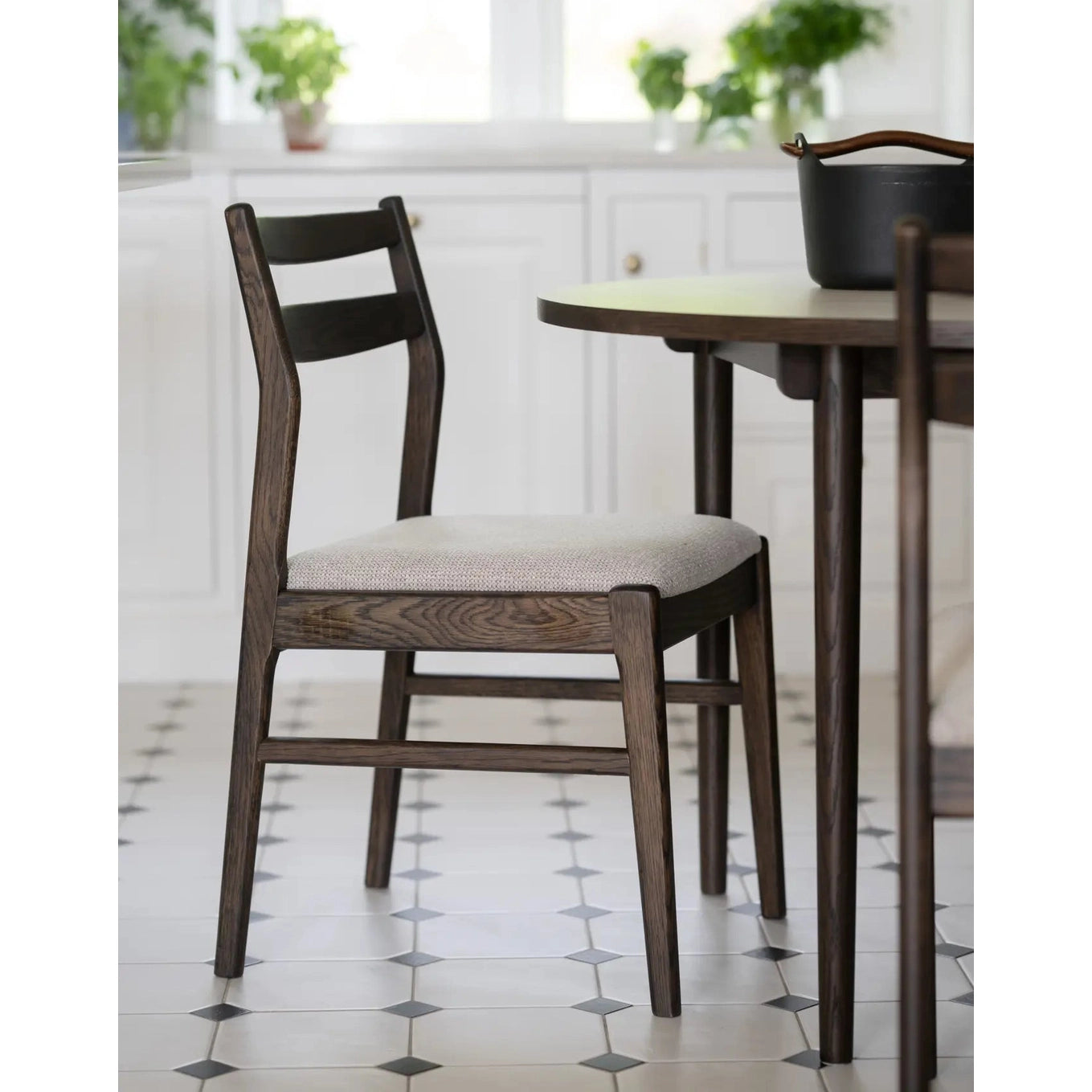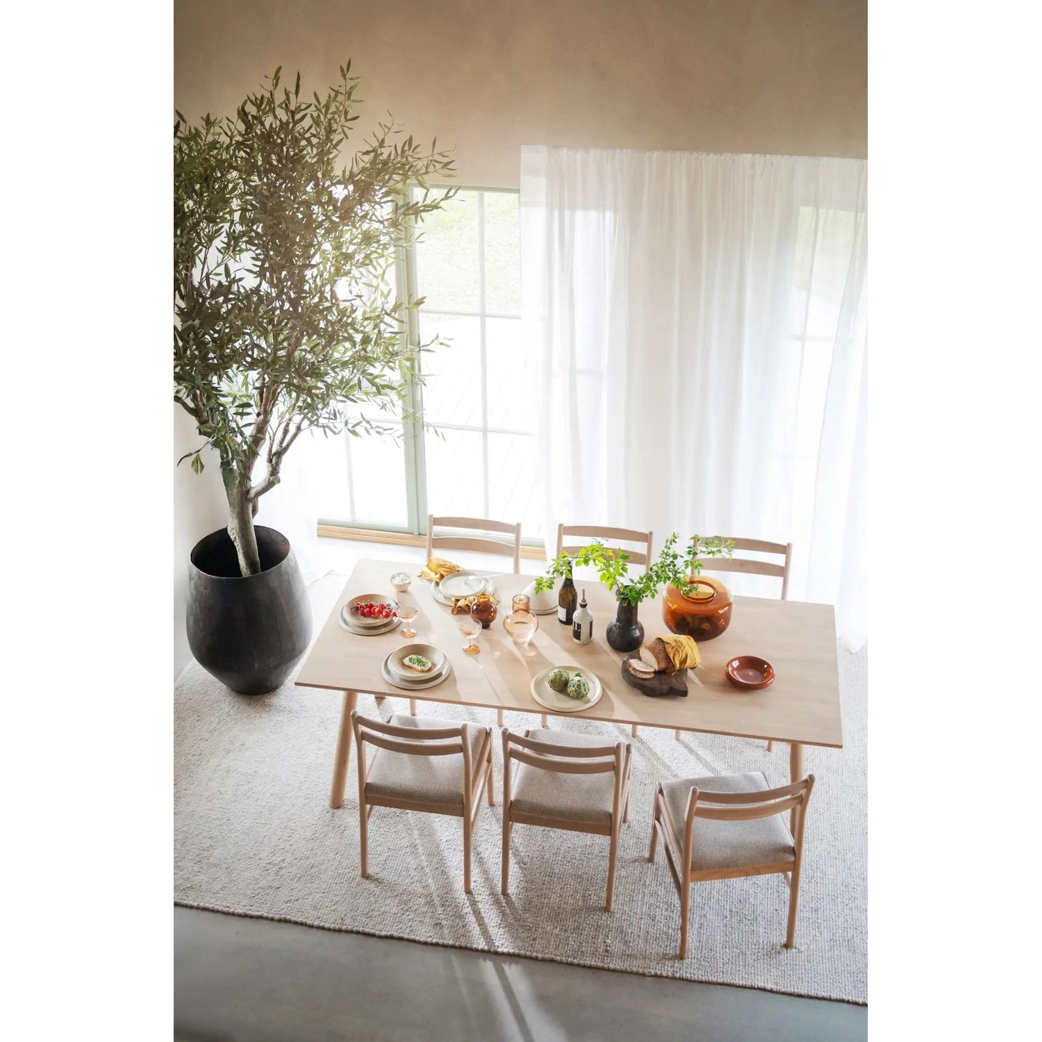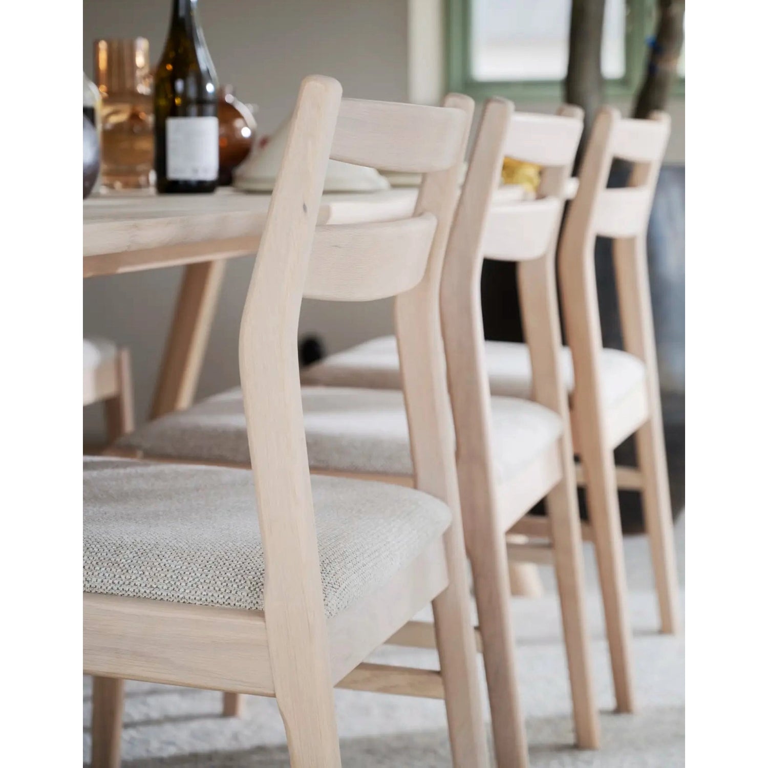 Kerwin spisestol i eik er inspirert av dansk design fra 1950- og 60-tallet, og kombinerer tidløs eleganse med funksjonalitet. Stolen er laget i solid eik med en harmonisk balanse mellom avrundede former og rette linjer, noe som gjør at den passer like godt til runde som rektangulære spisebord. Det gjennomførte håndverket gir stolen et eksklusivt preg, samtidig som den er både praktisk og allsidig i bruk.