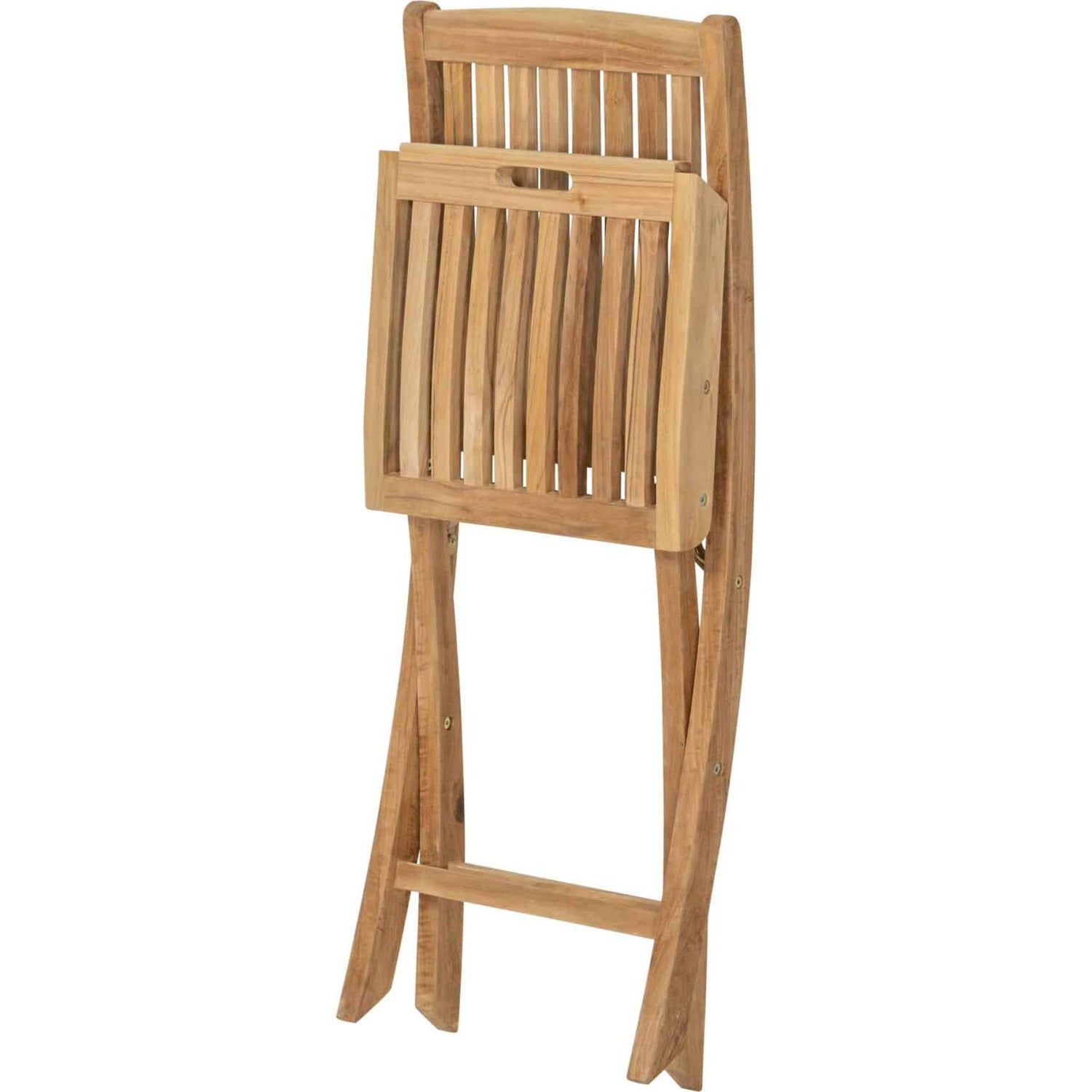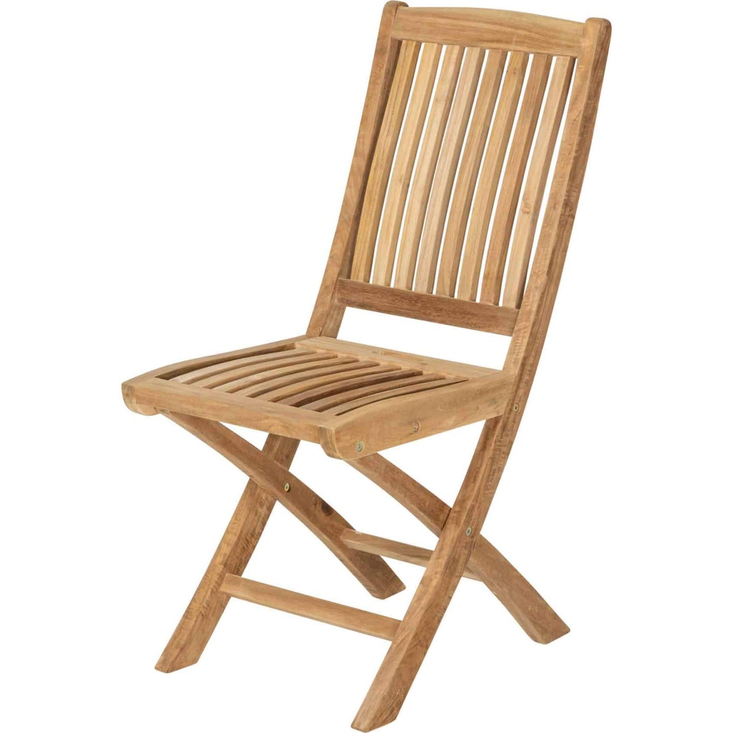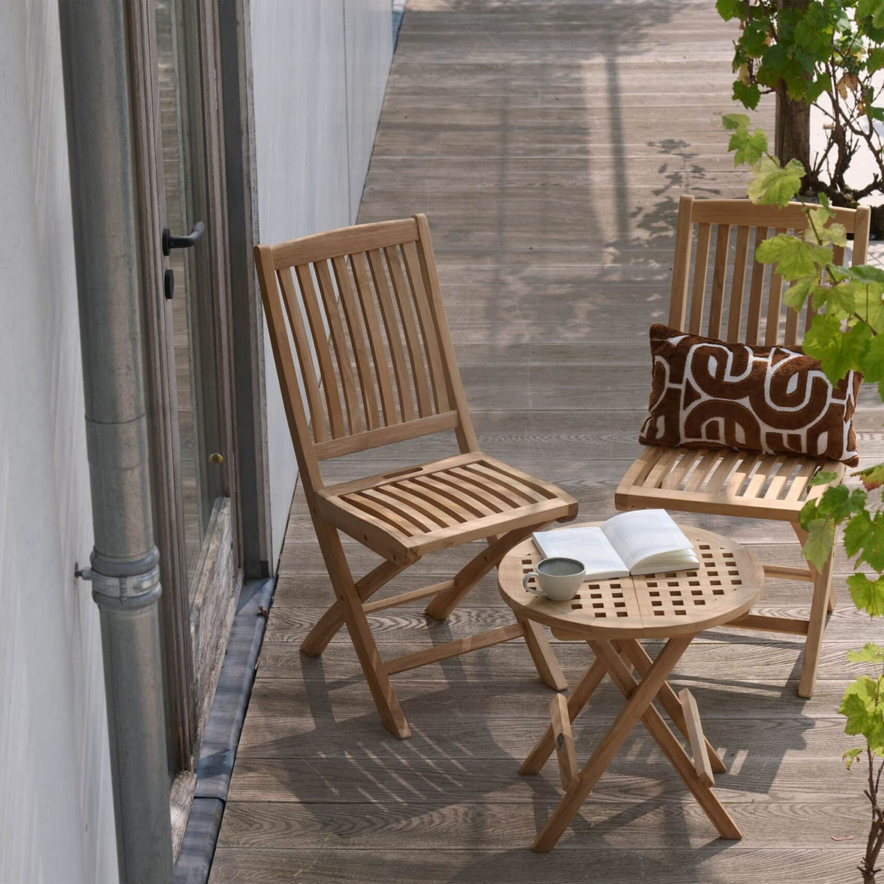 Sammenleggbar stol i teak. Gjør seg godt som spisestol eller i et lite kafésett med to stoler og bord, for eksempel Fredrikshavn bistrobord. Teaken er sertifisert og kommer fra godkjente plantasjer i Indonesia.