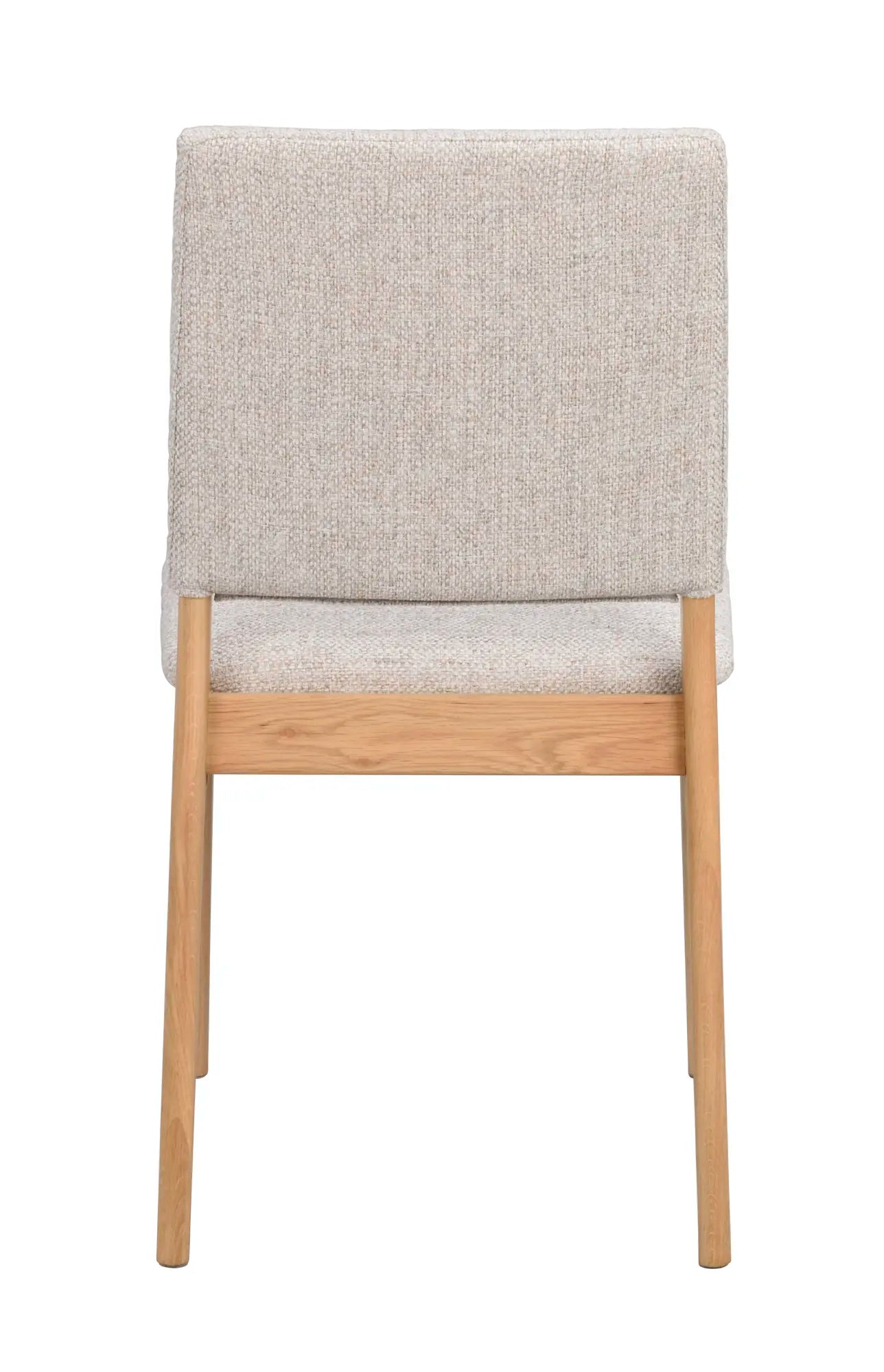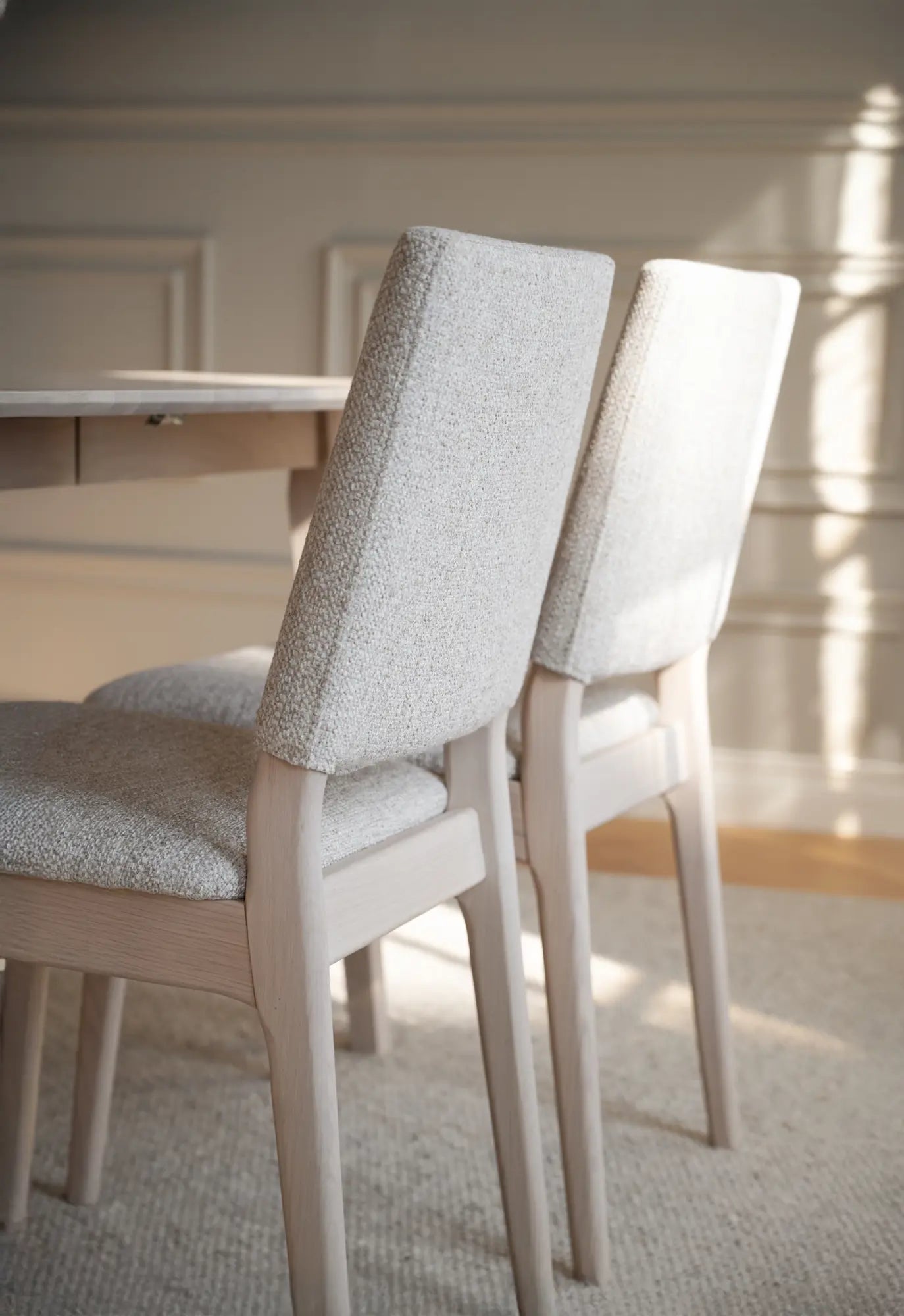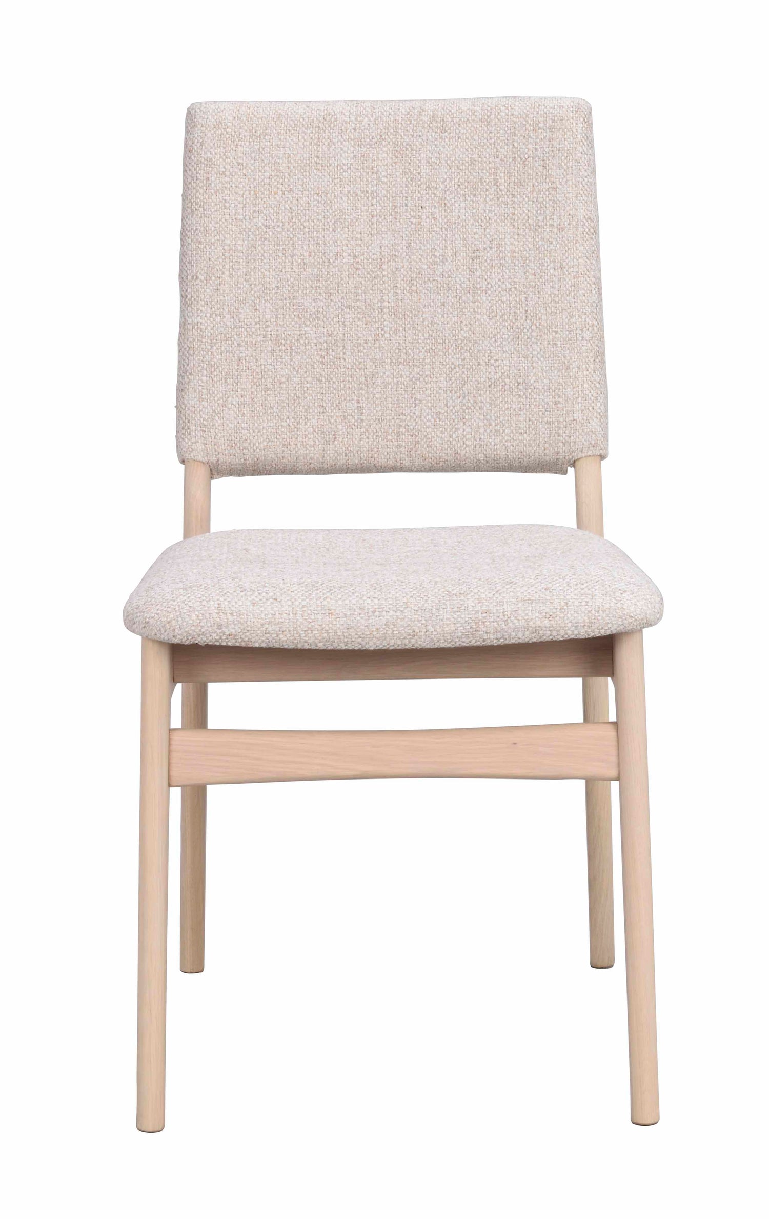 Elegant spisestol utført i solid eik og polstret stoff, med en slank og luftig konstruksjon som gir et stilrent uttrykk. Den balanserte kombinasjonen av myke, avrundede former og rette linjer skaper et harmonisk design som passer like godt i moderne interiør som i mer klassiske hjem. Den rene silhuetten gjør at stolen enkelt kan kombineres med ulike spisebord og øvrige møbler i hjemmet.