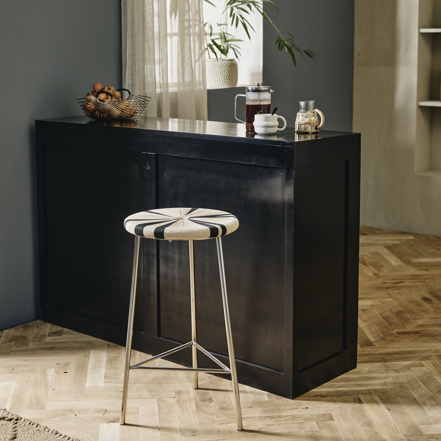 En krakk i perfekt balanse mellom det rå, elegante og moderne designet. MORICE krakken har et vakkert håndflettet sete i naturlige nyanser, hvor det karakteristiske mønsteret skaper et dynamisk og iøynefallende utseende. I kombinasjonen mellom den blanke overflaten og det geometriske setet, gis det et lett uttrykk og et varmt, samt industrielt preg, som tilføres innredningen.