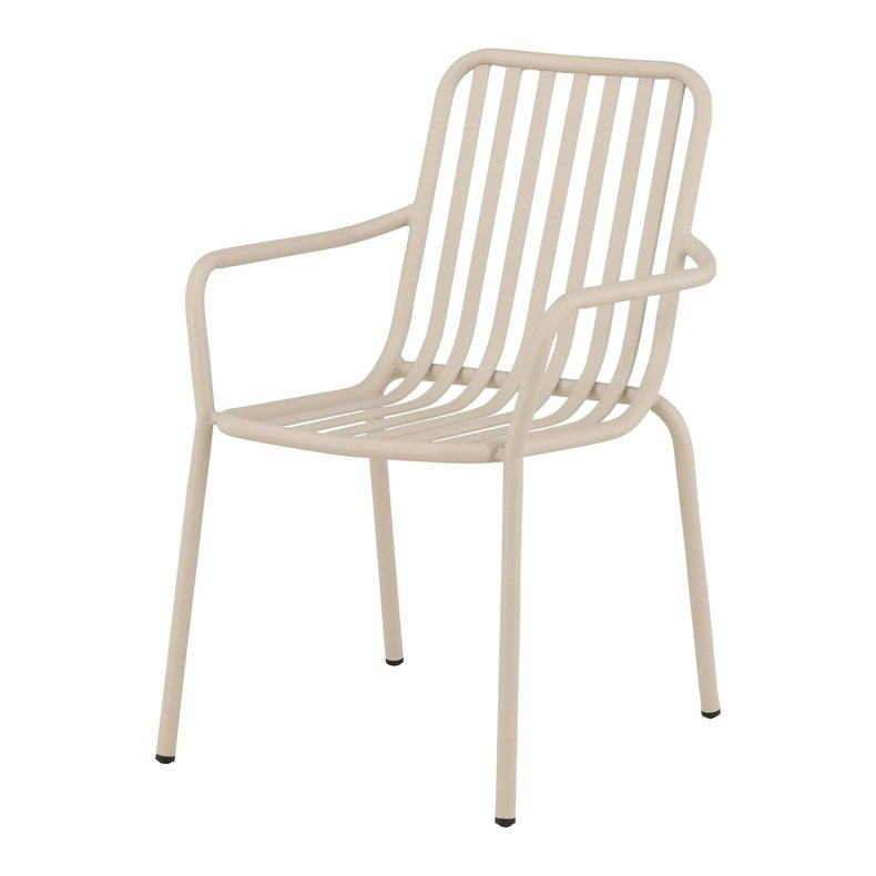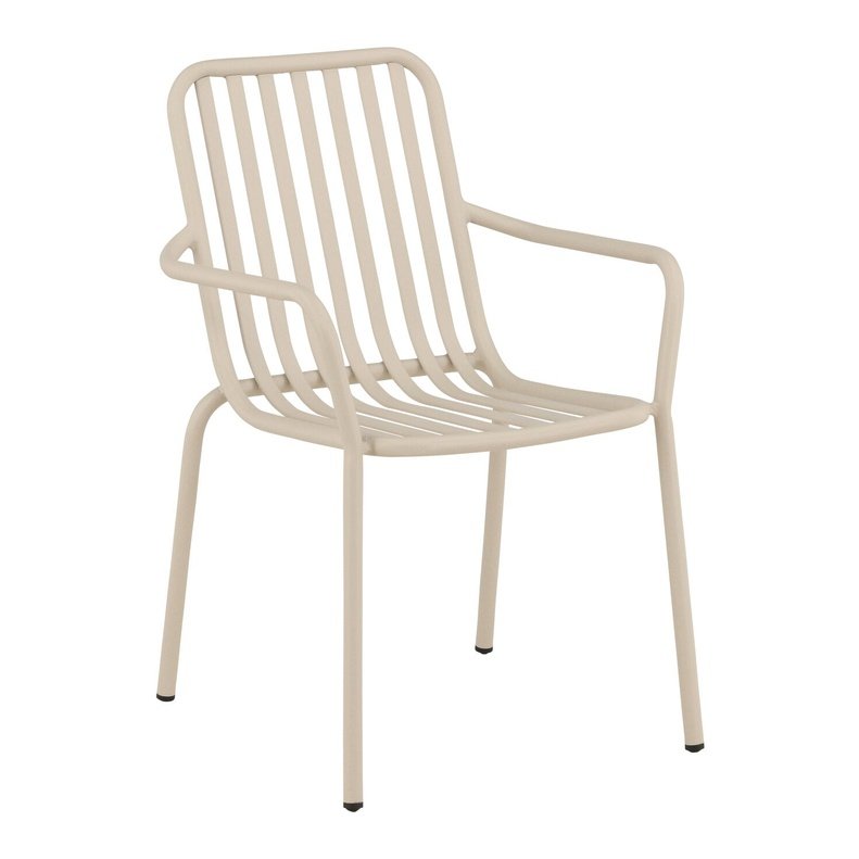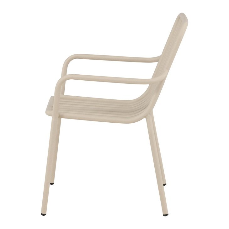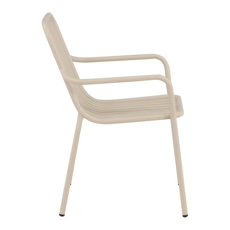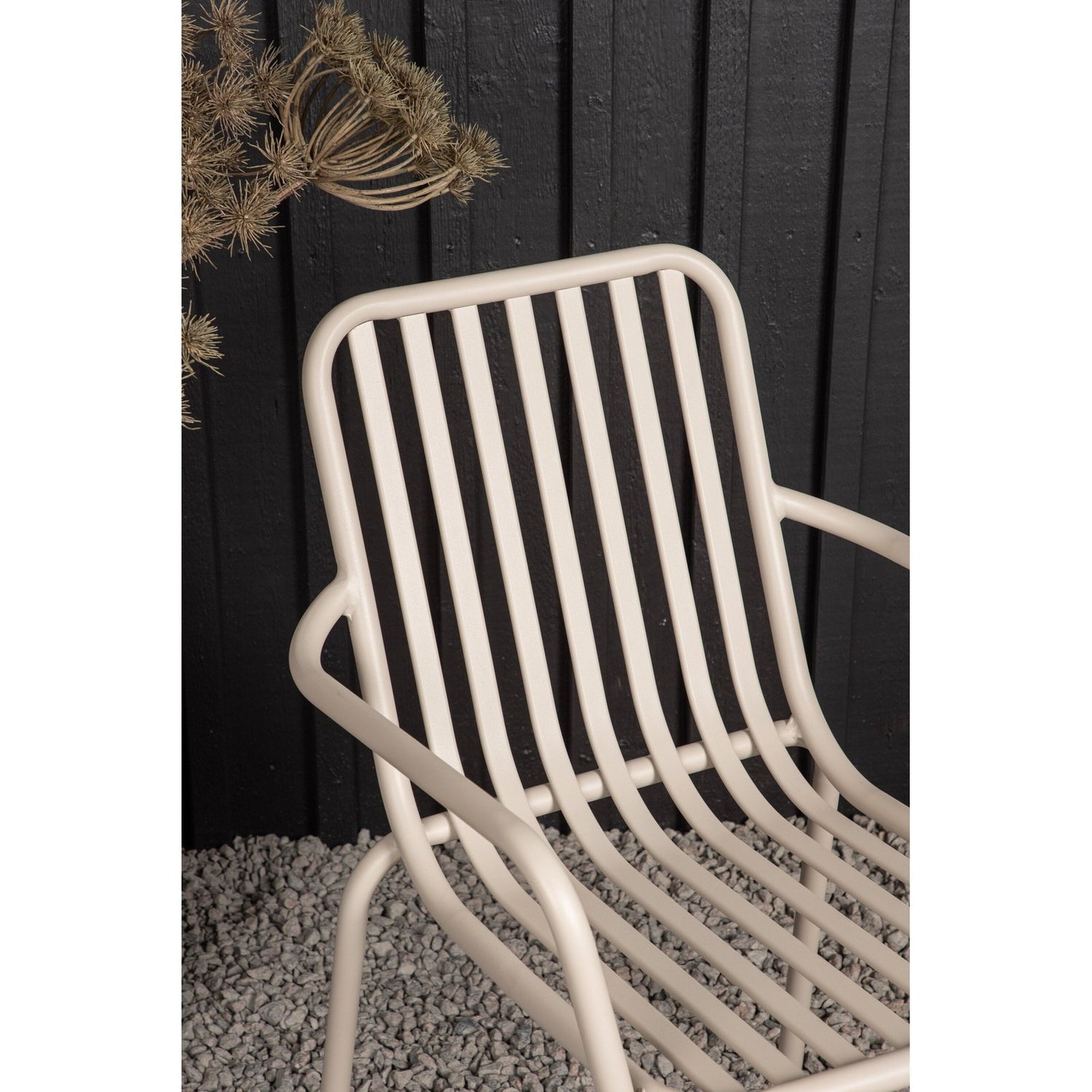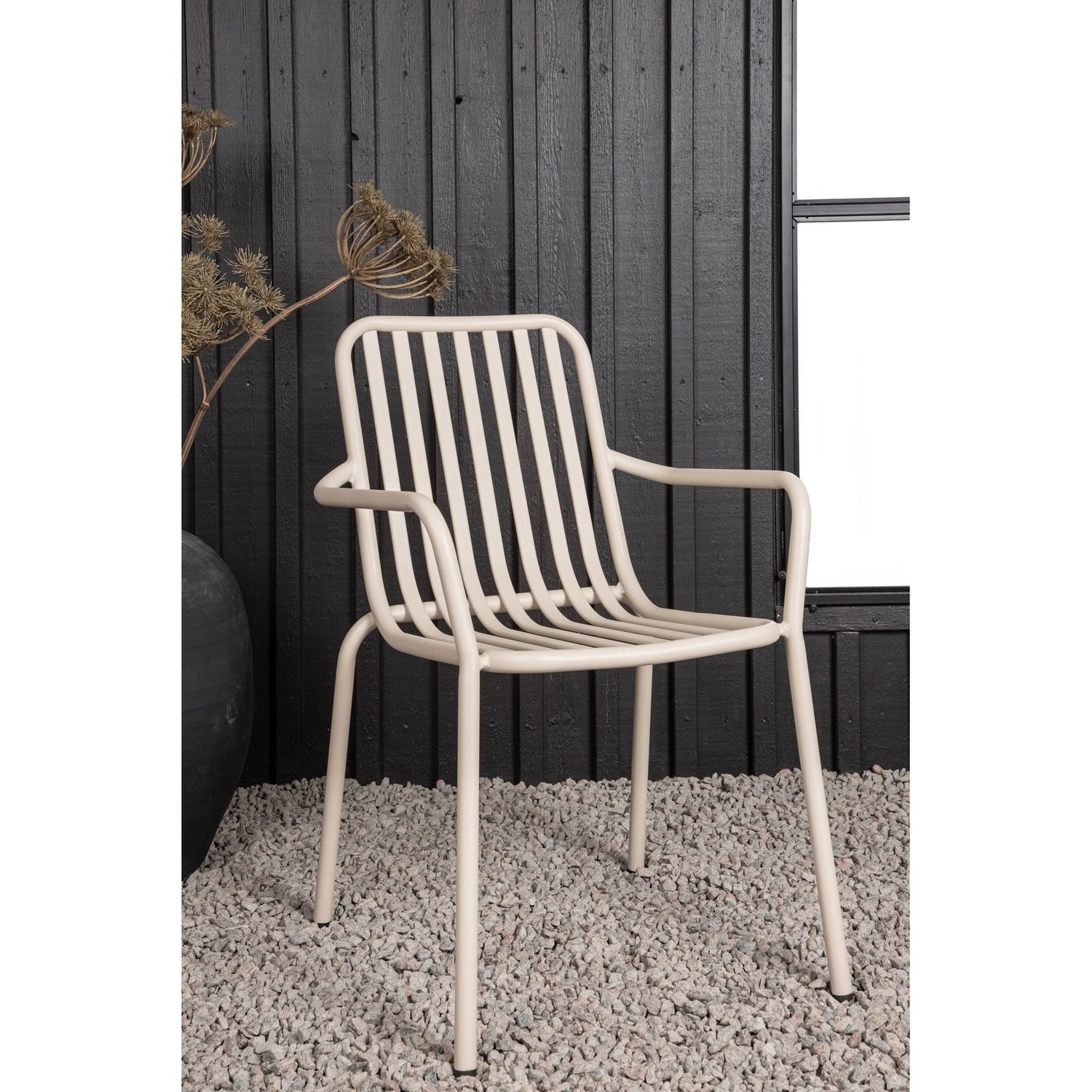 Spisestolen fra Peking-serien skaper raskt en moderne blikkfang på terrassen din! Den rillede designen og den flatterende beige fargen får stolen til å føles både moderne og tidløs. Laget av aluminium som gjør det enkelt å flytte rundt og integrerte armlener for ekstra komfort. Bli sittende lenge og nyt hyggelige måltider! Stolen er stabelbar.