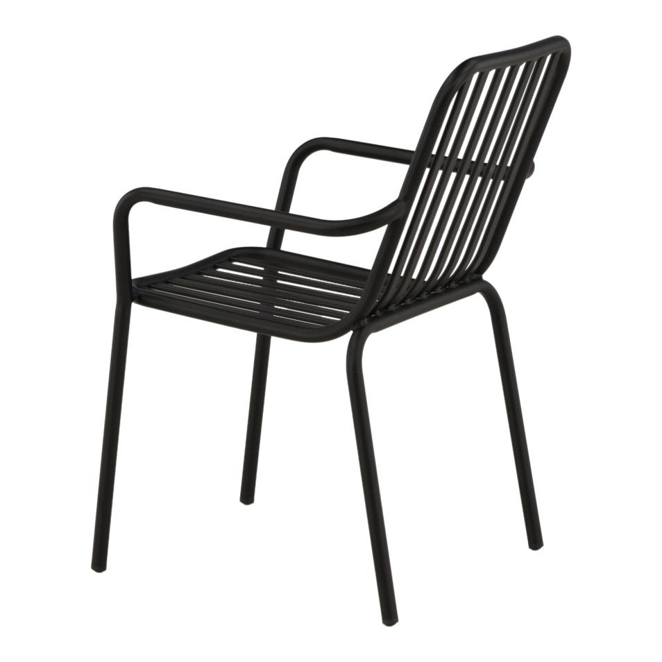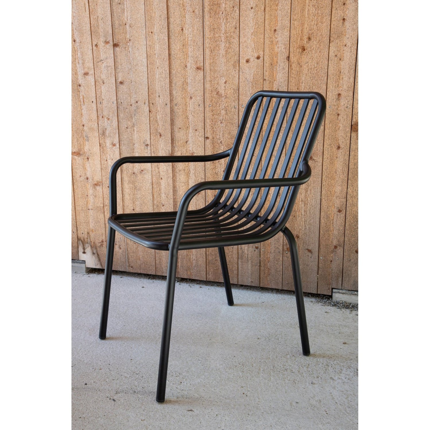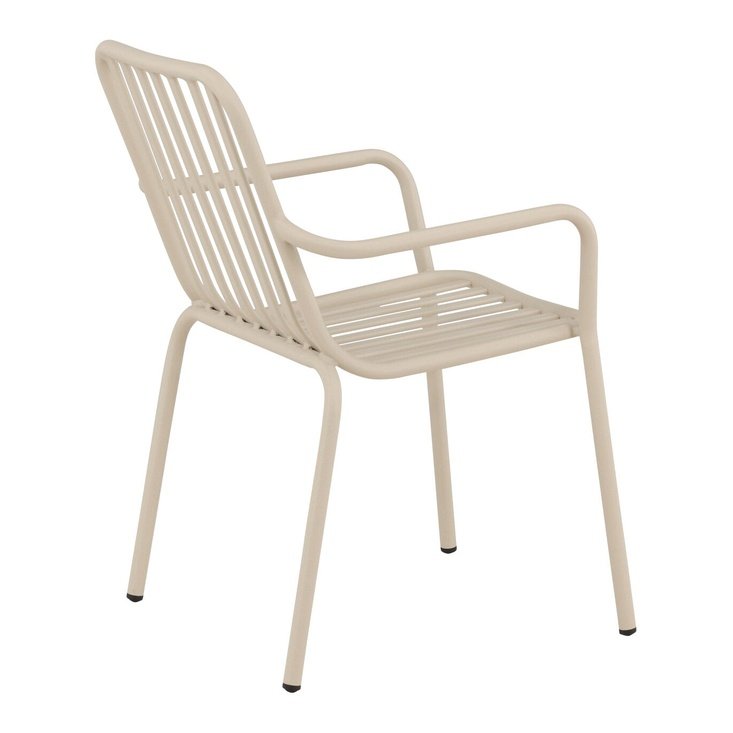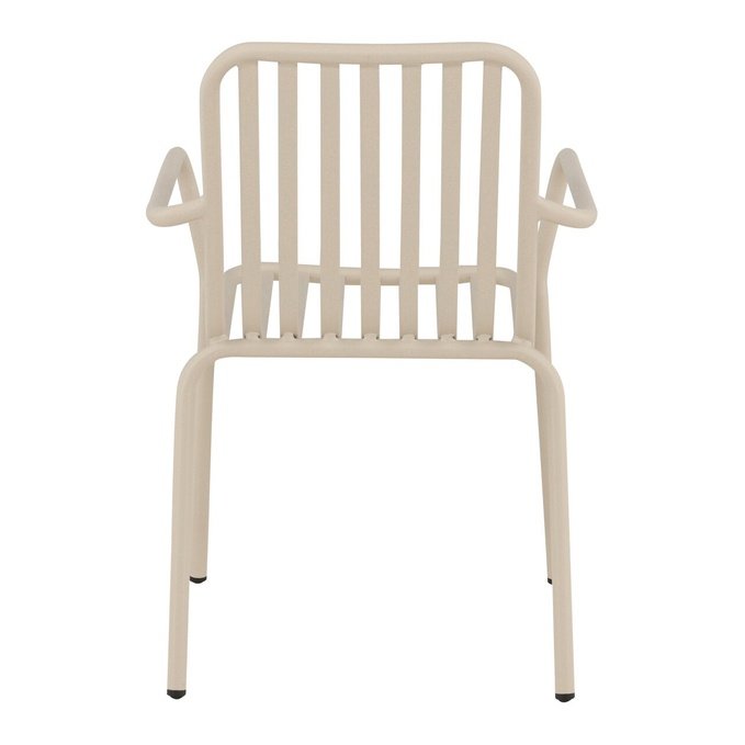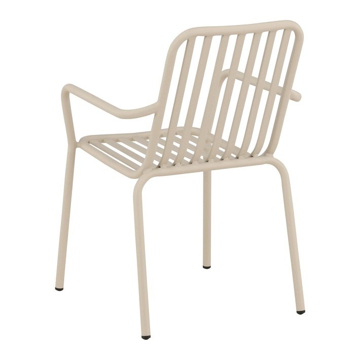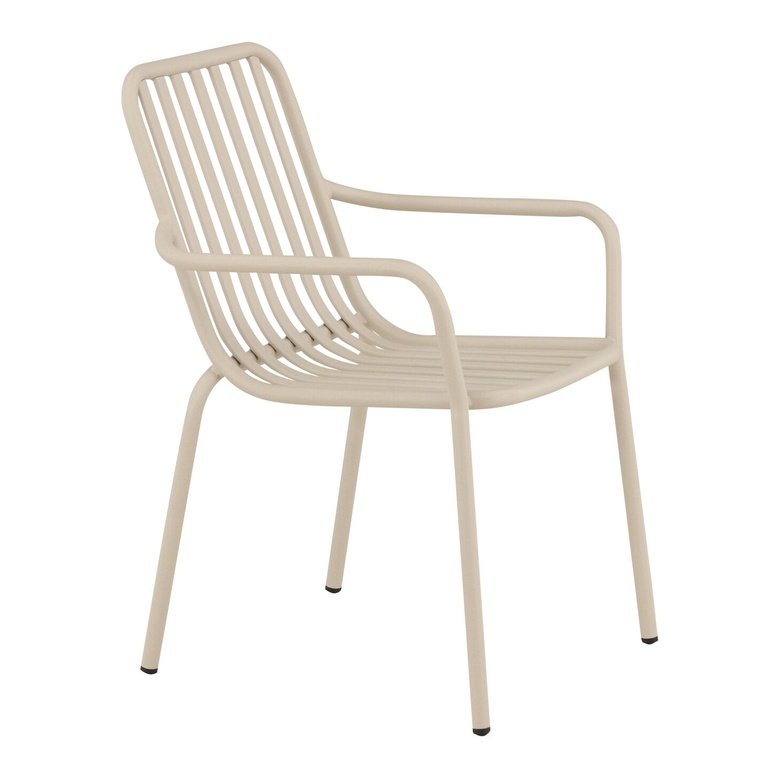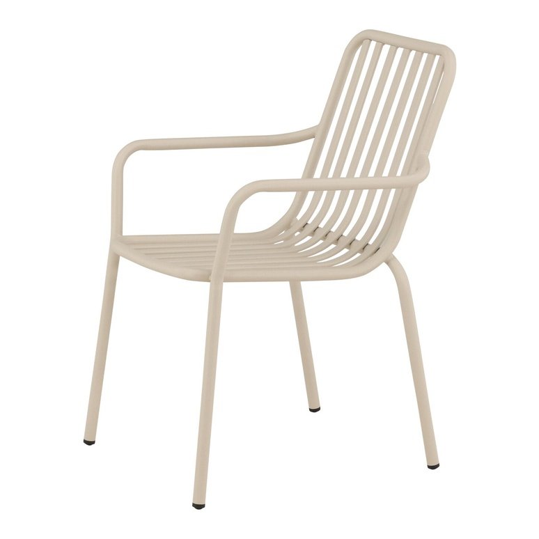 Spisestolen fra Peking-serien skaper raskt en moderne blikkfang på terrassen din! Den rillede designen og den flatterende beige fargen får stolen til å føles både moderne og tidløs. Laget av aluminium som gjør det enkelt å flytte rundt og integrerte armlener for ekstra komfort. Bli sittende lenge og nyt hyggelige måltider! Stolen er stabelbar.