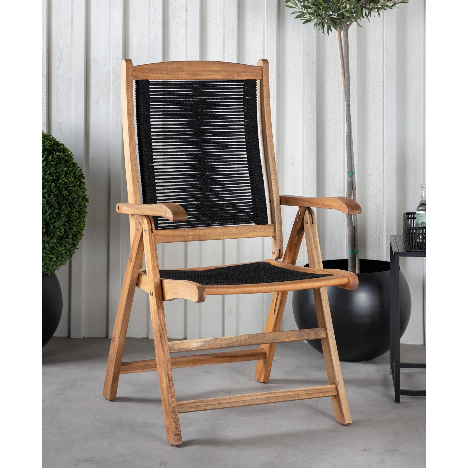 Stolen er garantert å være et blikkfang på balkongen takket være sin stilige konstruksjon i akasie og sete i slitesterk svart tau. En sammenleggbar spisestol som garantert vil gi terrassen et pompøst uttrykk.