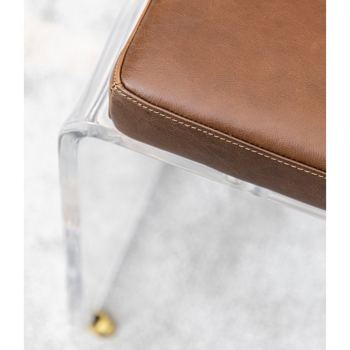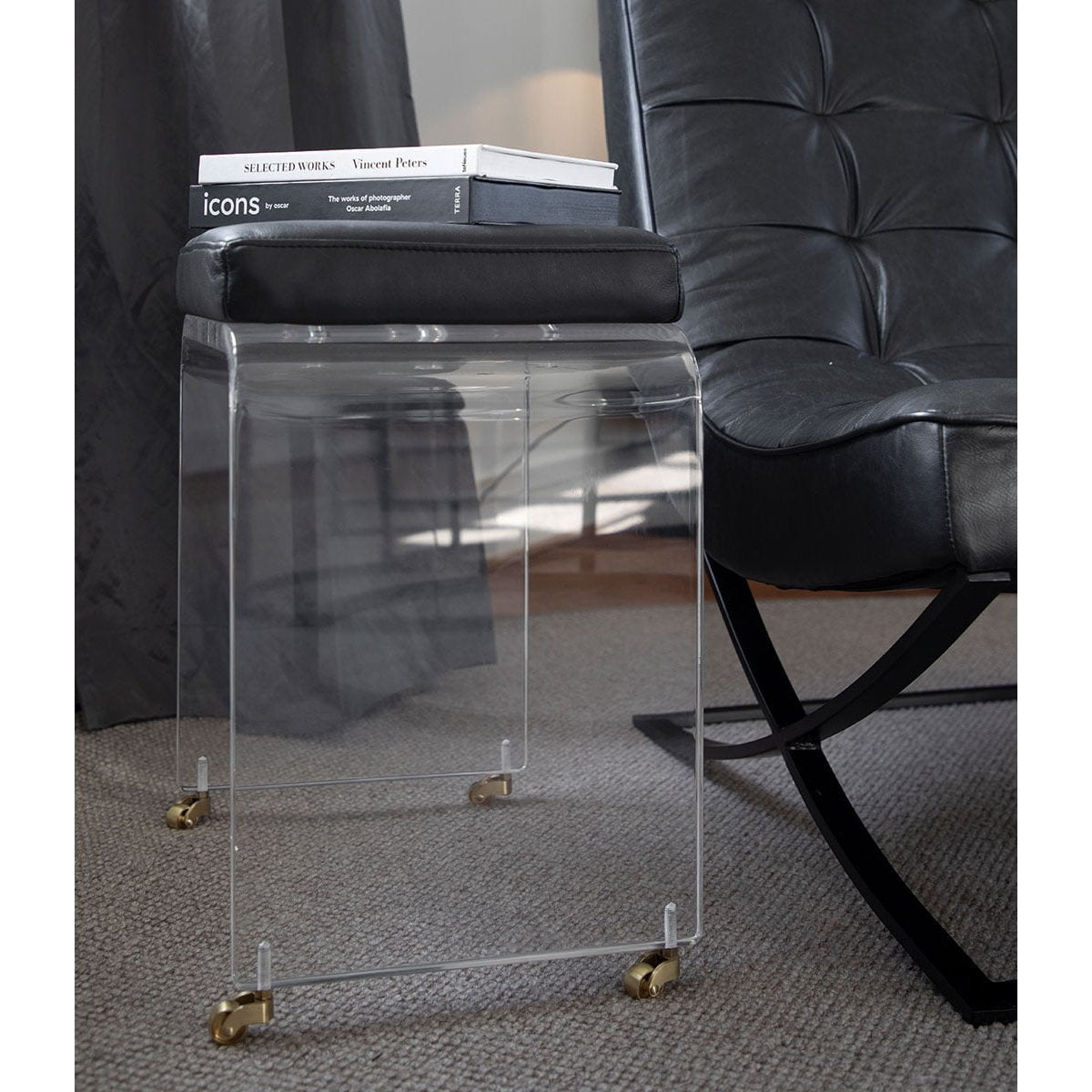 En fotpall i plexiglass med moderne design og funksjonell komfort. Den transparente plexiglass-rammen gir et luftig og stilrent inntrykk, mens den myke puten i ekte lær tilbyr overlegen komfort. Med messingfargede hjul for enkel bevegelse blir denne fotpallen både praktisk og estetisk tiltalende. Perfekt for ethvert rom!