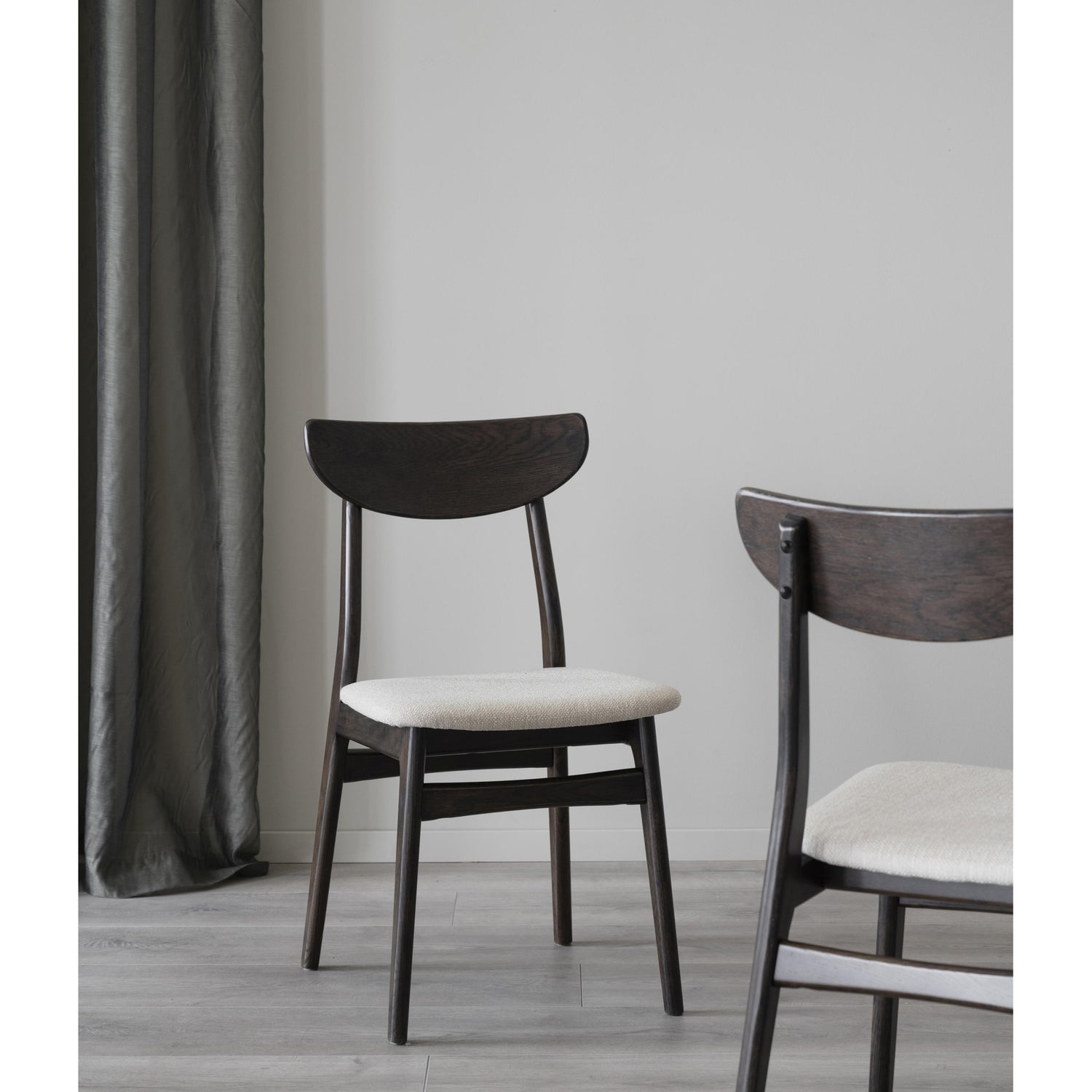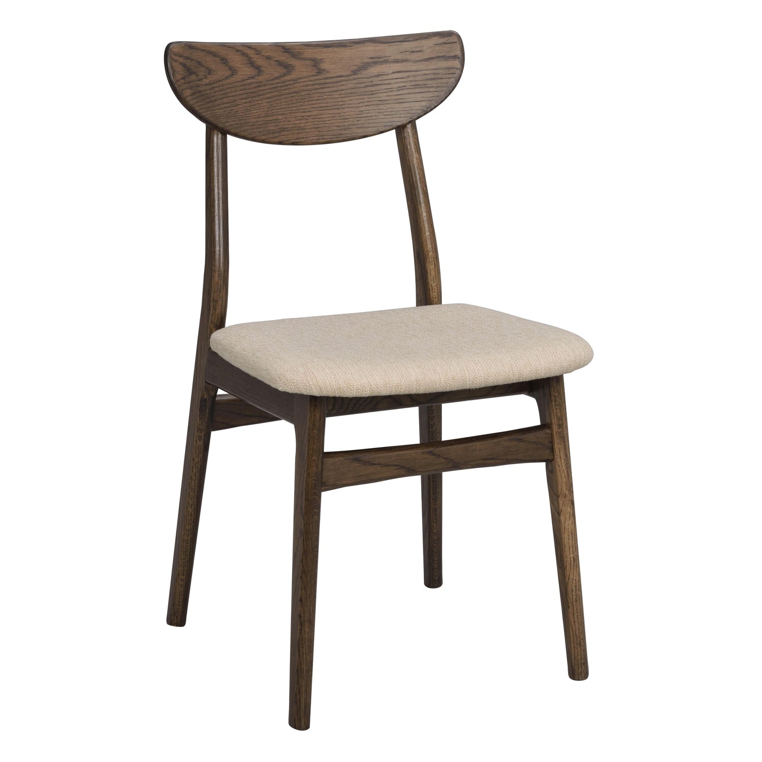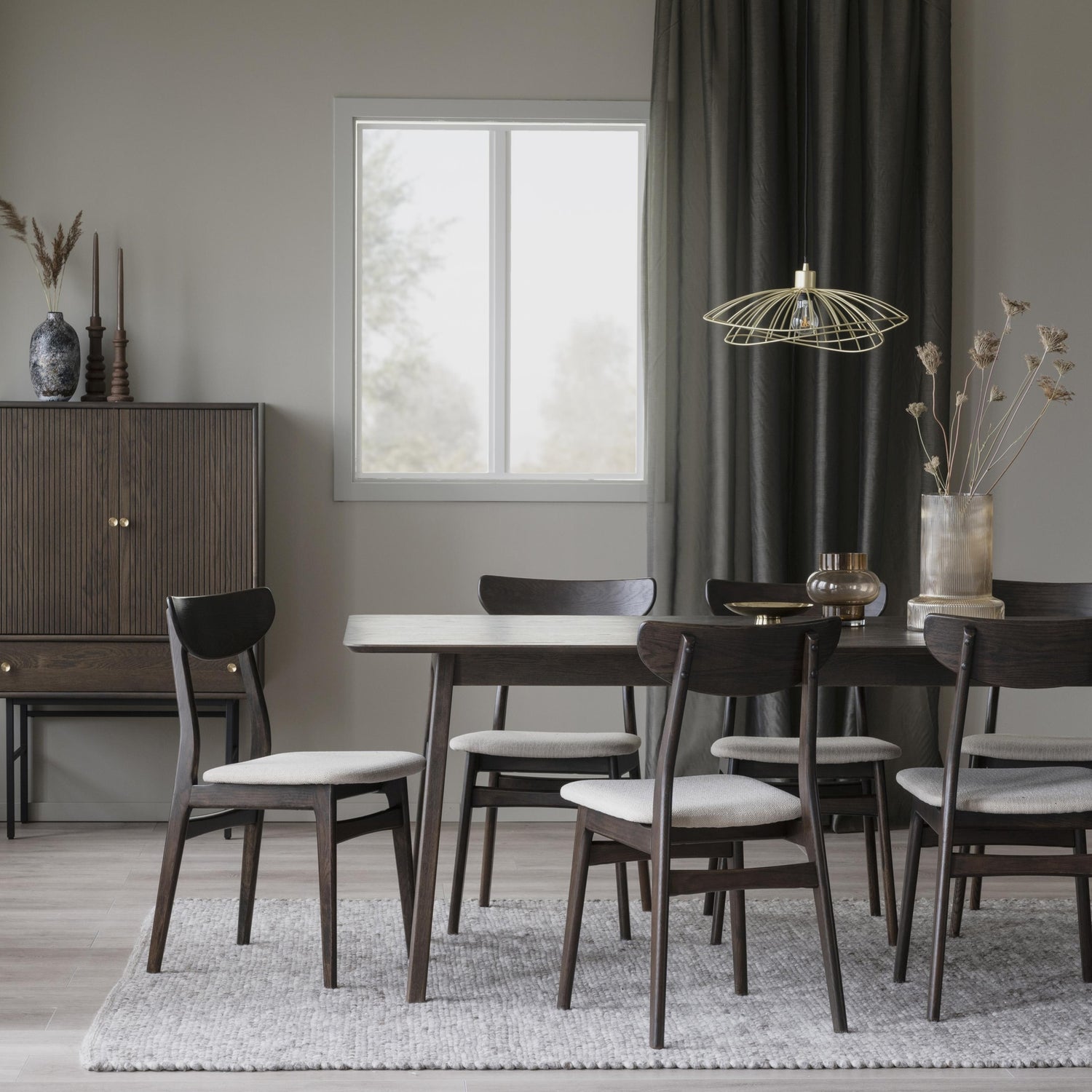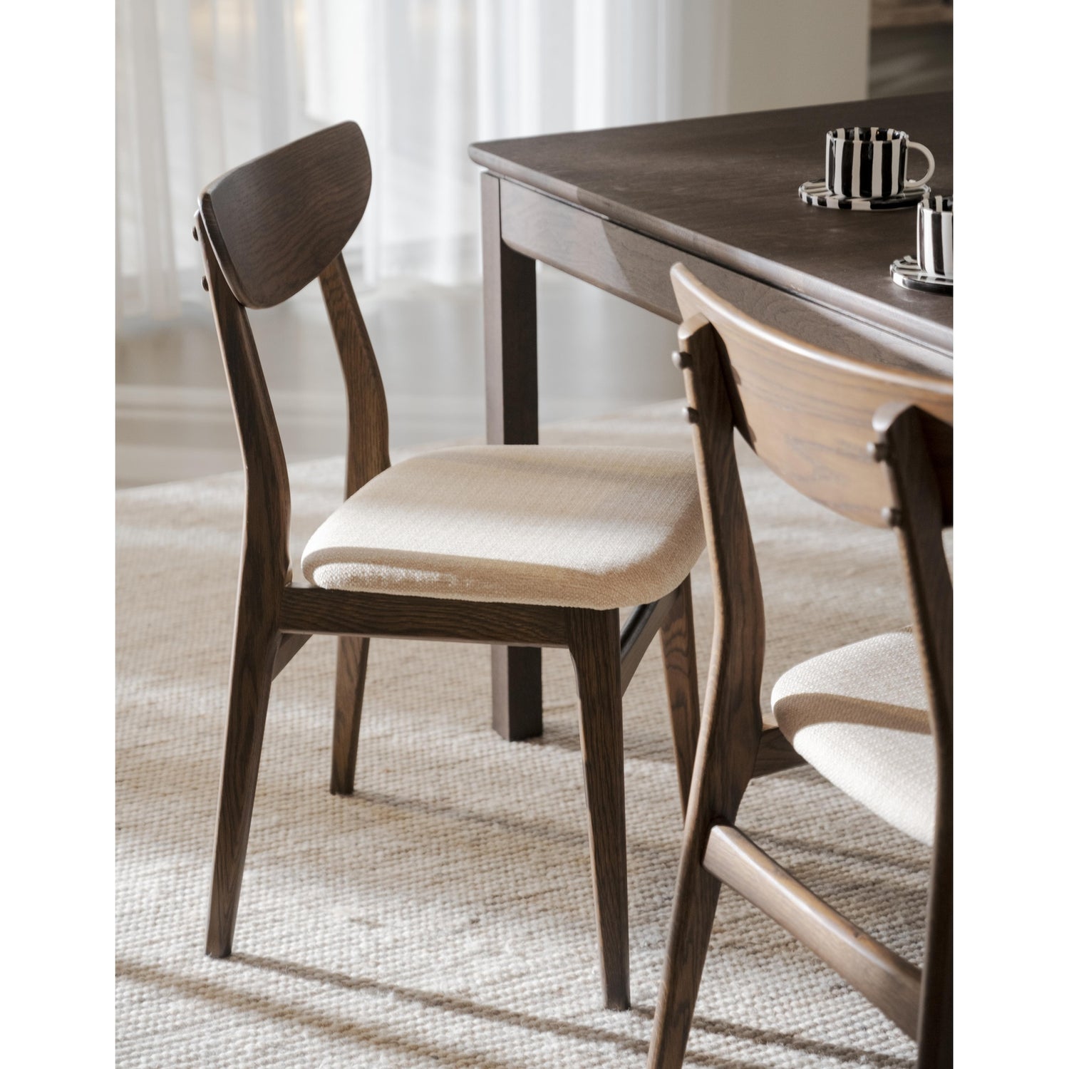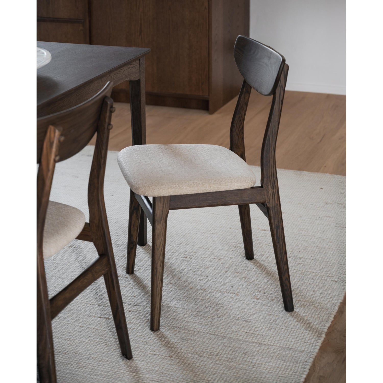 Rodham spisestol i brun eik med beige sete er en stilren og tidløs stol som kombinerer moderne design med klassisk eleganse. Stolen er laget av solid eik i både ramme og ryggstøtte, noe som gir høy kvalitet og lang holdbarhet. Det polstrede setet er kledd i et elegant stoff som gir god sittekomfort og et eksklusivt uttrykk. Rodham spisestol finnes i flere naturlige farger og passer perfekt sammen med spisebord som Tyler, Gardner Emmet og flere.
