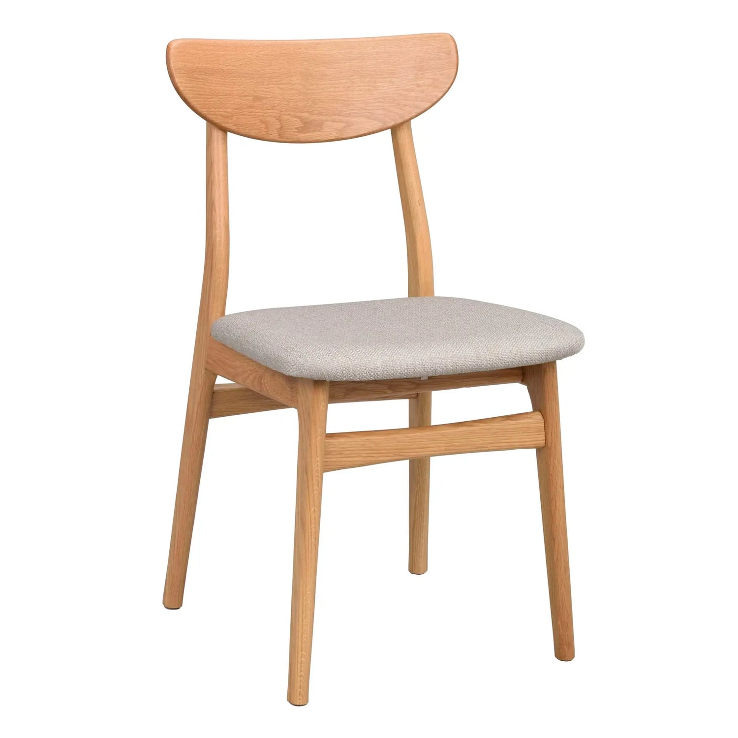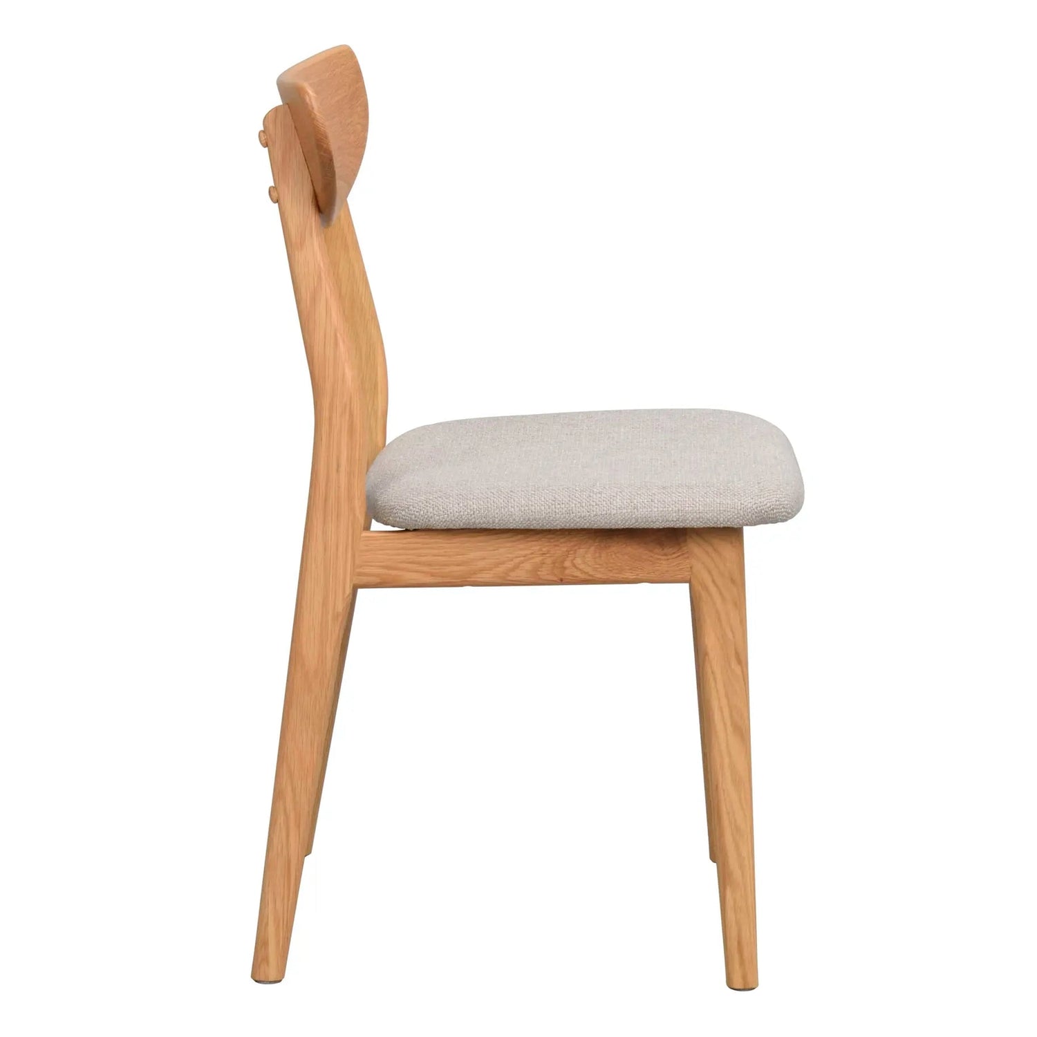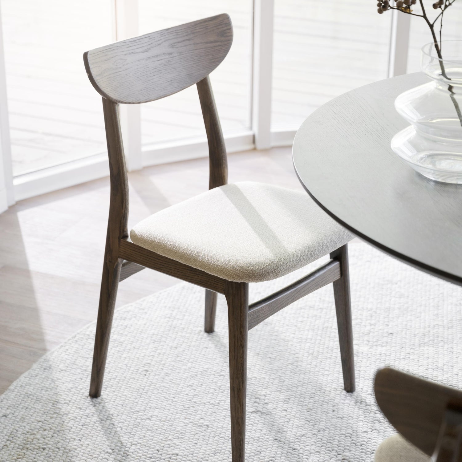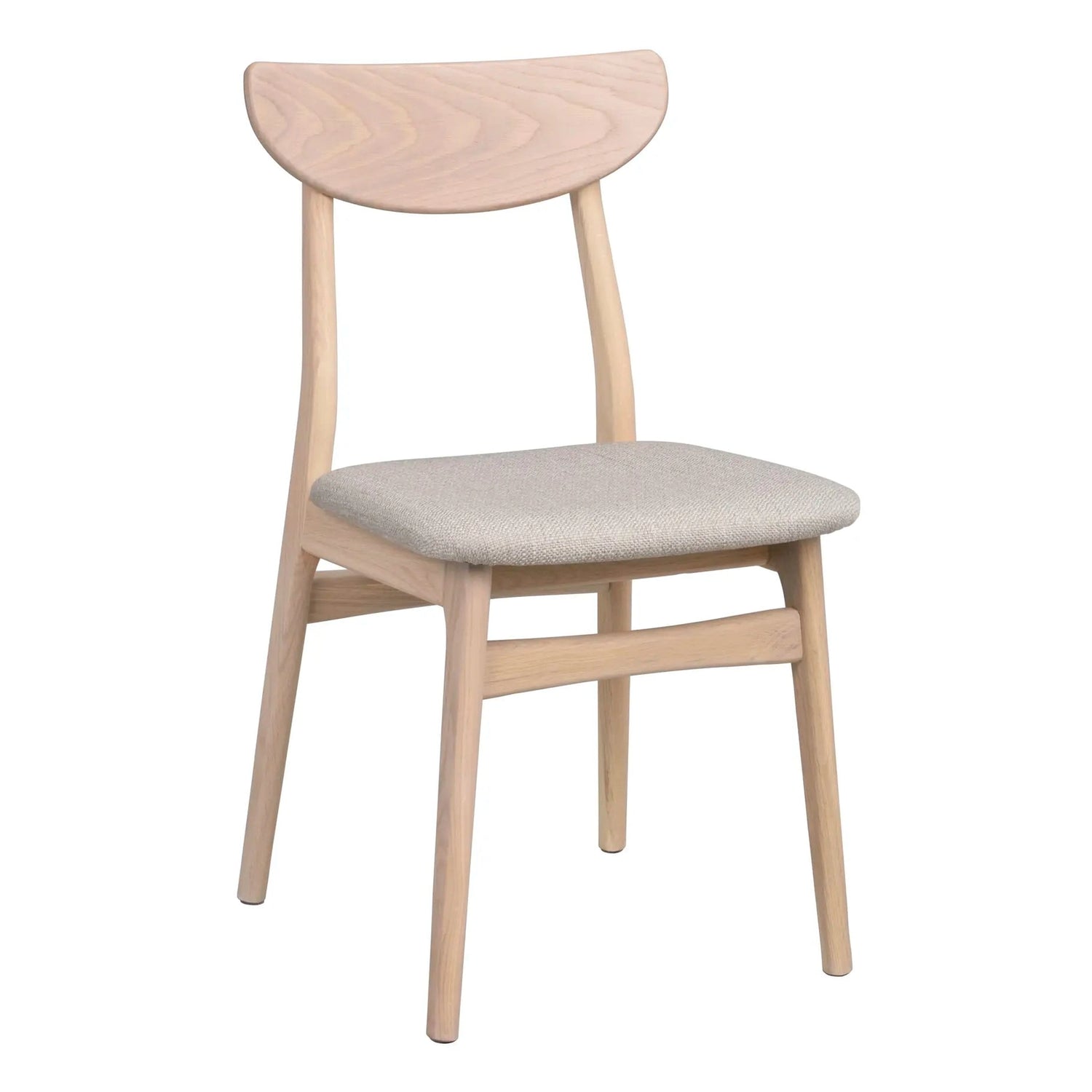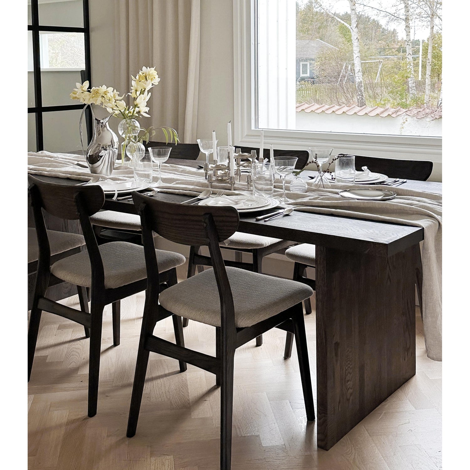 Rodham spisestol i brun eik med beige sete er en stilren og tidløs stol som kombinerer moderne design med klassisk eleganse. Stolen er laget av solid eik i både ramme og ryggstøtte, noe som gir høy kvalitet og lang holdbarhet. Det polstrede setet er kledd i et elegant stoff som gir god sittekomfort og et eksklusivt uttrykk. Rodham spisestol finnes i flere naturlige farger og passer perfekt sammen med spisebord som Tyler, Gardner Emmet og flere.