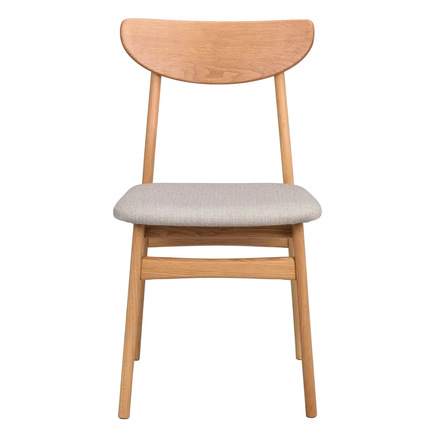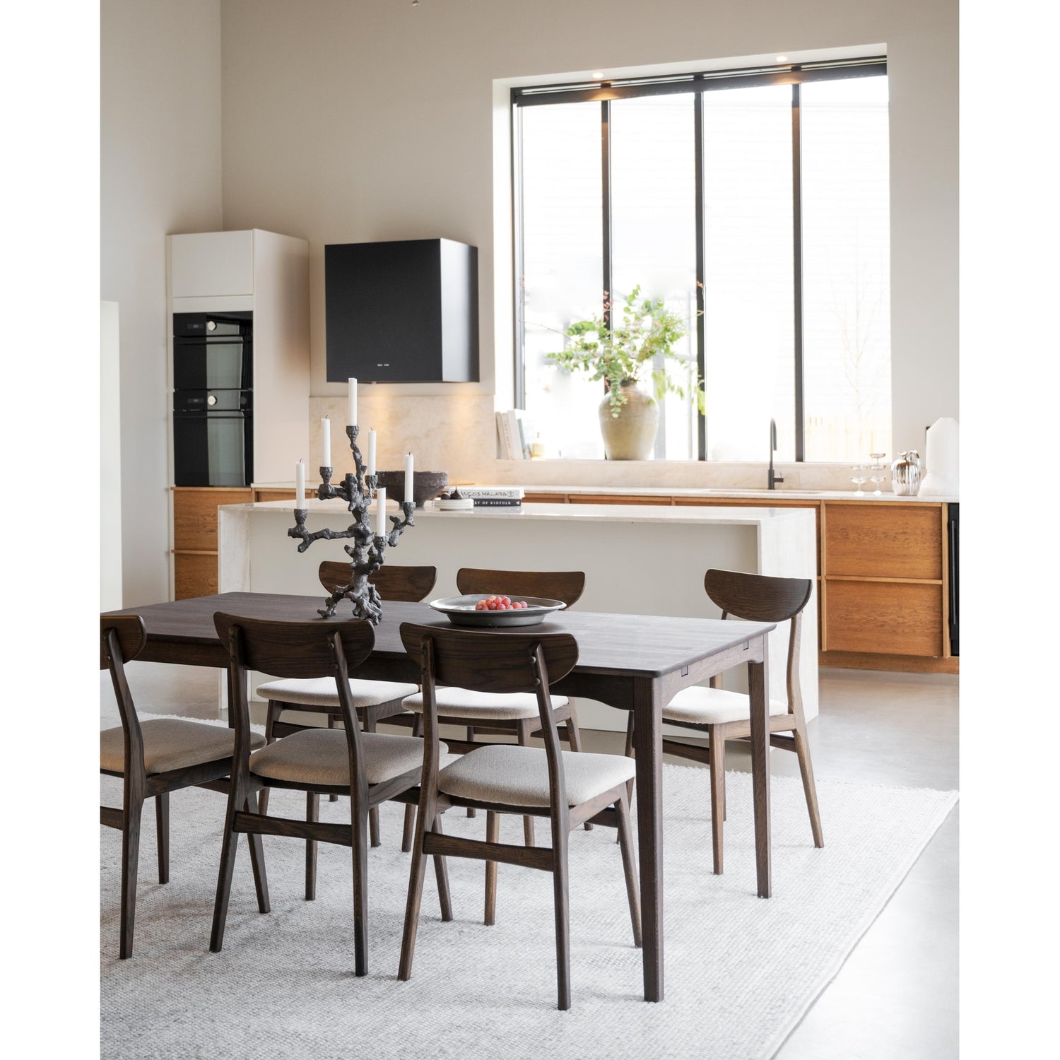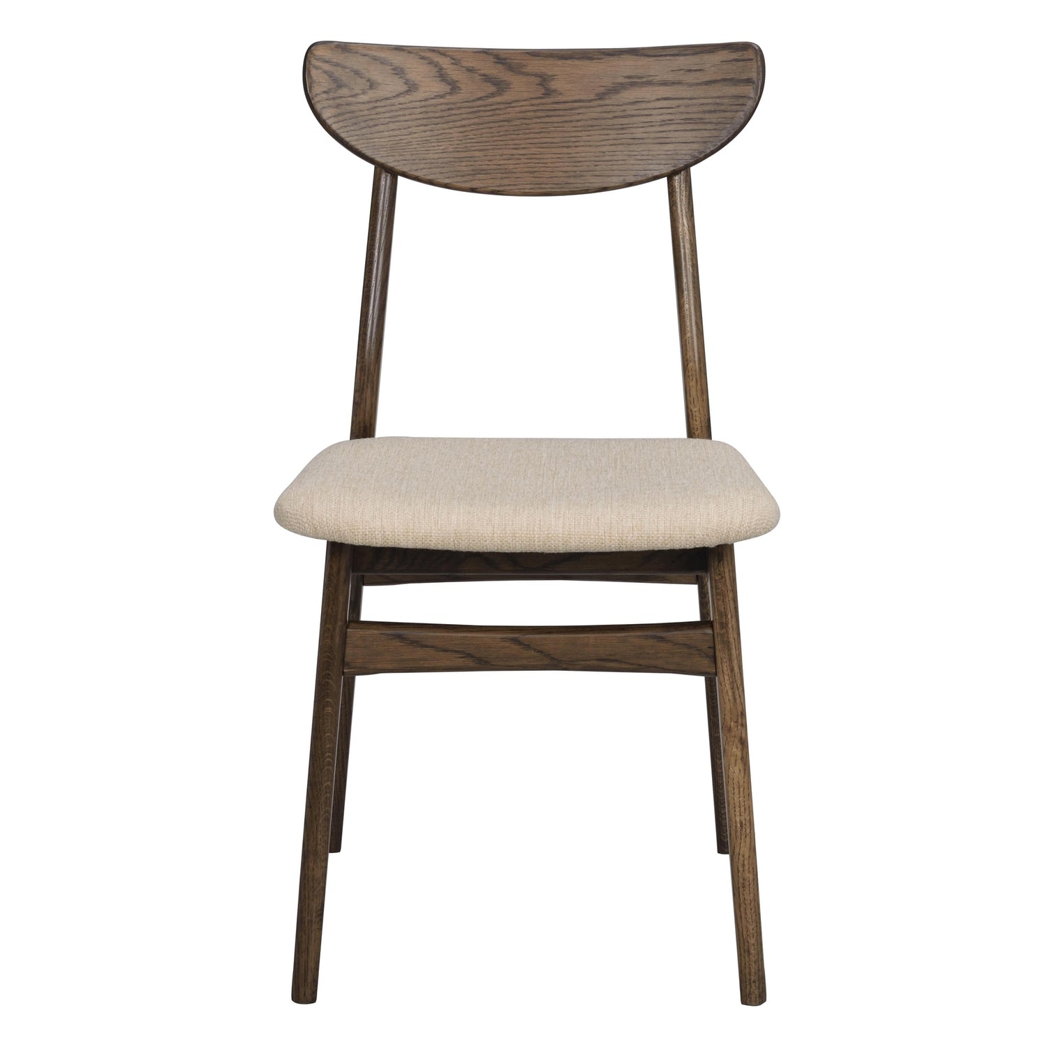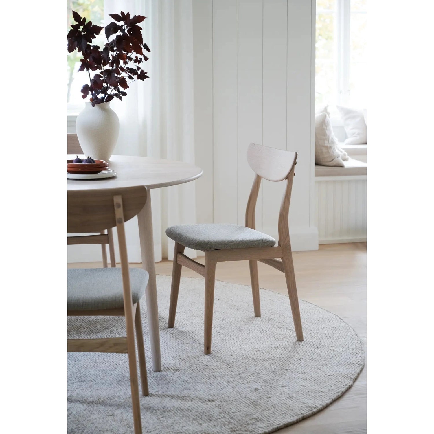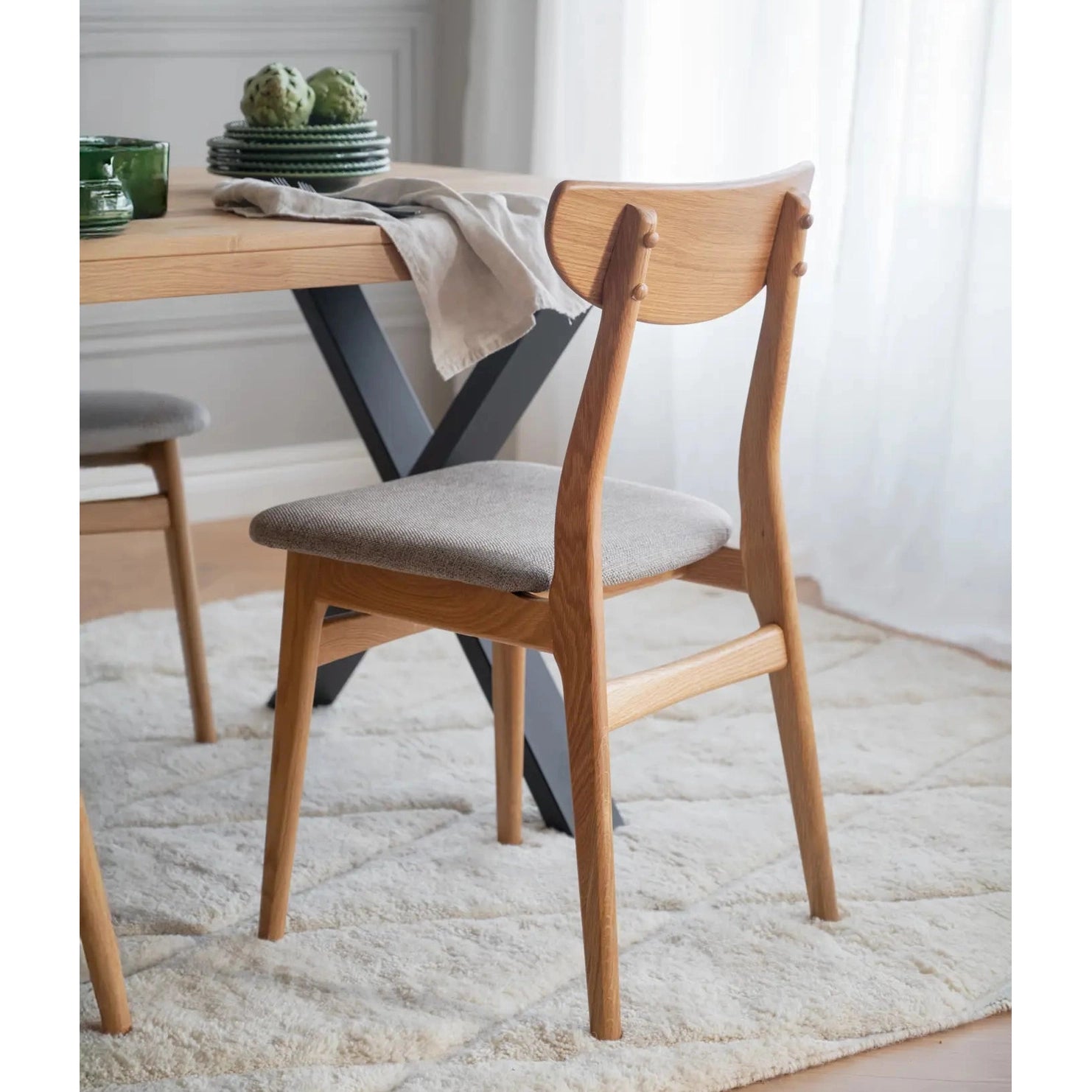 Rodham spisestol i brun eik med beige sete er en stilren og tidløs stol som kombinerer moderne design med klassisk eleganse. Stolen er laget av solid eik i både ramme og ryggstøtte, noe som gir høy kvalitet og lang holdbarhet. Det polstrede setet er kledd i et elegant stoff som gir god sittekomfort og et eksklusivt uttrykk. Rodham spisestol finnes i flere naturlige farger og passer perfekt sammen med spisebord som Tyler, Gardner Emmet og flere.