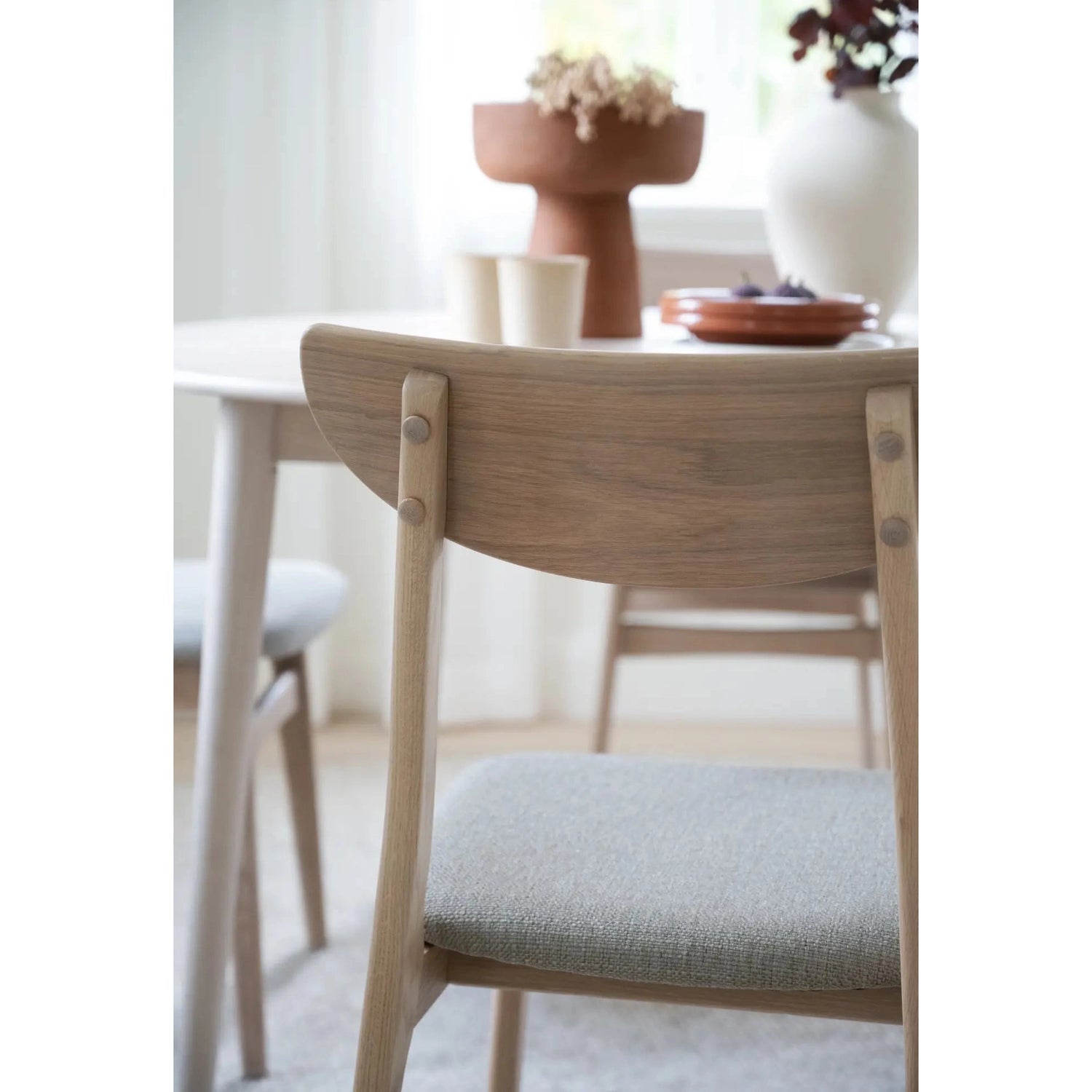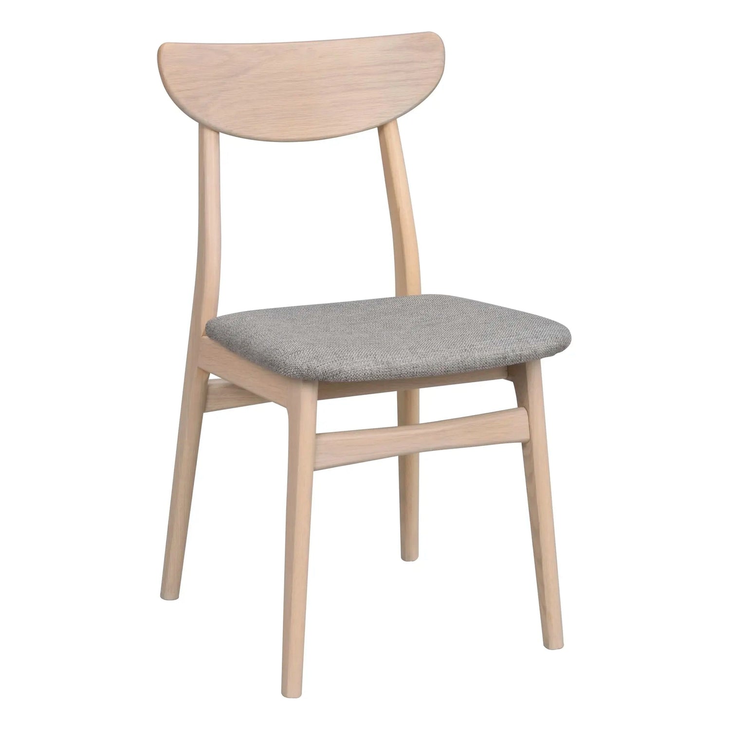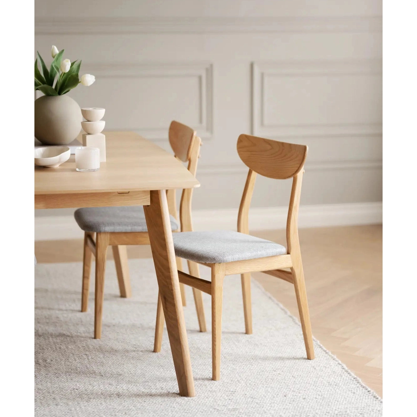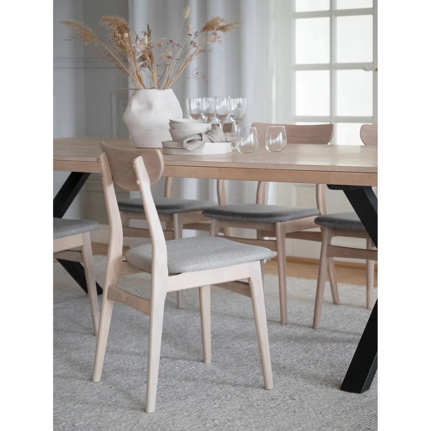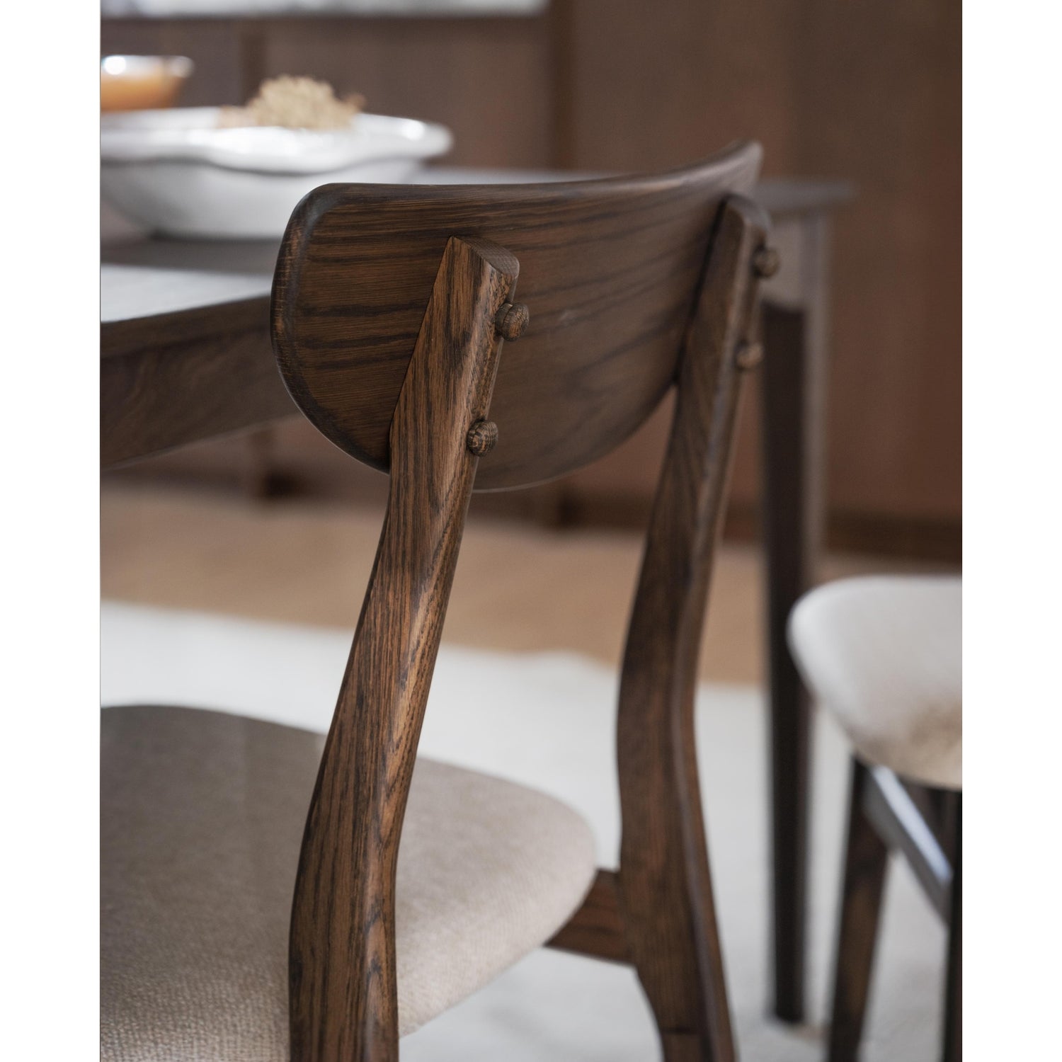Rodham spisestol i brun eik med beige sete er en stilren og tidløs stol som kombinerer moderne design med klassisk eleganse. Stolen er laget av solid eik i både ramme og ryggstøtte, noe som gir høy kvalitet og lang holdbarhet. Det polstrede setet er kledd i et elegant stoff som gir god sittekomfort og et eksklusivt uttrykk. Rodham spisestol finnes i flere naturlige farger og passer perfekt sammen med spisebord som Tyler, Gardner Emmet og flere.