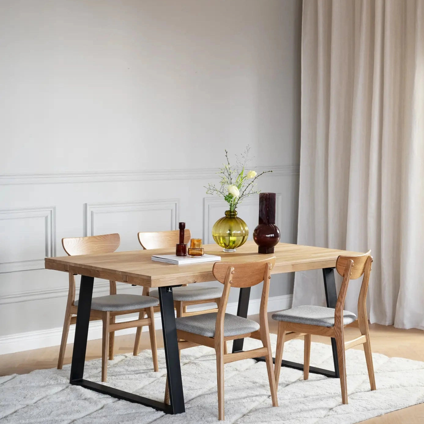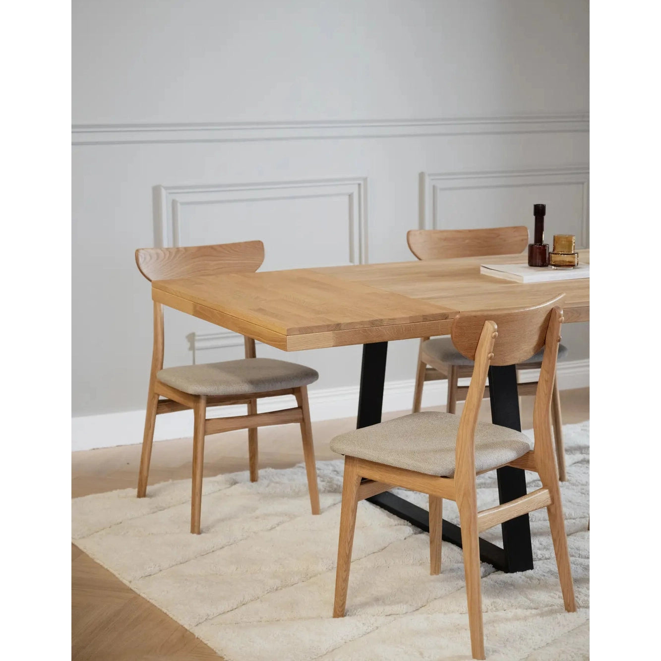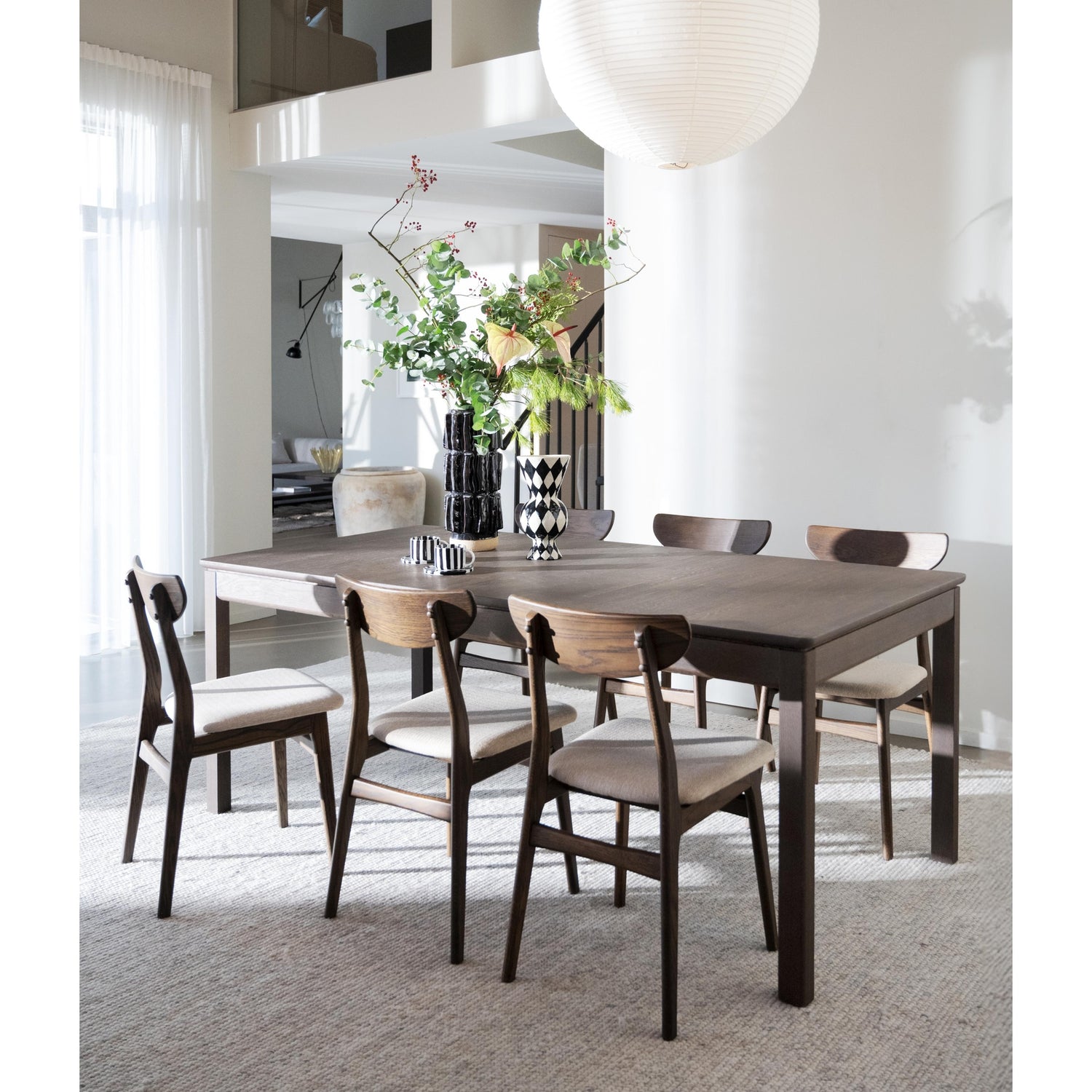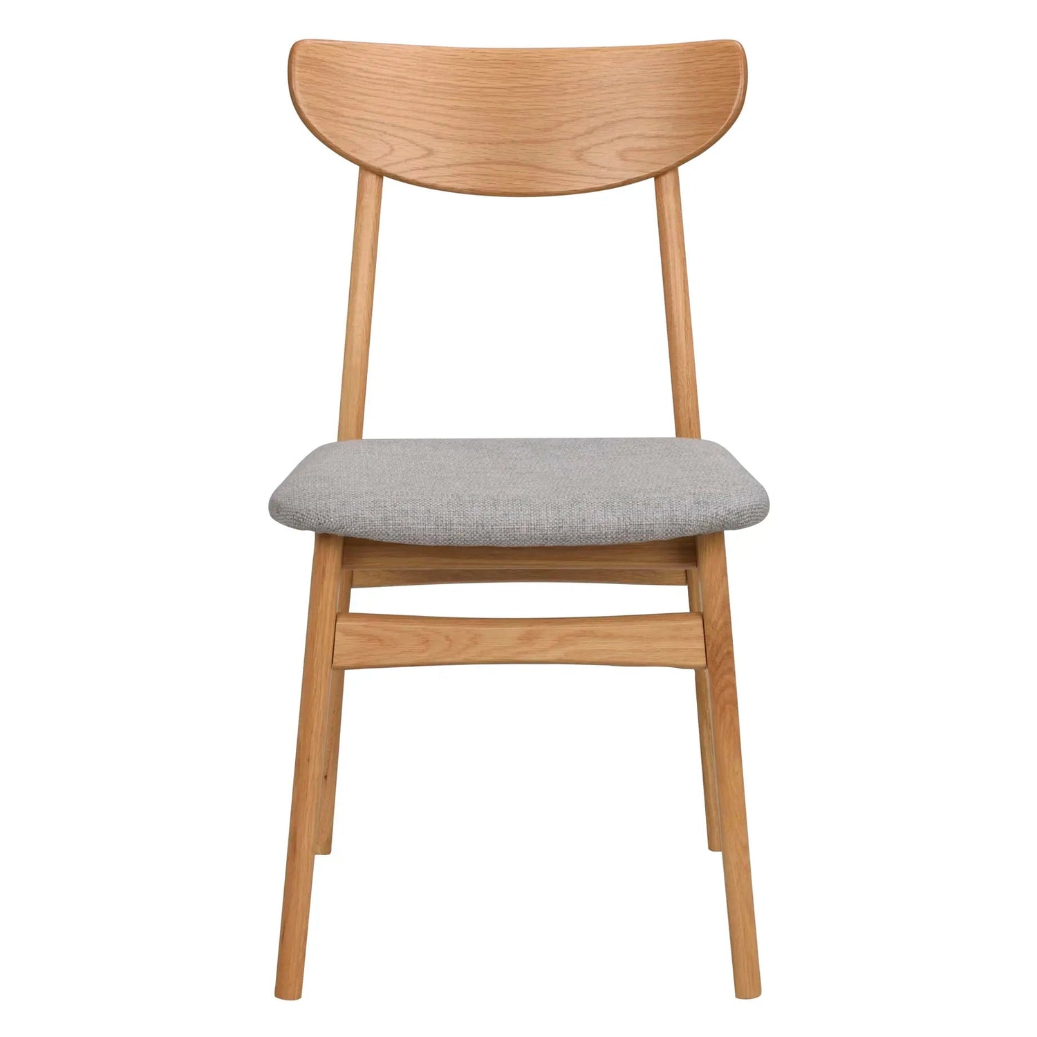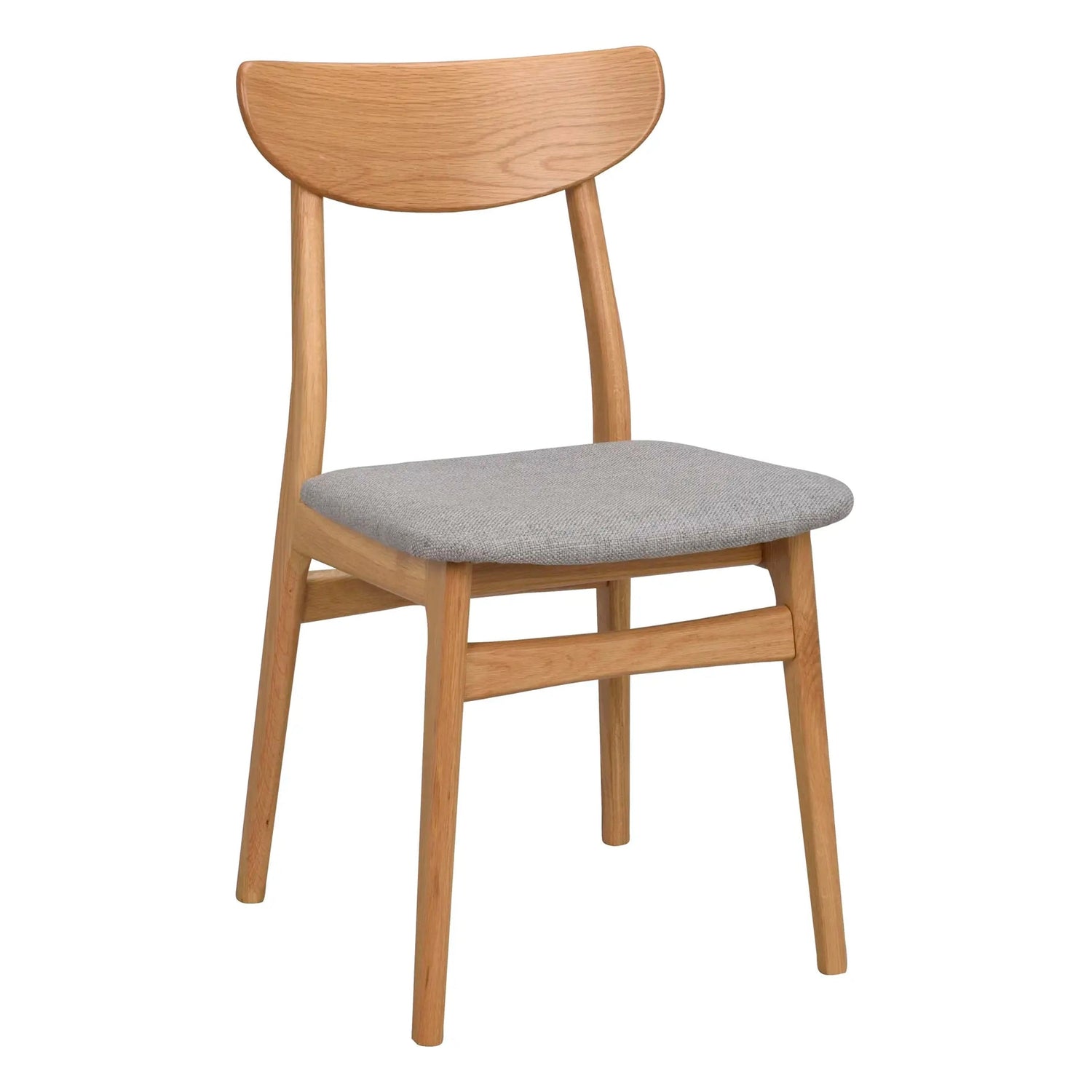 Rodham spisestol i brun eik med beige sete er en stilren og tidløs stol som kombinerer moderne design med klassisk eleganse. Stolen er laget av solid eik i både ramme og ryggstøtte, noe som gir høy kvalitet og lang holdbarhet. Det polstrede setet er kledd i et elegant stoff som gir god sittekomfort og et eksklusivt uttrykk. Rodham spisestol finnes i flere naturlige farger og passer perfekt sammen med spisebord som Tyler, Gardner Emmet og flere.