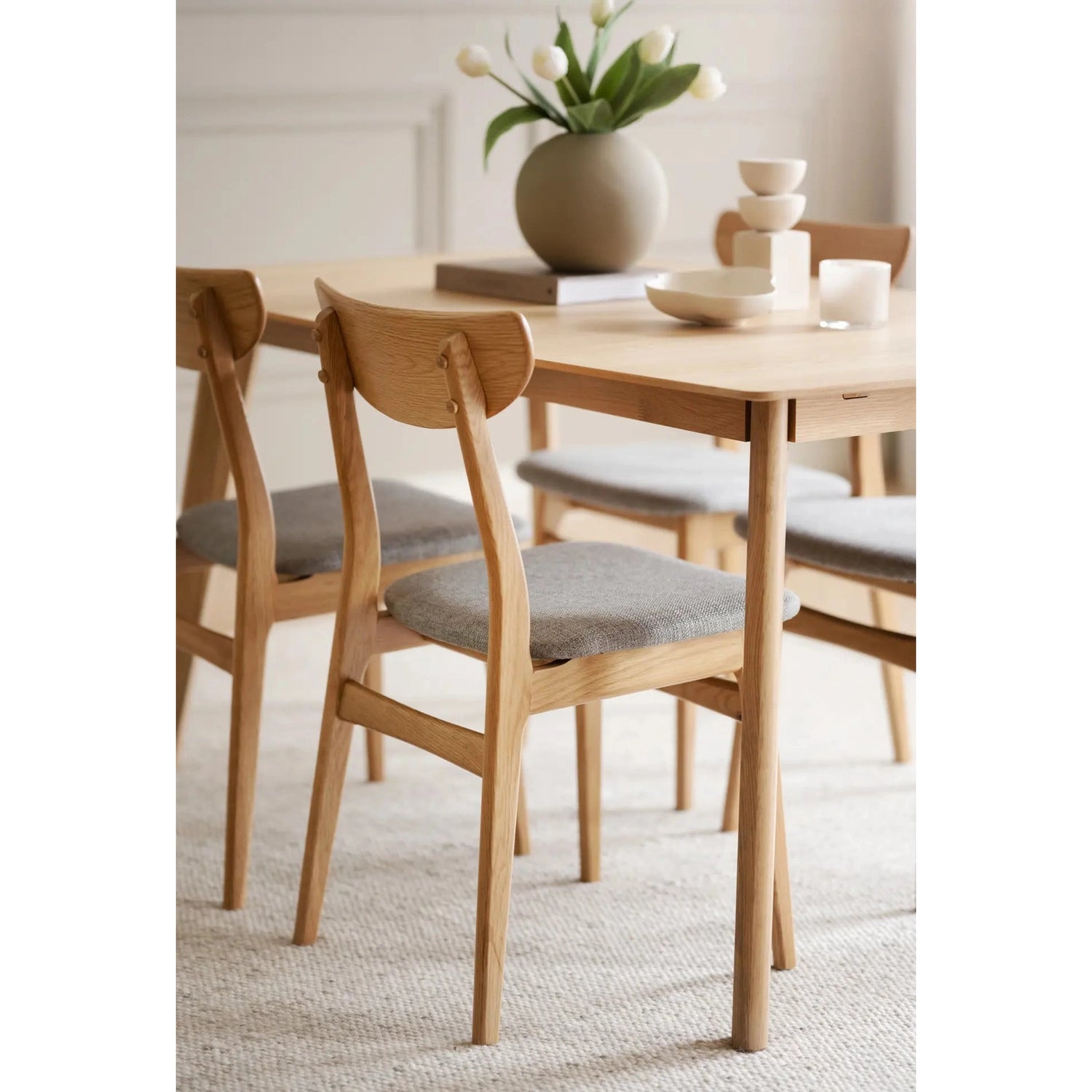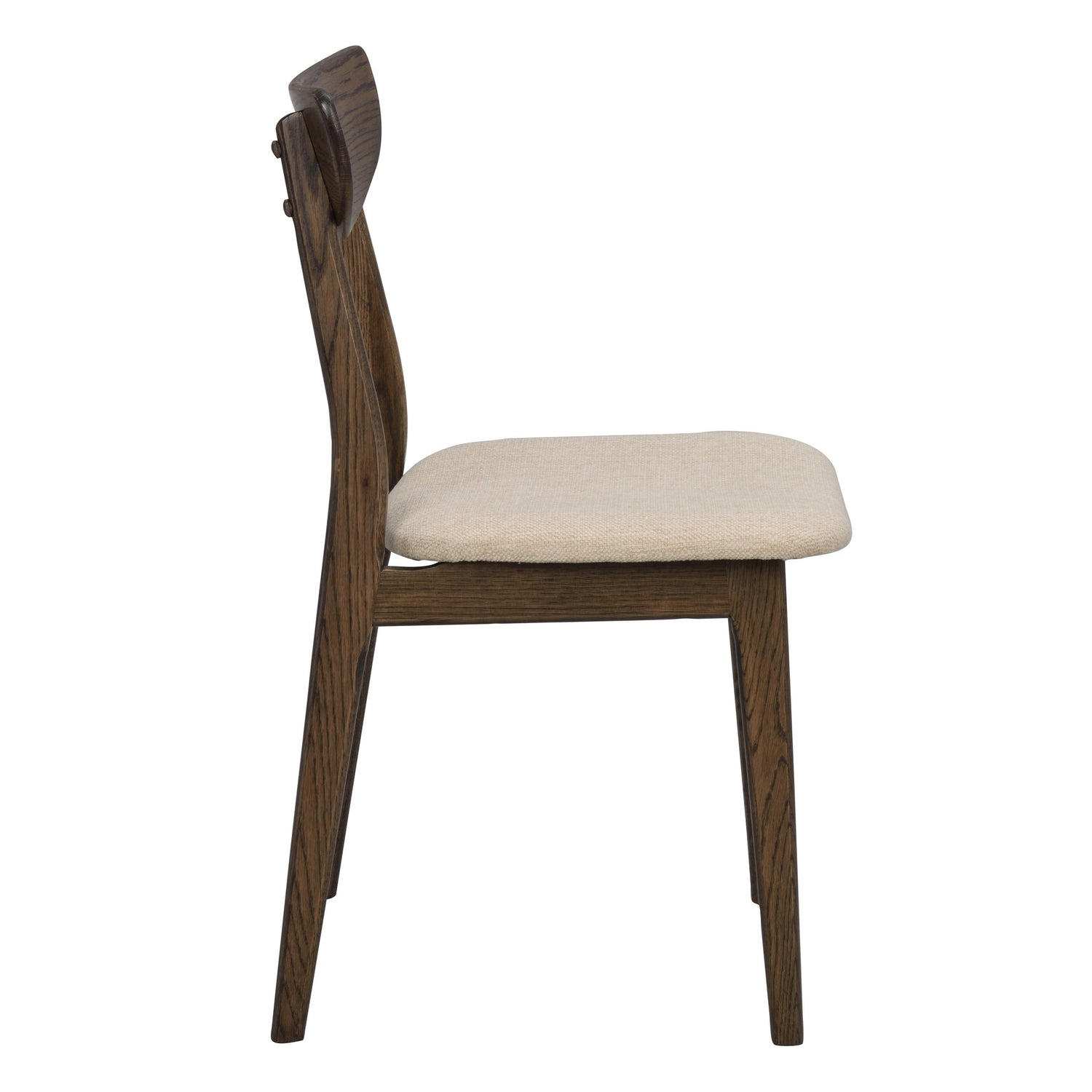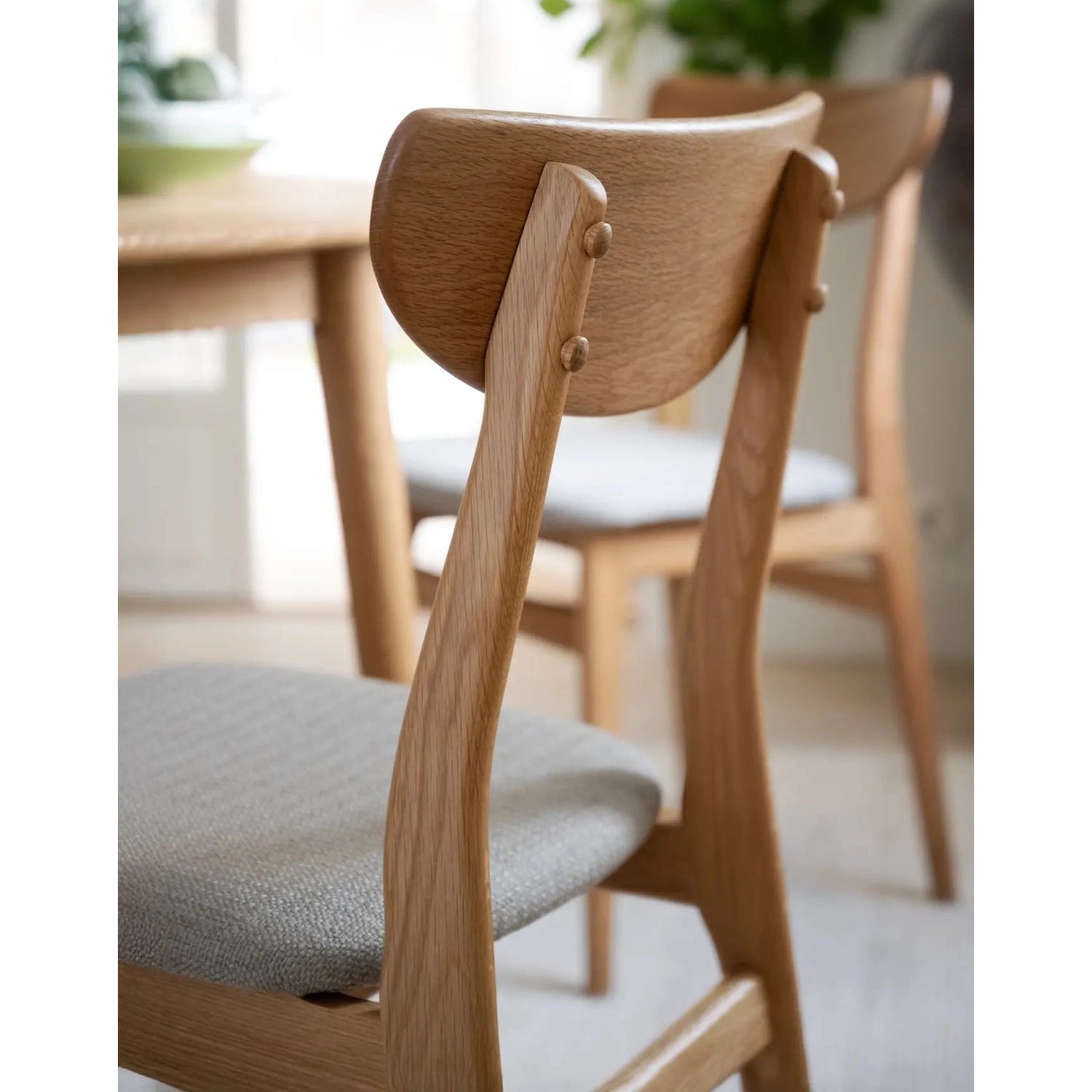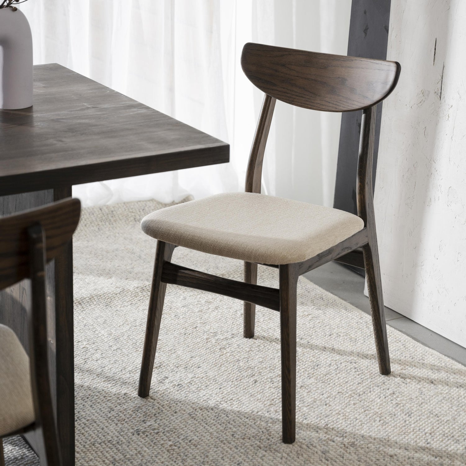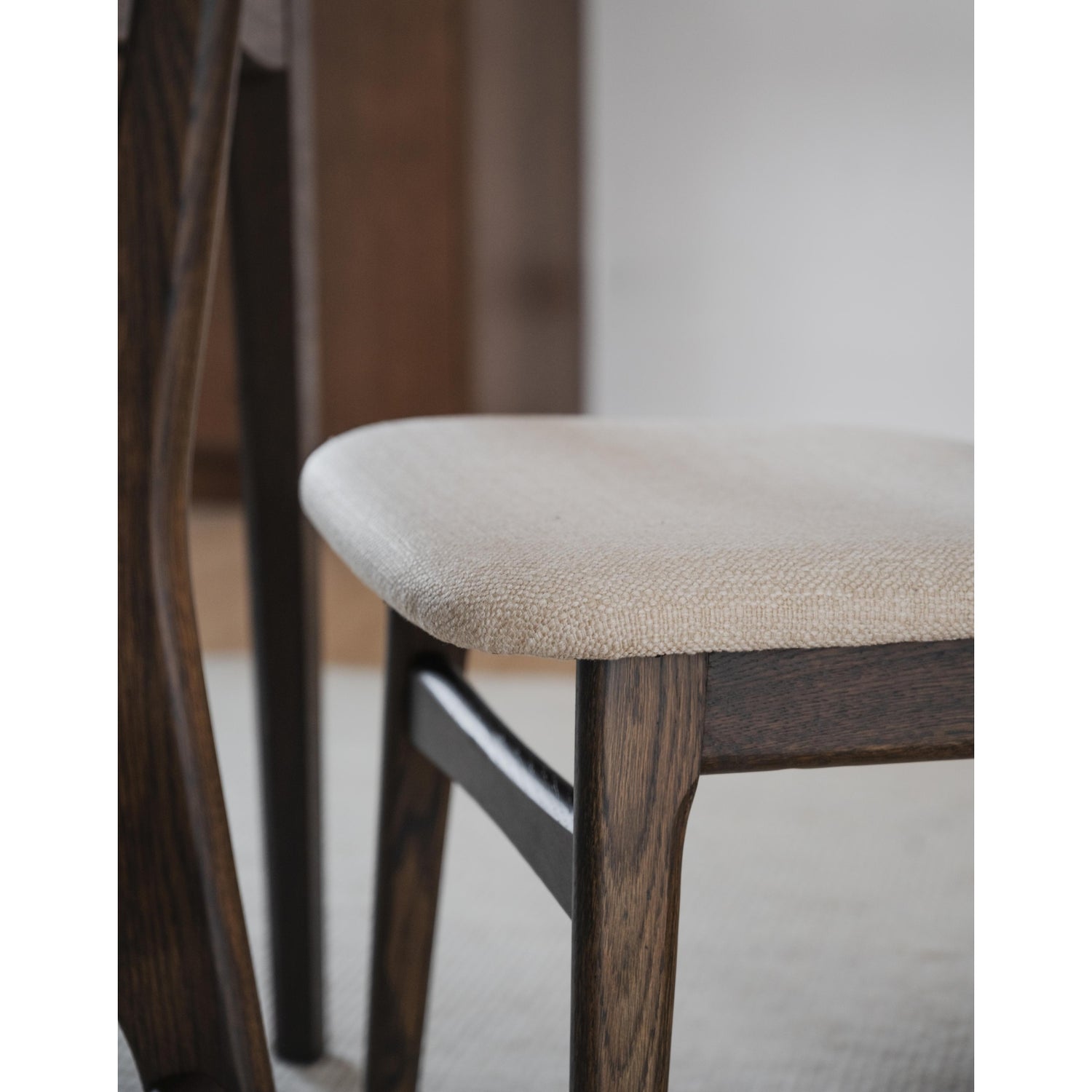 Rodham spisestol i brun eik med beige sete er en stilren og tidløs stol som kombinerer moderne design med klassisk eleganse. Stolen er laget av solid eik i både ramme og ryggstøtte, noe som gir høy kvalitet og lang holdbarhet. Det polstrede setet er kledd i et elegant stoff som gir god sittekomfort og et eksklusivt uttrykk. Rodham spisestol finnes i flere naturlige farger og passer perfekt sammen med spisebord som Tyler, Gardner Emmet og flere.