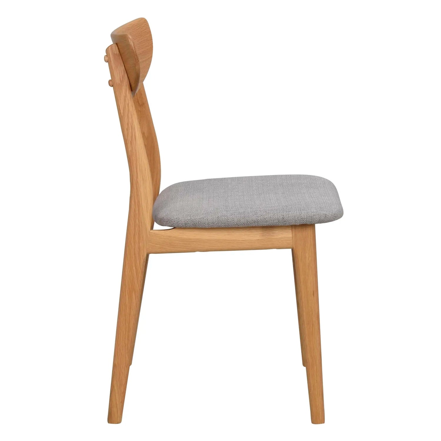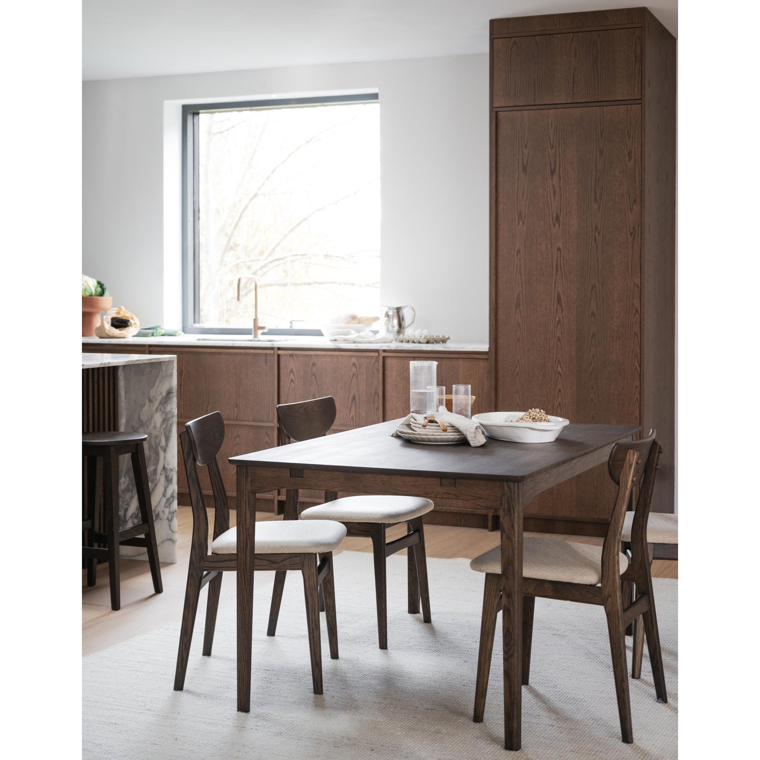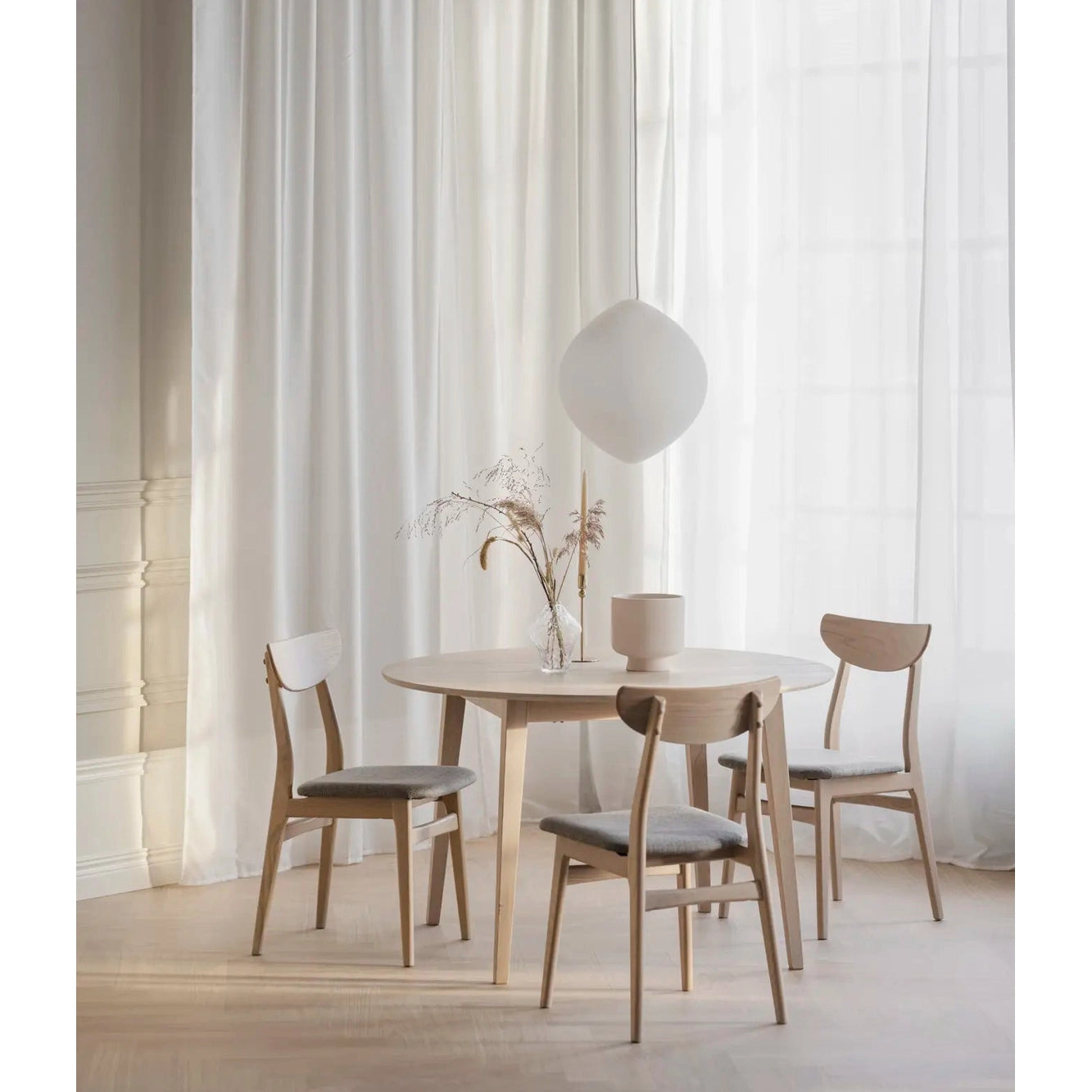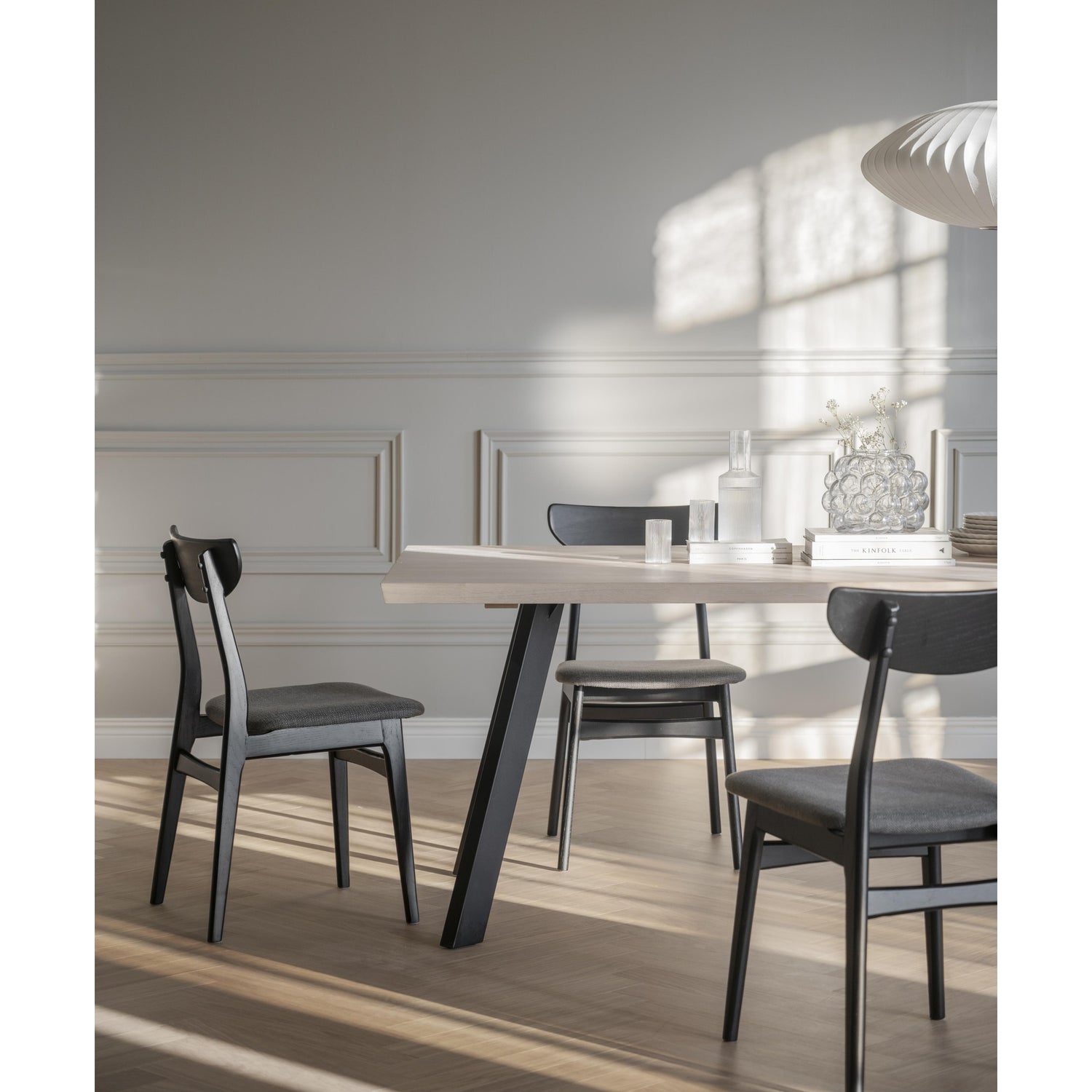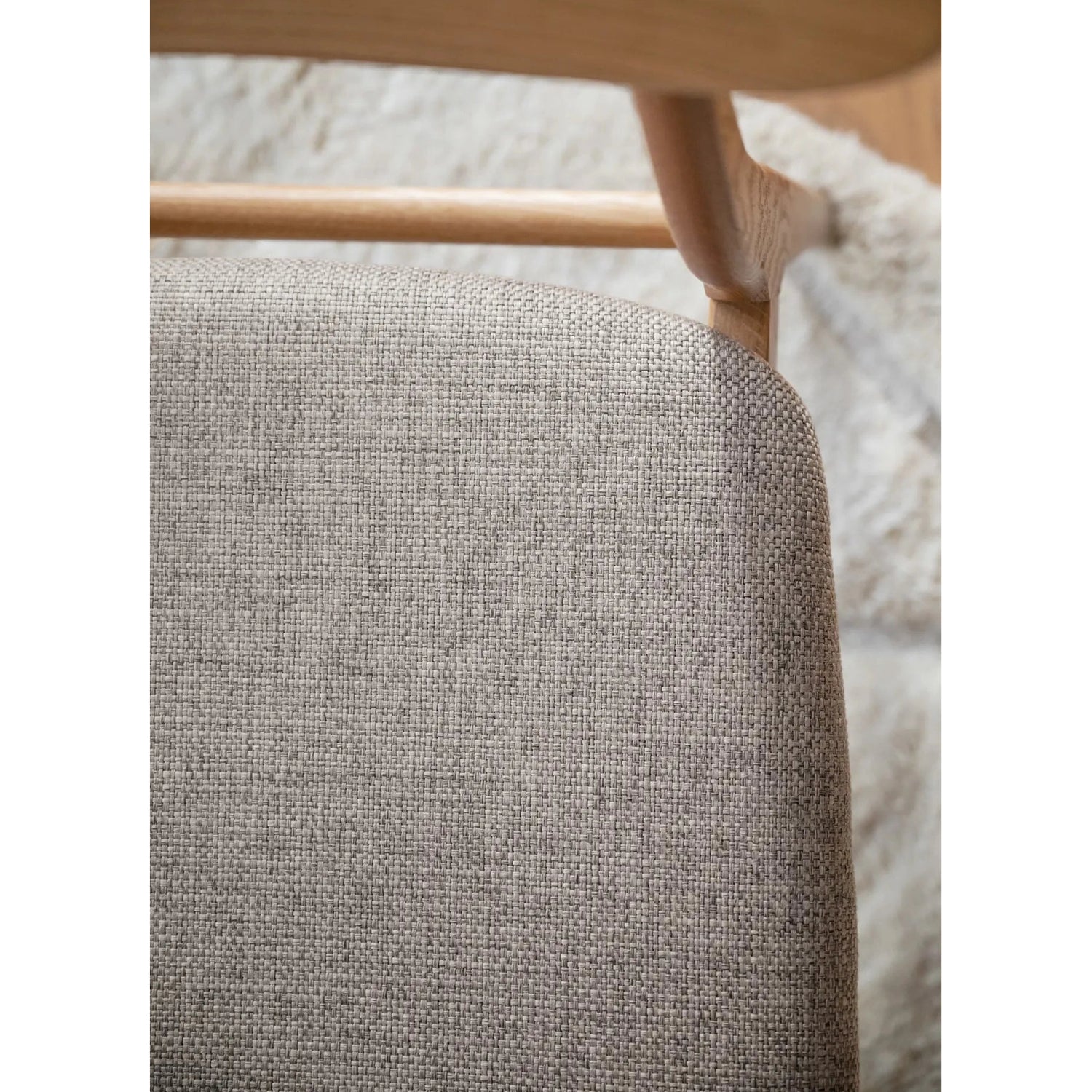 Rodham spisestol i brun eik med beige sete er en stilren og tidløs stol som kombinerer moderne design med klassisk eleganse. Stolen er laget av solid eik i både ramme og ryggstøtte, noe som gir høy kvalitet og lang holdbarhet. Det polstrede setet er kledd i et elegant stoff som gir god sittekomfort og et eksklusivt uttrykk. Rodham spisestol finnes i flere naturlige farger og passer perfekt sammen med spisebord som Tyler, Gardner Emmet og flere.