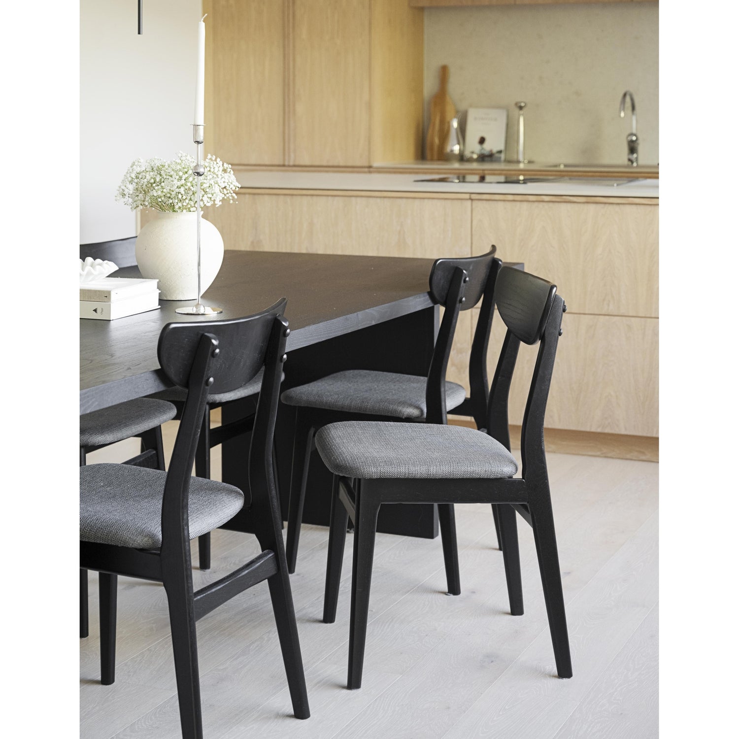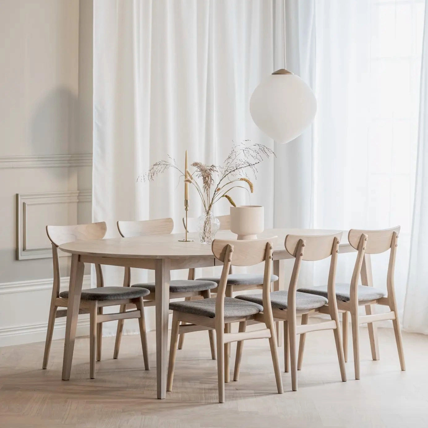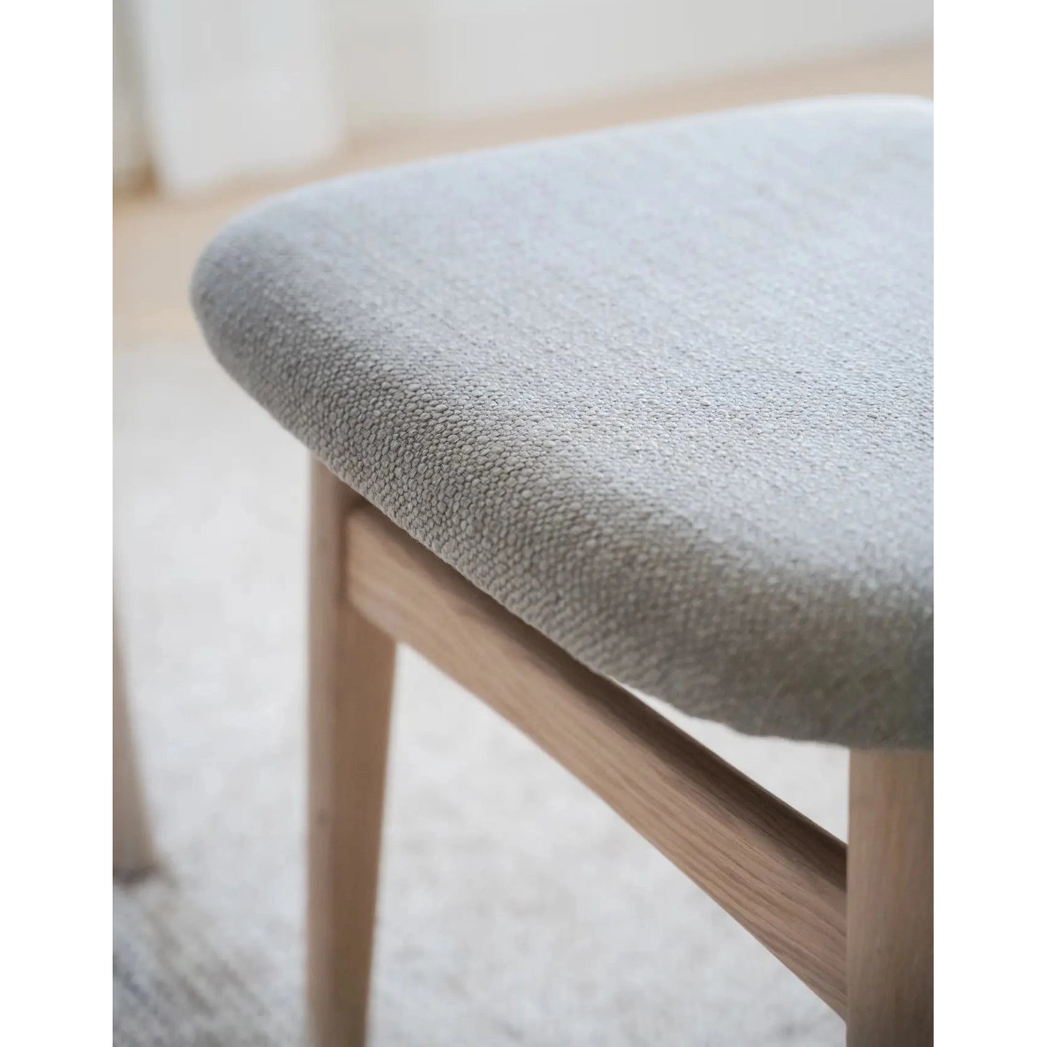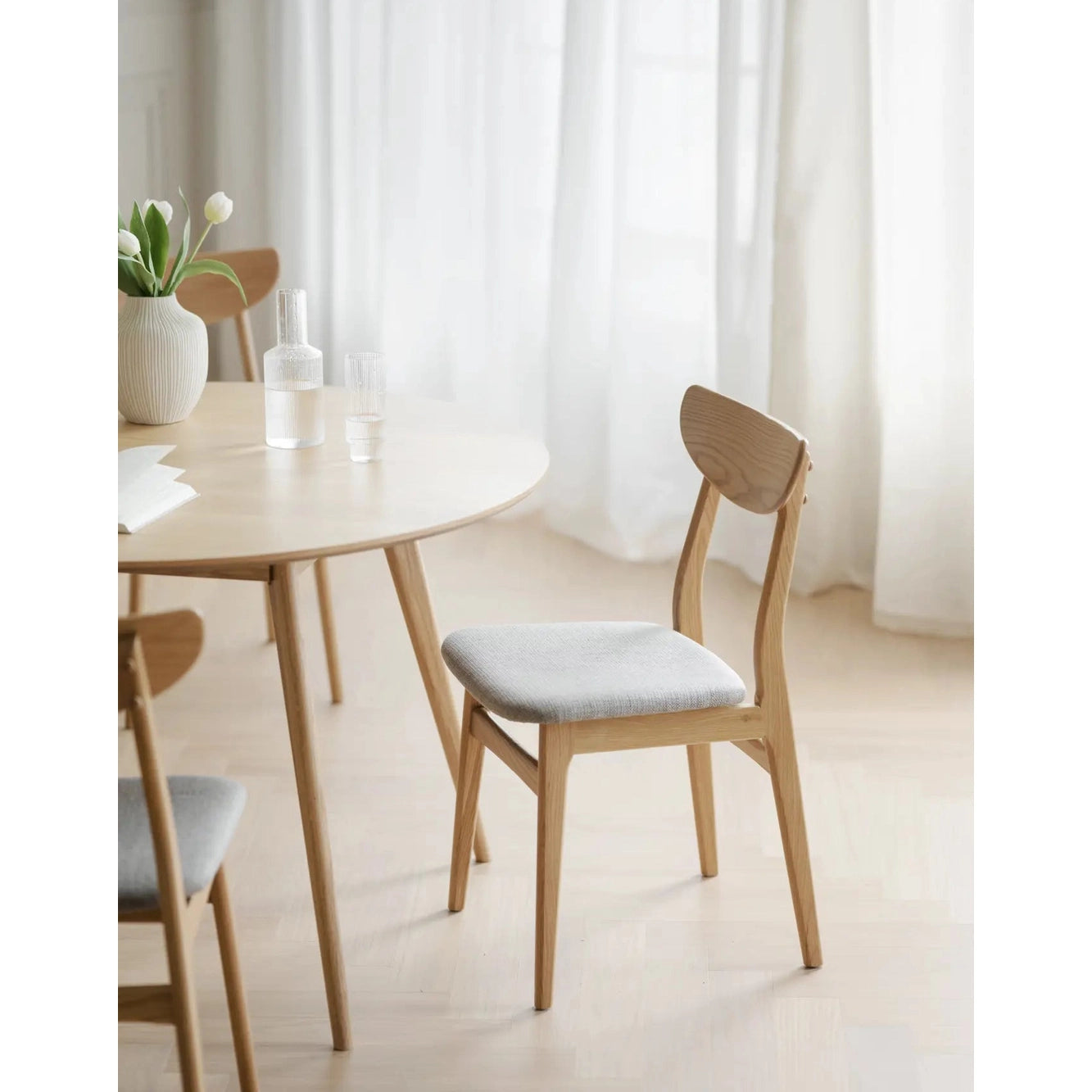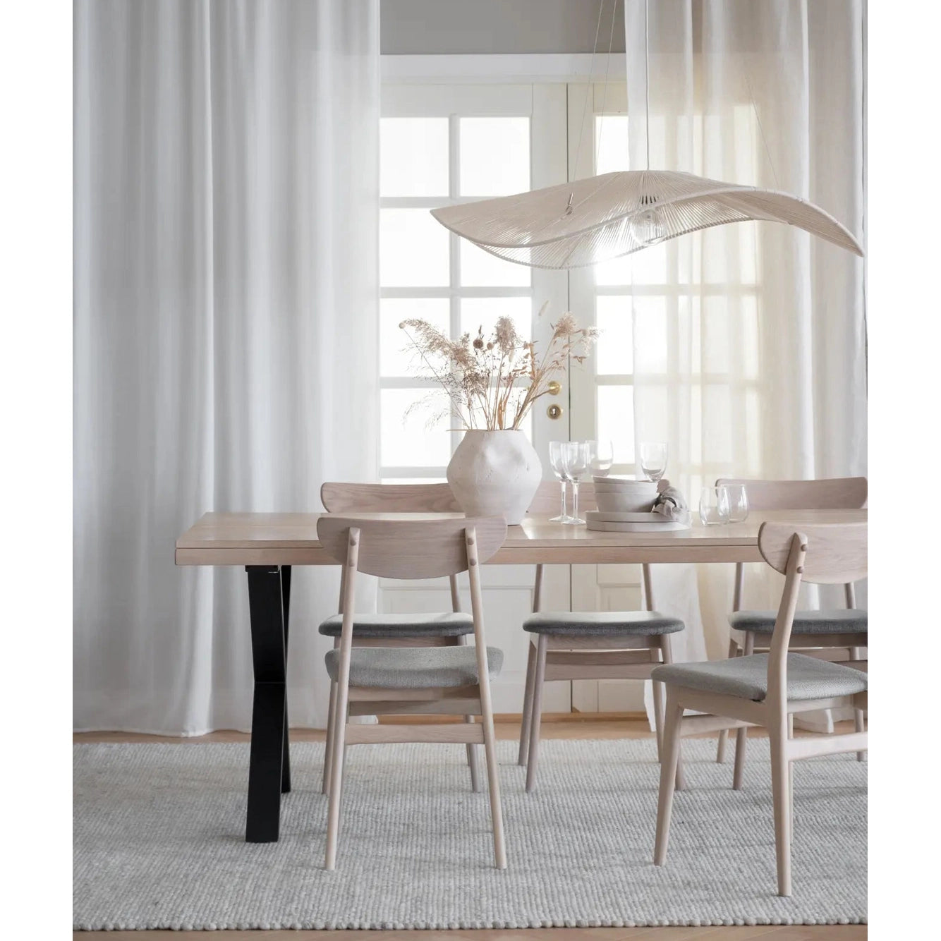 Rodham spisestol i brun eik med beige sete er en stilren og tidløs stol som kombinerer moderne design med klassisk eleganse. Stolen er laget av solid eik i både ramme og ryggstøtte, noe som gir høy kvalitet og lang holdbarhet. Det polstrede setet er kledd i et elegant stoff som gir god sittekomfort og et eksklusivt uttrykk. Rodham spisestol finnes i flere naturlige farger og passer perfekt sammen med spisebord som Tyler, Gardner Emmet og flere.
