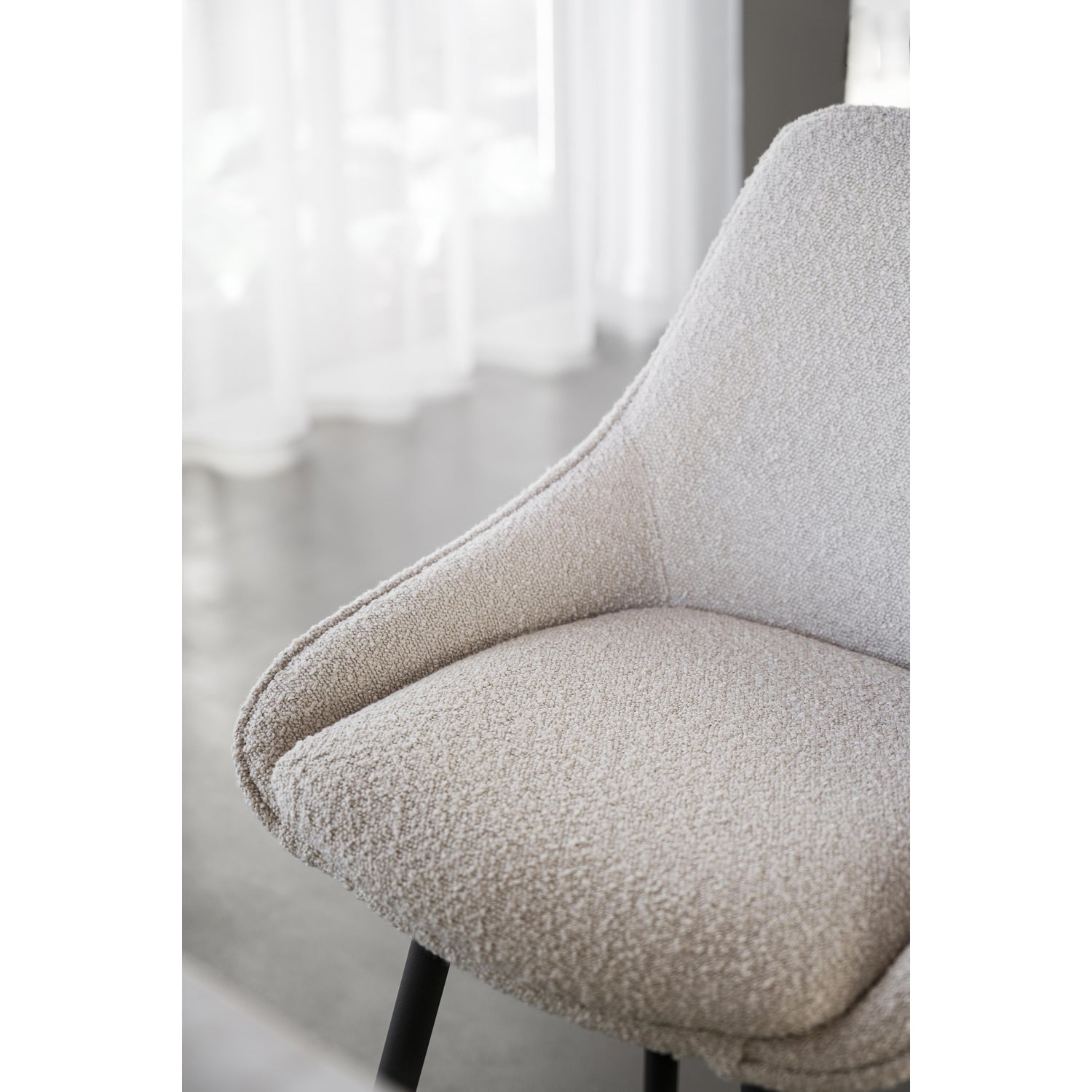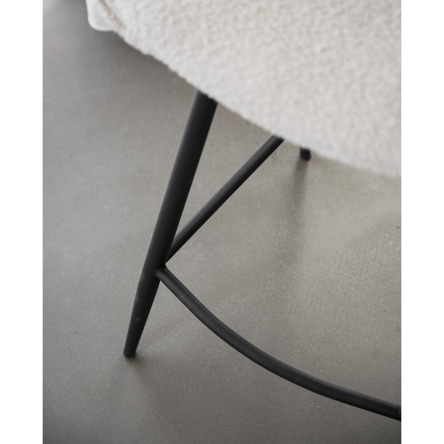 Materiale: Ramme i metall, med FSC-sertifisert kryssfiner. Sete i bouclé-stoff, ben i svart pulverlakkert metall.