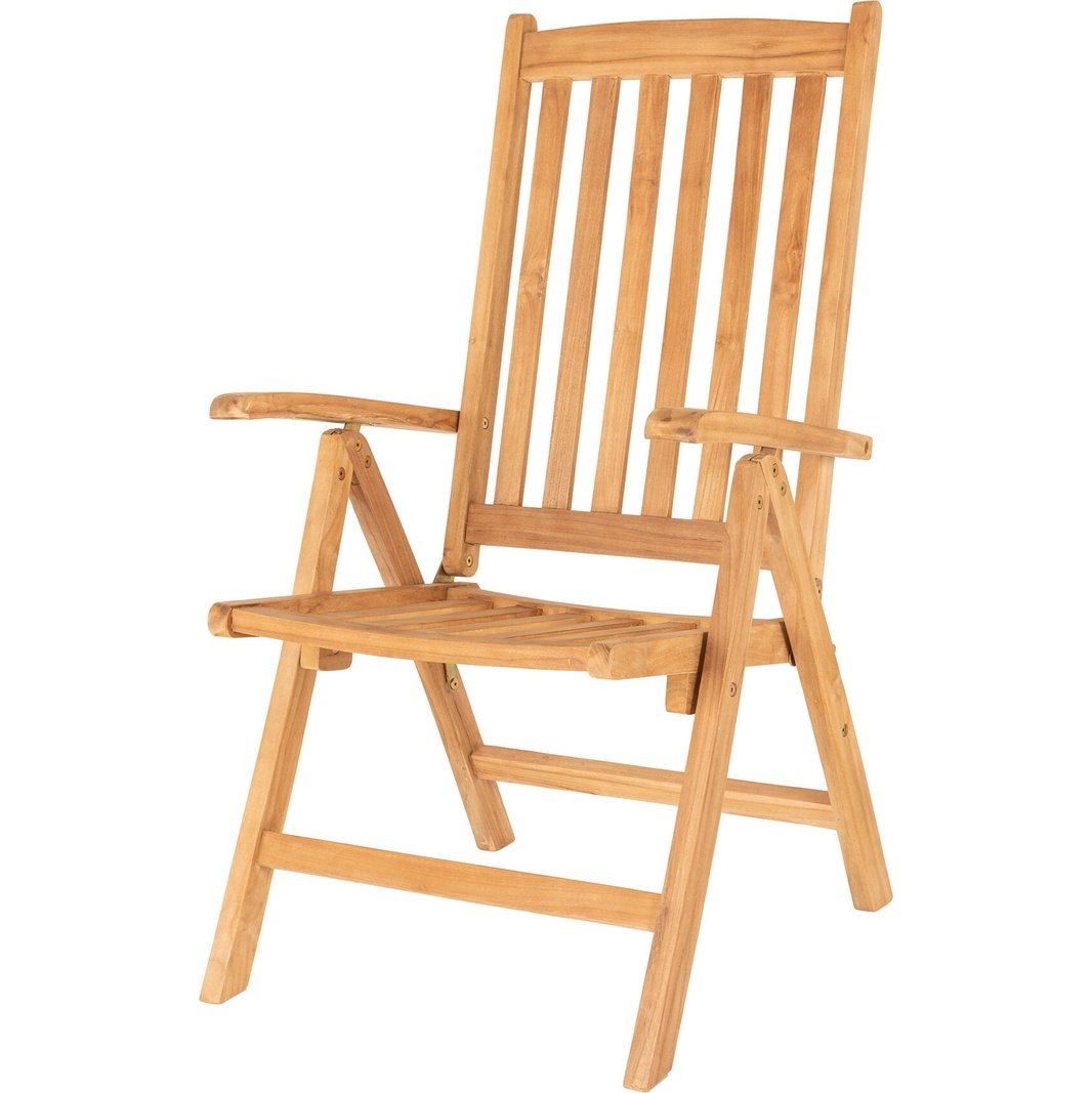 Sammenleggbar posisjonsstol i teak. Klassisk og komfortabel, ypperlig som spisestol. Teaken er sertifisert og kommer fra godkjente produsenter.