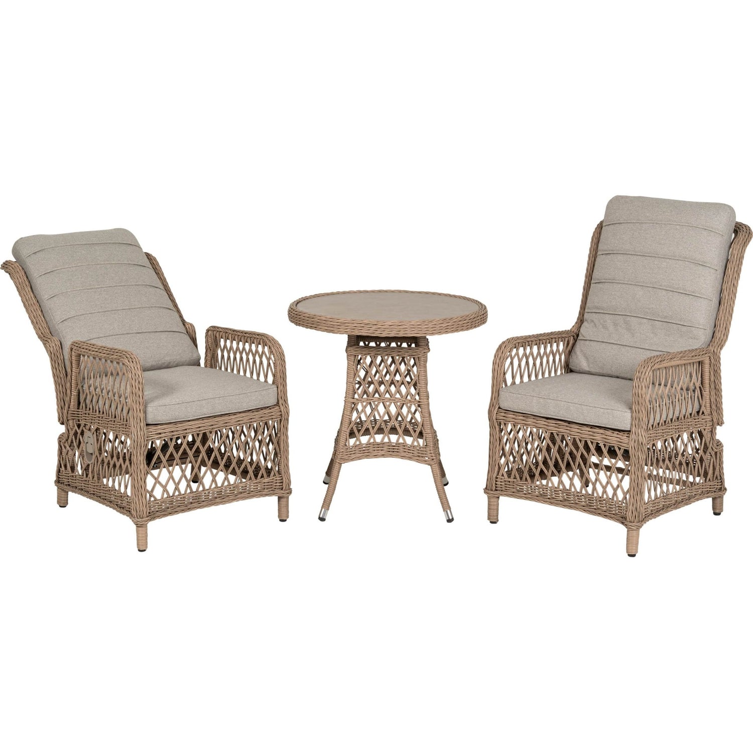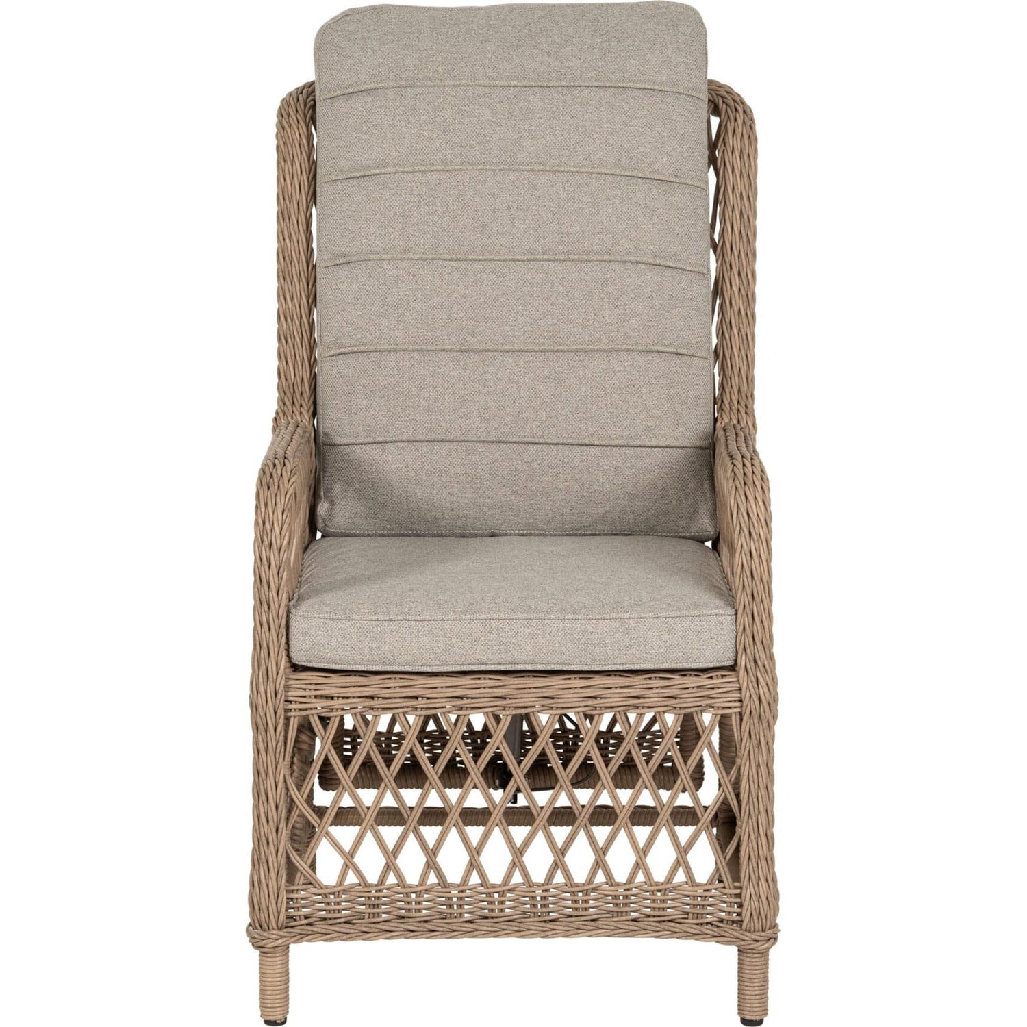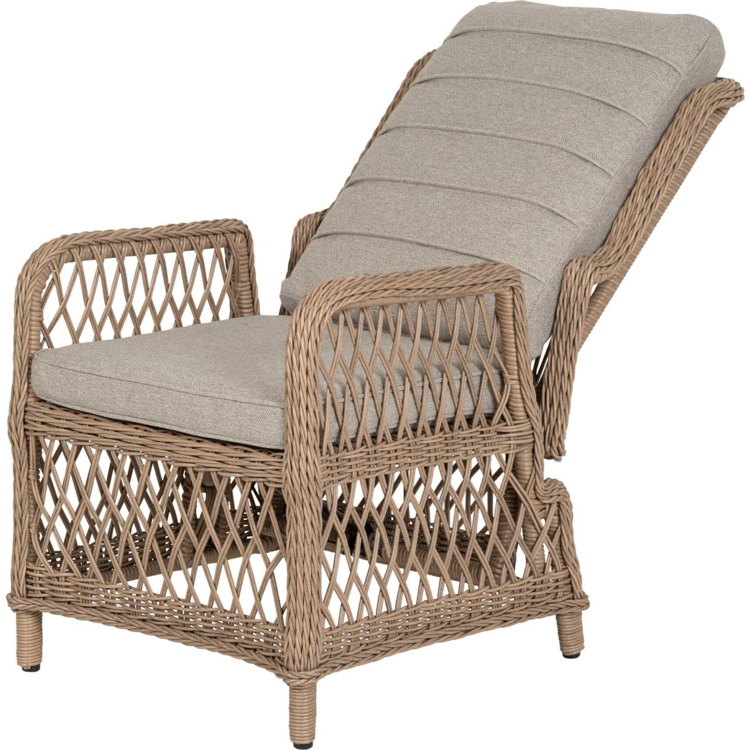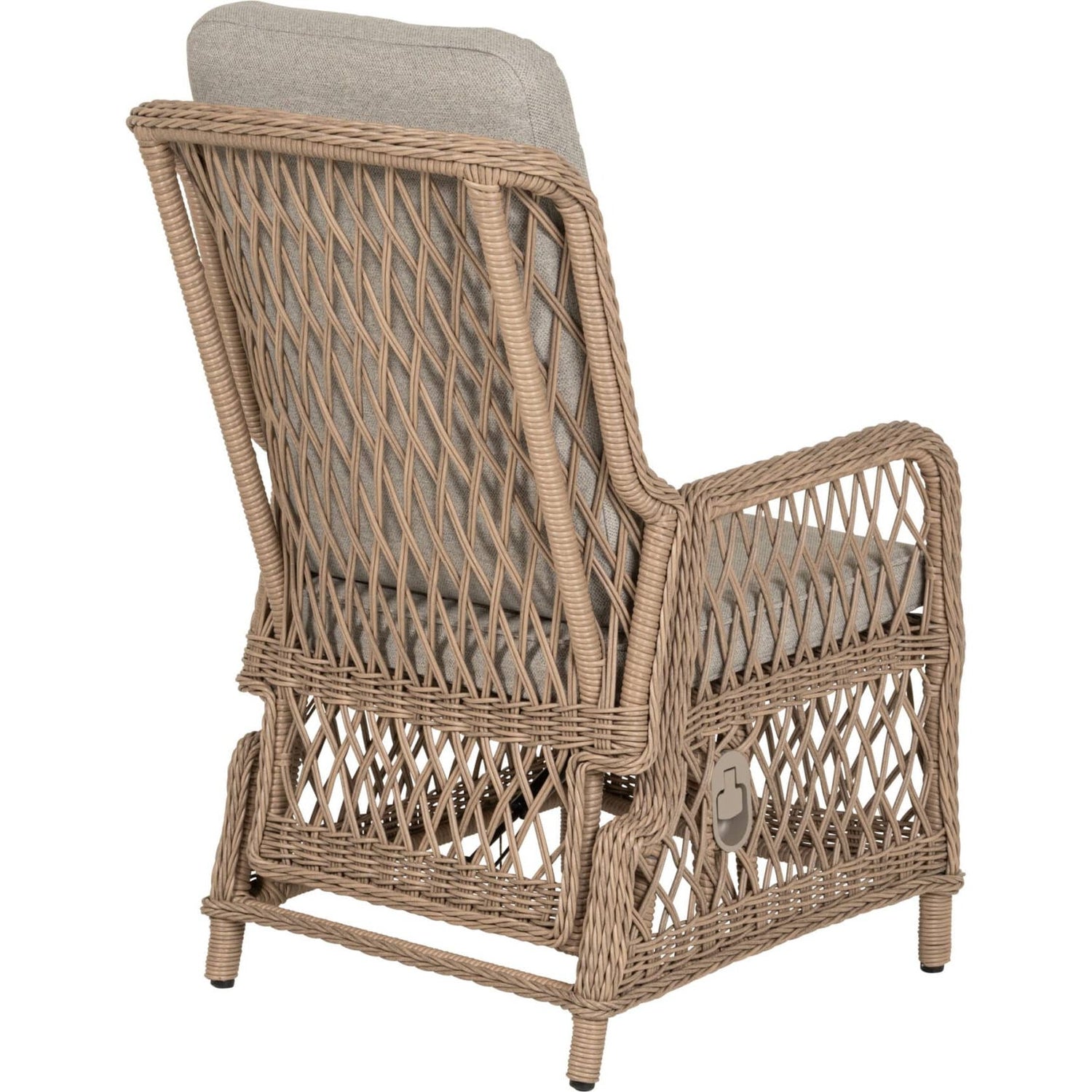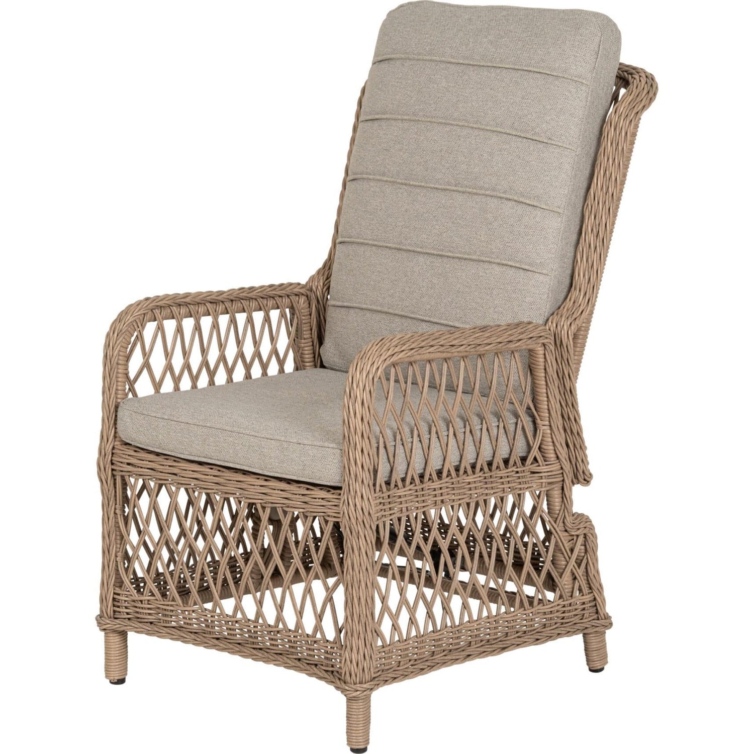 Spisestol i rund/halvrund naturfarget flett. Trinnløs regulerbar rygg.