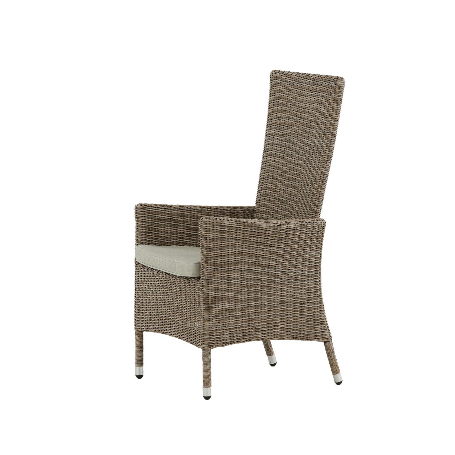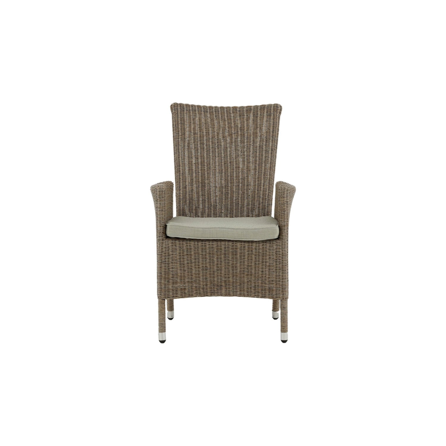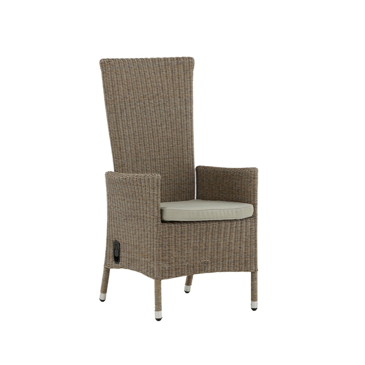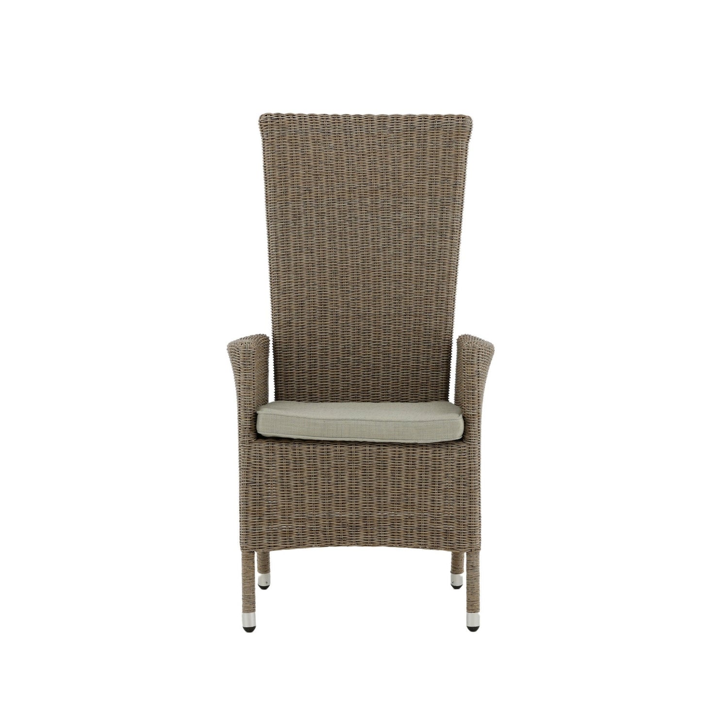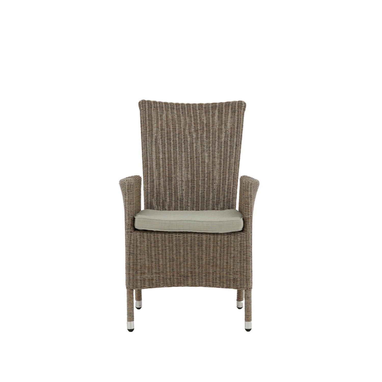 Toscana er en klassisk lys beige lenestol med en litt høyere foldbar ryggdel. En ramme i aluminium og kunstrotting, to holdbare materialer som gir deg en holdbar spisestol som står over tid. Sitt komfortabelt og luksuriøst rundt spisebordet denne sommeren og nyt hyggelige måltider utendørs.