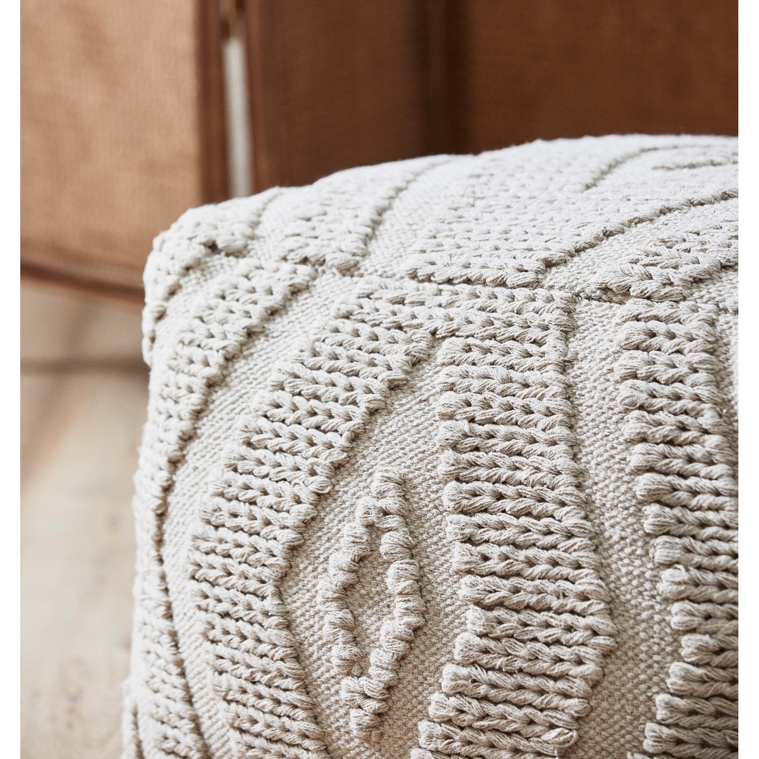 WULAR puf med et dekorativt tone-i-tone mønster. En puf som på én og samme tid er både praktisk og pen. WULAR er en solid og robust puf, som kan brukes som en ekstra sitteplass for gjester, eller anrettes med en brett med lys på toppen, noe som vil skape en koselig intim atmosfære. Et varmt preg til innredningen, som kan styles på flere måter.